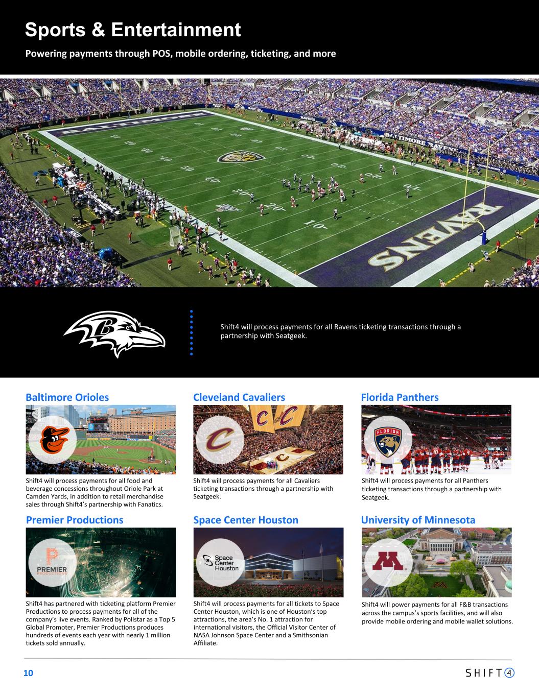 10 Sports & Entertainment Powering payments through POS, mobile ordering, ticketing, and more Shift4 will process payments for all Cavaliers ticketing transactions through a partnership with Seatgeek. Cleveland Cavaliers Shift4 will process payments for all tickets to Space Center Houston, which is one of Houston’s top attractions, the area’s No. 1 attraction for international visitors, the Official Visitor Center of NASA Johnson Space Center and a Smithsonian Affiliate. Space Center HoustonPremier Productions Shift4 has partnered with ticketing platform Premier Productions to process payments for all of the company’s live events. Ranked by Pollstar as a Top 5 Global Promoter, Premier Productions produces hundreds of events each year with nearly 1 million tickets sold annually. Shift4 will process payments for all food and beverage concessions throughout Oriole Park at Camden Yards, in addition to retail merchandise sales through Shift4’s partnership with Fanatics. Baltimore Orioles Shift4 will process payments for all Ravens ticketing transactions through a partnership with Seatgeek. Florida Panthers University of Minnesota Shift4 will process payments for all Panthers ticketing transactions through a partnership with Seatgeek. Shift4 will power payments for all F&B transactions across the campus’s sports facilities, and will also provide mobile ordering and mobile wallet solutions.