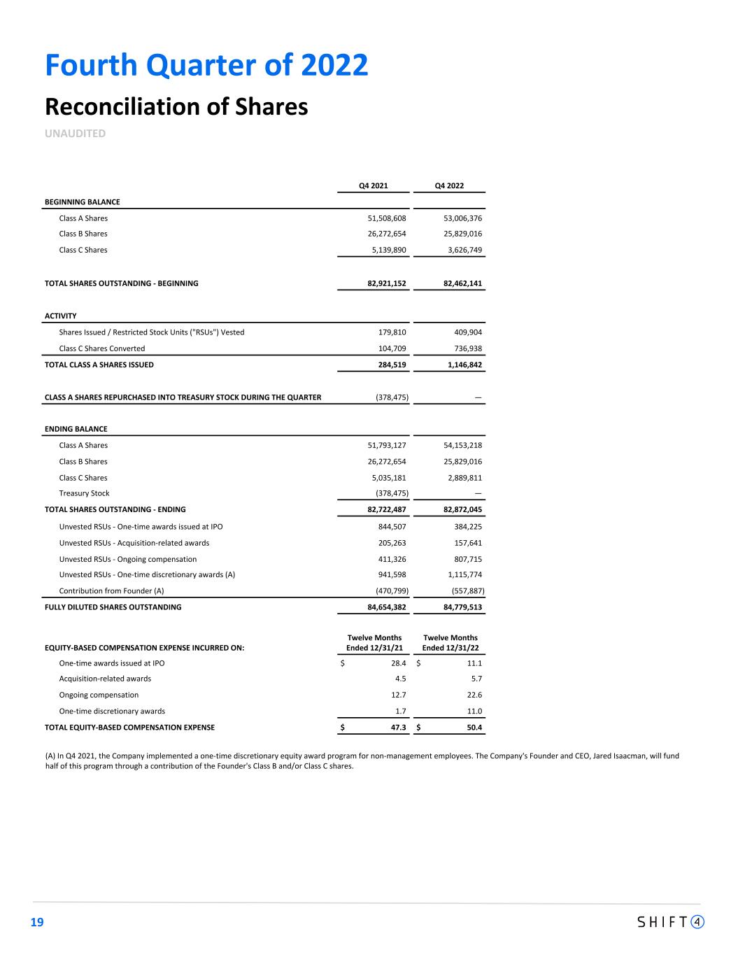 Fourth Quarter of 2022 19 Reconciliation of Shares UNAUDITED Q4 2021 Q4 2022 BEGINNING BALANCE Class A Shares 51,508,608 53,006,376 Class B Shares 26,272,654 25,829,016 Class C Shares 5,139,890 3,626,749 TOTAL SHARES OUTSTANDING - BEGINNING 82,921,152 82,462,141 ACTIVITY Shares Issued / Restricted Stock Units ("RSUs") Vested 179,810 409,904 Class C Shares Converted 104,709 736,938 TOTAL CLASS A SHARES ISSUED 284,519 1,146,842 CLASS A SHARES REPURCHASED INTO TREASURY STOCK DURING THE QUARTER (378,475) — ENDING BALANCE Class A Shares 51,793,127 54,153,218 Class B Shares 26,272,654 25,829,016 Class C Shares 5,035,181 2,889,811 Treasury Stock (378,475) — TOTAL SHARES OUTSTANDING - ENDING 82,722,487 82,872,045 Unvested RSUs - One-time awards issued at IPO 844,507 384,225 Unvested RSUs - Acquisition-related awards 205,263 157,641 Unvested RSUs - Ongoing compensation 411,326 807,715 Unvested RSUs - One-time discretionary awards (A) 941,598 1,115,774 Contribution from Founder (A) (470,799) (557,887) FULLY DILUTED SHARES OUTSTANDING 84,654,382 84,779,513 EQUITY-BASED COMPENSATION EXPENSE INCURRED ON: Twelve Months Ended 12/31/21 Twelve Months Ended 12/31/22 One-time awards issued at IPO $ 28.4 $ 11.1 Acquisition-related awards 4.5 5.7 Ongoing compensation 12.7 22.6 One-time discretionary awards 1.7 11.0 TOTAL EQUITY-BASED COMPENSATION EXPENSE $ 47.3 $ 50.4 (A) In Q4 2021, the Company implemented a one-time discretionary equity award program for non-management employees. The Company's Founder and CEO, Jared Isaacman, will fund half of this program through a contribution of the Founder's Class B and/or Class C shares.