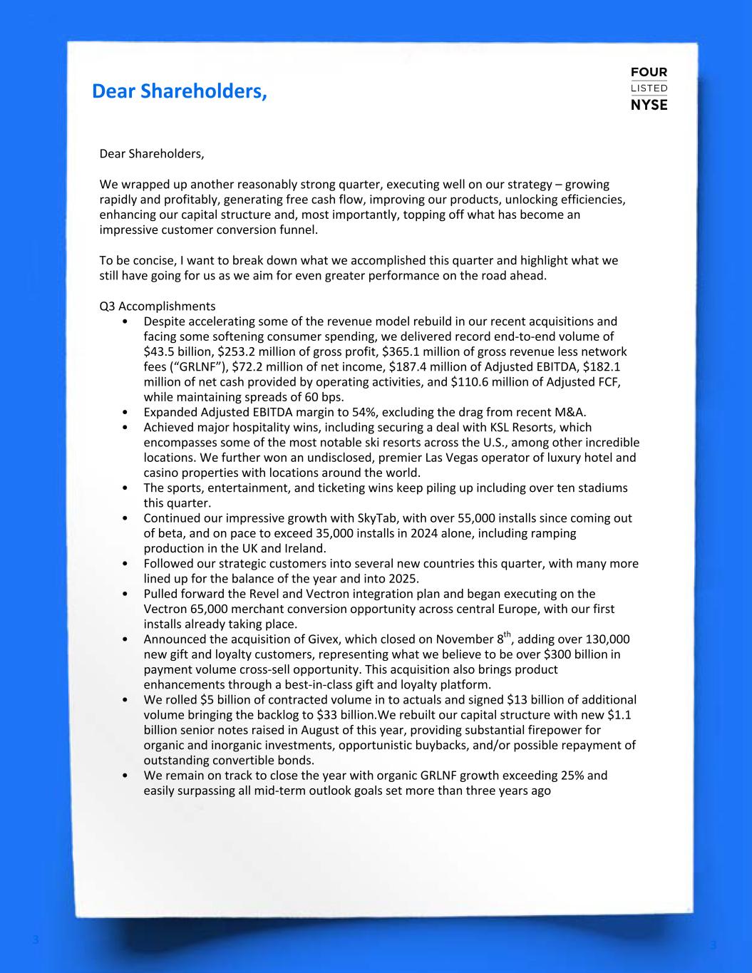 We wrapped up another reasonably strong quarter, executing well on our strategy – growing rapidly and profitably, generating free cash flow, improving our products, unlocking efficiencies, enhancing our capital structure and, most importantly, topping off what has become an impressive customer conversion funnel. To be concise, I want to break down what we accomplished this quarter and highlight what we still have going for us as we aim for even greater performance on the road ahead. Q3 Accomplishments • Despite accelerating some of the revenue model rebuild in our recent acquisitions and facing some softening consumer spending, we delivered record Volume of 43.5 Billion, $365 million of GRLNF, $187 million of EBITDA, $111 million of FCF, while maintaining spreads of 60bps. • Adjusted net leverage was____ and we rebuilt our capital structure with new ____ providing substantial firepower for organic and inorganic investments as well as opportunistic buybacks. • Expanded margins to 54% excluding recent M&A drag. • Achieved major hospitality wins, including securing deals with [Wynn Resorts and] KSL Resorts, which encompasses 40 iconic properties like Blue Mountain, Camelback, Deer Valley, and all the Hawaiian Outrigger brands. [We further won Alterra ___ ] • The sports, entertainment, and ticketing wins keep piling up including _______ stadiums. • Grew Skytab system installations quarter-over-quarter _______, including ramping production in the UK and Ireland. • Followed our strategic customers into ____ new countries with many more lined up for the balance of the year. • Pulled forward the Revel and Vectron integration plan and began executing on the Vectron 65,000 merchant conversion opportunity across central Europe, with our first installs already taking place. • Announced the acquisition of Givex, expected to close in Q4, adding over 120,000 new gift and loyalty customers, representing what we believe to be over $300 billion in payment volume cross-sell opportunity. This acquisition also brings product enhancements through a best-in-class gift and loyalty platform. • Increased contracted volume backlog to $30B. • We remain on track to close the year with organic GRLNF exceeding 25% and easily surpassing all mid-term outlook goals set more than three years ago. Dear Shareholders, 3 3 Jared Isaacman CEO jared@shift4.com Dear Shareholders, We wrapped up another reasonably strong quarter, executing well on our strategy – growing rapidly and profitably, generating free cash flow, improving our products, unlocking efficiencies, enhancing our capital structure and, most importantly, topping off what has become an impressive customer conversion funnel. To be concise, I want to break down what we accomplished this quarter and highlight what we still have going for us as we aim for even greater performance on the road ahead. Q3 Accomplishments • Despite accelerating some of the revenue model rebuild in our recent acquisitions and facing some softening co sumer spending, we elivered record end-to-en v l e of $43.5 billion, $253.2 illion of gross profit, $365.1 million of gross revenue less network fees (“GRLNF”), $72.2 million of net income, $187.4 million of Adjusted EBITDA, $182.1 million of net cash provided by operating activities, and $110.6 million of Adjusted FCF, while maintaining spreads of 60 bps. • Expanded Adjusted EBITDA margin to 54%, excluding the drag from recent M&A. • Achieved major hospitality wins, including securing a deal with KSL Resorts, which encompasses some of the most notable ski resorts across the U.S., among other incredible locations. We further won an undisclosed, premier Las Vegas operator of luxury hotel and casino pr perties with locations around the world. • The sports, entertainment, and ticketing wins keep piling up including over ten stadiums this quarter. • Continued our impressive growth with SkyTab, with over 55,000 installs since coming out of beta, and on pace to exceed 35,000 installs in 2024 alone, including ramping production in the UK and Ireland. • Followed our strategic customers into several new countries this quarter, with many more lined up for the balance of the year and into 2025. • Pulled forward the Revel and Vectron integration plan and began executing on the Vectron 65,000 merchant conversion opportunity across central Europe, with our first installs already taking place. • Announced the acquisition of Givex, which closed on November 8th, adding over 130,000 new gift and loyalty customers, representing what we believe to be over $300 billion in payment volume cross-sell pp rtunity. This a quisi ion al o brings pro uct e hanceme ts through a best-in-class gift and loyalty platform. • We r lled $5 billio of contracted volume in t actuals and signed $13 billion of additional volume bringing the backlog to $33 billion.We rebuilt our capital structure with new $1.1 billion senior notes raised in August of this year, providing substantial firepower for organic and inorganic investments, opportunistic buybacks, and/or possible repayment of outstanding convertible bonds. • We remain on track to close the year with organic GRLNF growth exceeding 25% and easily surpassing all mid-term outlook goals set more than three years ago