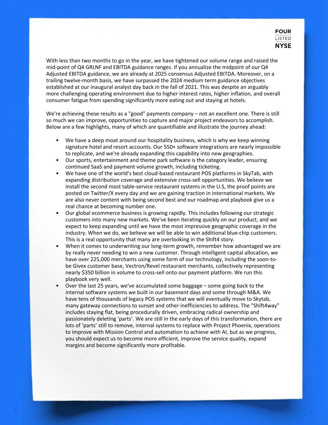 4 4 With less than two months to go in the year, we have tightened our volume range and raised the mid-point of Q4 GRLNF and EBITDA guidance ranges. If you annualize the midpoint of our Q4 Adjusted EBITDA guidance, we are already at 2025 consensus Adjusted EBITDA. Moreover, on a trailing twelve-month basis, we have surpassed the 2024 medium term guidance objectives established at our inaugural analyst day back in the fall of 2021. This was despite an arguably more challenging operating environment due to higher interest rates, higher inflation, and overall consumer fatigue from spending significantly more eating out and staying at hotels. We're achieving these results as a "good" payments company – not an excellent one. There is still so much we can improve, opportunities to capture and major project endeavors to accomplish. Below are a few highlights, many of which are quantifiable and illustrate the journey ahead: • We have a deep moat around our hospitality business, which is why we keep winning signature hotel and resort accounts. Our 550+ software integrations are nearly impossible to replicate, and we're already expanding this capability into new geographies. • Our sports, entertainment and theme park software is the category leader, ensuring continued SaaS and payment volume growth, including ticketing. • We have one of the world’s best cloud-based restaurant POS platforms in SkyTab, with expanding distribution coverage and extensive cross-sell opportunities. We believe we install the second most table-service restaurant systems in the U.S, the proof points are posted on Twitter/X every day and we are gaining traction in international markets. We are also never content with being second best and our roadmap and playbook give us a real chance at becoming number one. • Our global ecommerce business is growing rapidly. This includes following our strategic customers into many new markets. We've been iterating quickly on our product, and we expect to keep expanding until we have the most impressive geographic coverage in the industry. When we do, we believe we will be able to win additional blue-chip customers. This is a real opportunity that many are overlooking in the Shift4 story. • When it comes to underwriting our long-term growth, remember how advantaged we are by really never needing to win a new customer. Through intelligent capital allocation, we have over 225,000 merchants using some form of our technology, including the soon-to- be Givex customer base, Vectron/Revel restaurant merchants, collectively representing nearly $350 billion in volume to cross-sell onto our payment platform. We run this playbook very well. • Over the last 25 years, we've accumulated some baggage – some going back to the internal software systems we built in our basement days and some through M&A. We have tens of thousands of legacy POS systems that we will eventually move to Skytab, many gateway connections to sunset and other inefficiencies to address. The "Shift4way" includes staying flat, being procedurally driven, embracing radical ownership and passionately deleting ‘parts’. We are still in the early days of this transformation, there are lots of ‘parts’ still to remove, internal systems to replace with Project Phoenix, operations to improve with Mission Control and automation to achieve with AI, but as we progress, you should expect us to become more efficient, improve the service quality, expand margins and become significantly more profitable.