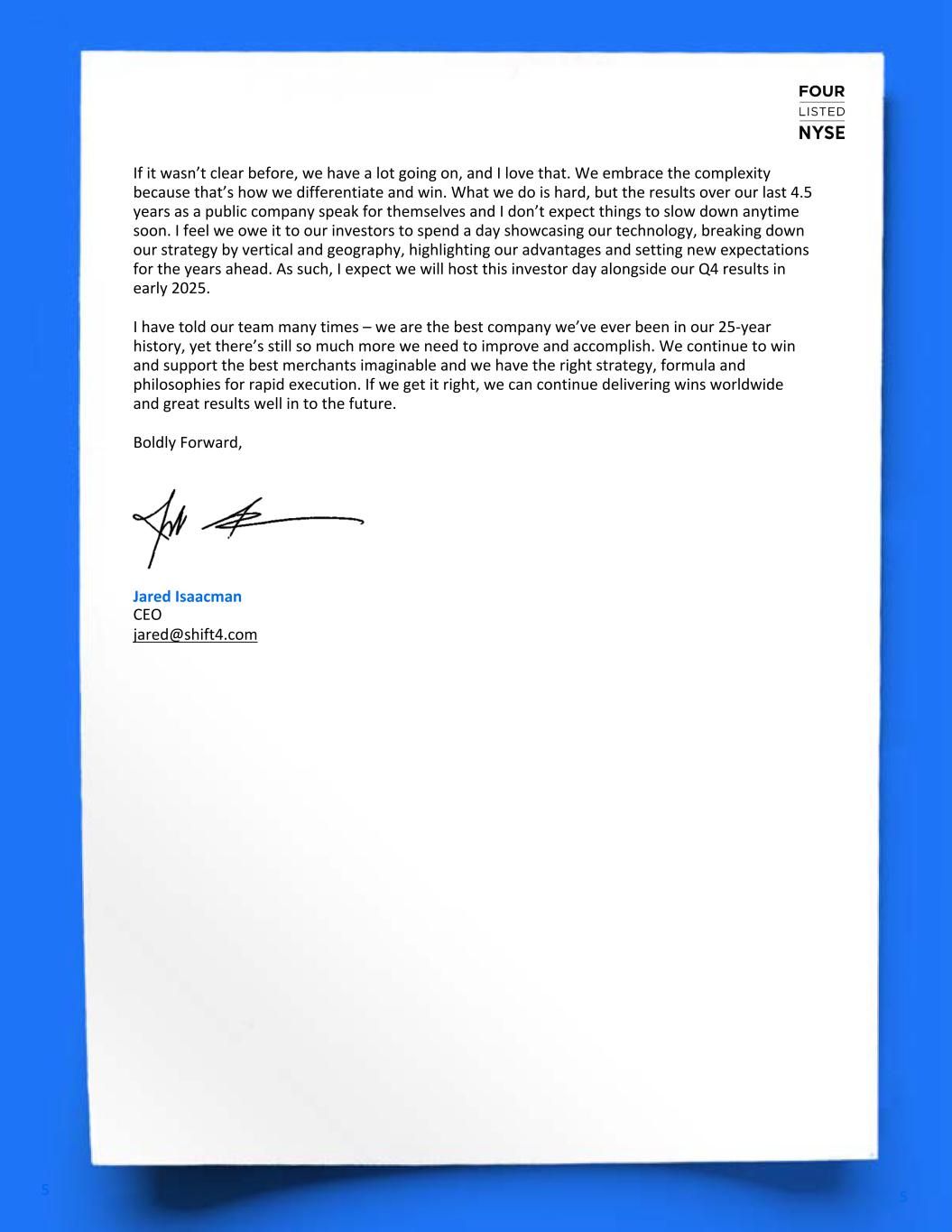 If it wasn’t clear before, we have a lot going on, and I love that. We embrace the complexity because that’s how we differentiate and win. What we do is hard, but the results over our last 4.5 years as a public company speak for themselves and I don’t expect things to slow down anytime soon. I feel we owe it to our investors to spend a day showcasing our technology, breaking down our strategy by vertical and geography, highlighting our advantages and setting new expectations for the years ahead. As such, I expect we will host this investor day alongside our Q4 results in early 2025. I have told our team many times – we are the best company we’ve ever been in our 25-year history, yet there’s still so much more we need to improve and accomplish. We continue to win and support the best merchants imaginable and we have the right strategy, formula and philosophies for rapid execution. If we get it right, we can continue delivering wins worldwide and great results well in to the future. Boldly Forward, Jared Isaacman CEO jared@shift4.com 5 5
