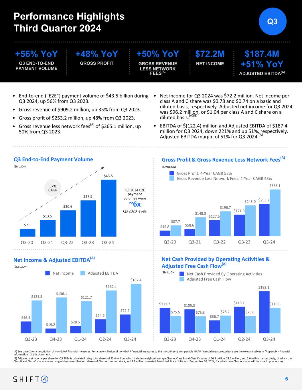 Non-GAAP Financial Measures and Key Performance Indicators Forward-Looking Statements We use supplemental measures of our performance which are derived from our consolidated financial information but which are not presented in our consolidated financial statements prepared in accordance with U.S. generally accepted accounting principles ("GAAP"). These non-GAAP financial measures include: gross revenue less network fees, which includes interchange and adjustment fees; adjusted net income; adjusted net income per share; free cash flow; Adjusted Free Cash Flow; earnings before interest expense, interest income, income taxes, depreciation, and amortization (“EBITDA”); Adjusted EBITDA; Adjusted EBITDA conversion rate; and Adjusted EBITDA margin. Gross revenue less network fees represents a key performance metric that management uses to measure changes in the mix and value derived from our customer base as we continue to execute our strategy to expand our reach to serve larger, complex merchants. Adjusted net income represents net income adjusted for certain non-cash and other nonrecurring items that management believes are not indicative of ongoing operations, such as acquisition, restructuring and integration costs, revaluation of contingent liabilities, impairment of intangible assets, unrealized gain (loss) on investments in securities, change in TRA liability, equity-based compensation expense, and foreign exchange and other nonrecurring items. Adjusted EBITDA is the primary financial performance measure used by management to evaluate its business and monitor results of operations. Adjusted EBITDA represents EBITDA further adjusted for certain non- cash and other nonrecurring items that management believes are not indicative of ongoing operations. These adjustments include acquisition, restructuring and integration costs, revaluation of contingent liabilities, impairment of intangible assets, unrealized gain (loss) on investments in securities, changes in TRA liability, equity-based compensation expense, and foreign exchange and other nonrecurring items. Free cash flow represents net cash provided by operating activities adjusted for non-discretionary capital expenditures. Adjusted EBITDA Margin represents Adjusted EBITDA divided by gross revenue less network fees. Free cash flow represents net cash provided by operating activities adjusted for certain capital expenditures. Adjusted Free Cash Flow represents free cash flow further adjusted for certain transactions that are not indicative of future operating cash flows, including settlement activity (which represents the change in our settlement assets and liabilities), acquisition, restructuring and integration costs, the impact of timing of annual performance bonuses, other nonrecurring expenses, and nonrecurring strategic capital expenditures that are not indicative of ongoing activities. We believe Adjusted Free Cash Flow is useful to measure the funds generated in a given period that are available to invest in the business, to repurchase stock and to make strategic decisions. The Adjusted EBITDA conversion rate is calculated as Adjusted Free Cash Flow divided by Adjusted EBITDA. We use non-GAAP financial measures to supplement financial information presented on a GAAP basis. We believe that excluding certain items from our GAAP results allows management to better understand our consolidated financial performance and, in the case of Adjusted Free Cash Flow, our liquidity, from period to period and better project our future consolidated financial performance as forecasts are developed at a level of detail different from that used to prepare GAAP-based financial measures. Moreover, we believe these non-GAAP financial measures provide our stakeholders with useful information to help them evaluate our operating results by facilitating an enhanced understanding of our operating performance and, in the case of Adjusted Free Cash Flow, our liquidity, and enabling them to make more meaningful period to period comparisons. There are limitations to the use of the non-GAAP financial measures presented in this letter. Our non-GAAP financial measures may not be comparable to similarly titled measures of other companies. Other companies, including companies in our industry, may calculate non-GAAP financial measures differently than we do, limiting the usefulness of those measures for comparative purposes. We have based these forward-looking statements largely on our current expectations and projections about future events and financial trends that we believe may affect our business, financial condition and results of operations. These forward-looking statements speak only as of the date of this letter. These statements are neither promises nor guarantees, but involve known and unknown risks, uncertainties and other important factors that may cause our actual results, performance or achievements to be materially different from any future results, performance or achievements expressed or implied by the forward-looking statements, including, but not limited to, the following: the substantial and increasingly intense competition worldwide in the financial services, payments and payment technology industries; potential changes in the competitive landscape, including disintermediation from other participants in the payments chain; the effect of global economic, political and other conditions on trends in consumer, business and government spending; fluctuations in inflation; our ability to anticipate and respond to changing industry trends and the needs and preferences of our merchants and consumers; our reliance on third-party vendors to provide products and services; risks associated with acquisitions; our inability to protect our IT systems and confidential information, as well as the IT systems of third parties we rely on, from continually evolving cybersecurity risks, security breaches and/or other technological risks; compliance with governmenta