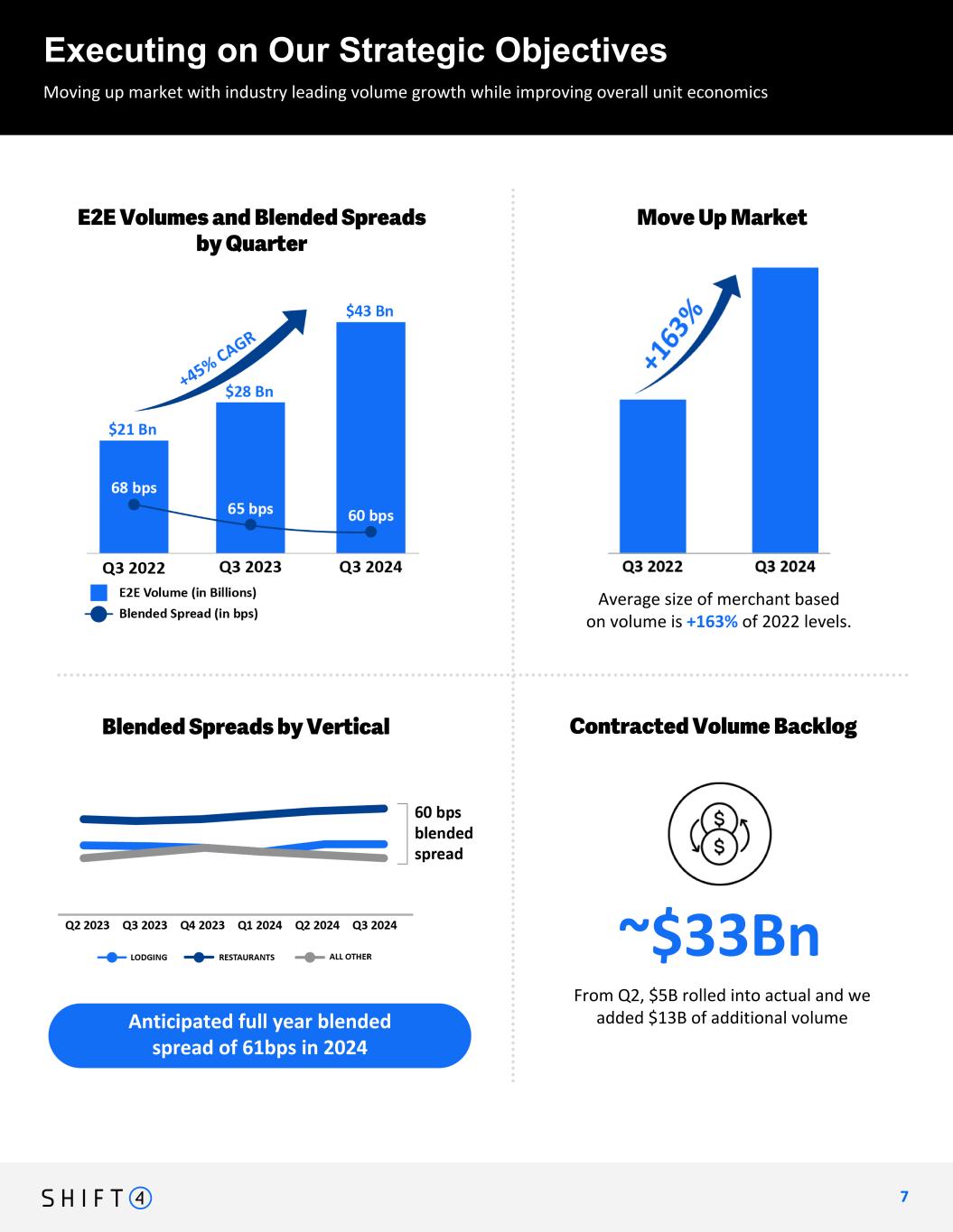 From Q2, $5B rolled into actual and we added $13B of additional volume Moving up market with industry leading volume growth while improving overall unit economics Executing on Our Strategic Objectives 7 7 E2E Volumes and Blended Spreads by Quarter Move Up Market Average size of merchant based on volume is +163% of 2022 levels. Contracted Volume BacklogBlended Spreads by Vertical ~$25Bn ~$33Bn Anticipated full year blended spread of 61bps in 2024 flag increase vs. 25 visually? how do we want to present this? +163% $21B - $28B - $43B 68bps - 65bps -60bps 45% CAGR new chart off to left - average is 60bps blended