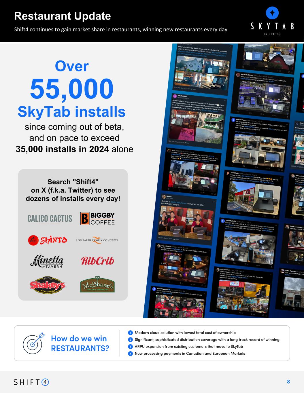 8 Over 55,000 Search "Shift4" on X (f.k.a. Twitter) to see dozens of installs every day! since coming out of beta, and on pace to exceed 35,000 installs in 2024 alone SkyTab installs Shift4 continues to gain market share in restaurants, winning new restaurants every day Restaurant Update
