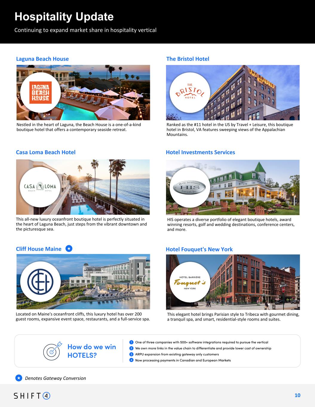 Continuing to expand market share in hospitality vertical Hospitality Update 1 0 10 Continuing to expand arket share in hospitality vertical Denotes Gateway Conversion★ HIS operates a diverse portfolio of elegant boutique hotels, award winning resorts, golf and wedding destinations, conference centers, and more. Cliff House Maine This elegant hotel brings Parisian style to Tribeca with gourmet dining, a tranquil spa, and smart, residential-style rooms and suites. Hotel Fouquet's New York This all-new luxury oceanfront boutique hotel is perfectly situated in the heart of Laguna Beach, just steps from the vibrant downtown and the picturesque sea. ★ Hotel Investments ServicesCasa Loma Beach Hotel Ranked as the #11 hotel in the US by Travel + Leisure, this boutique hotel in Bristol, VA features sweeping views of the Appalachian Mountains. Nestled in the heart of Laguna, the Beach House is a one-of-a-kind boutique hotel that offers a contemporary seaside retreat. The Bristol HotelLaguna Beach House Located on Maine's oceanfront cliffs, this luxury hotel has over 200 guest rooms, expansive event space, restaurants, and a full-service spa.
