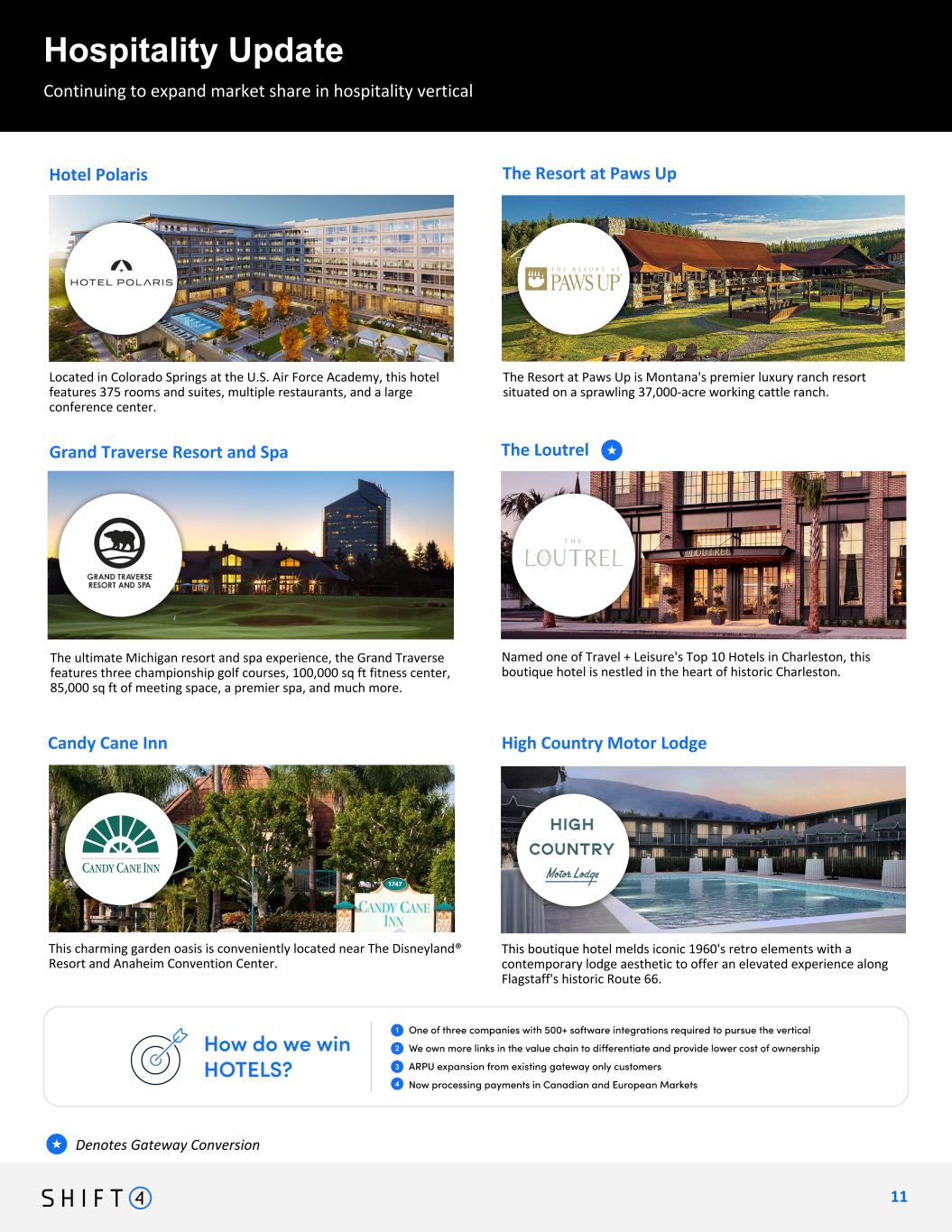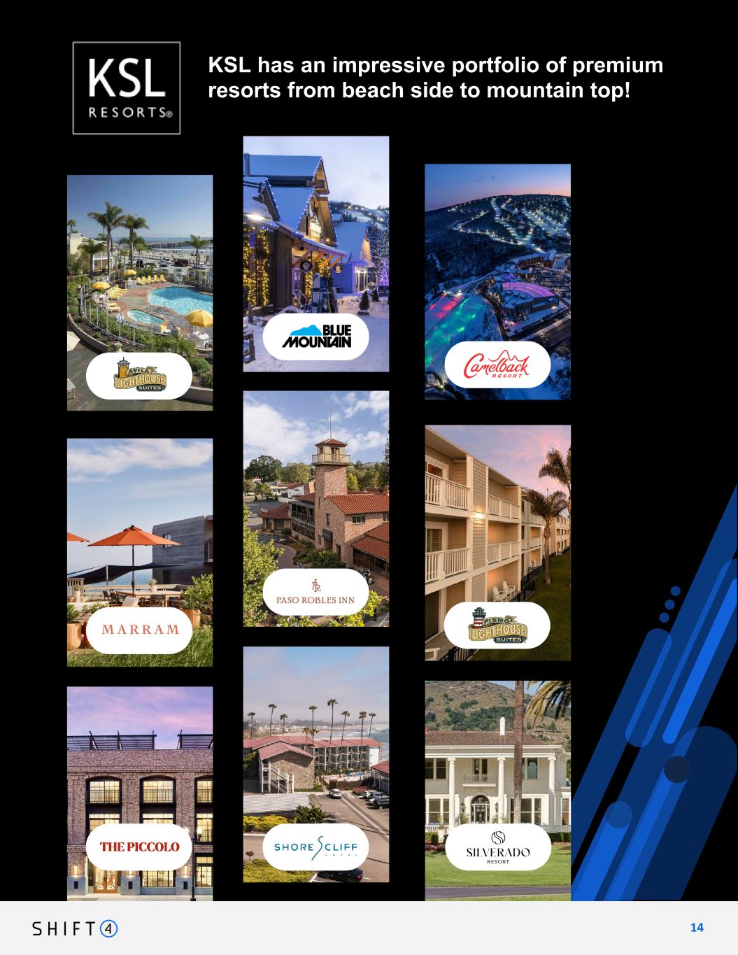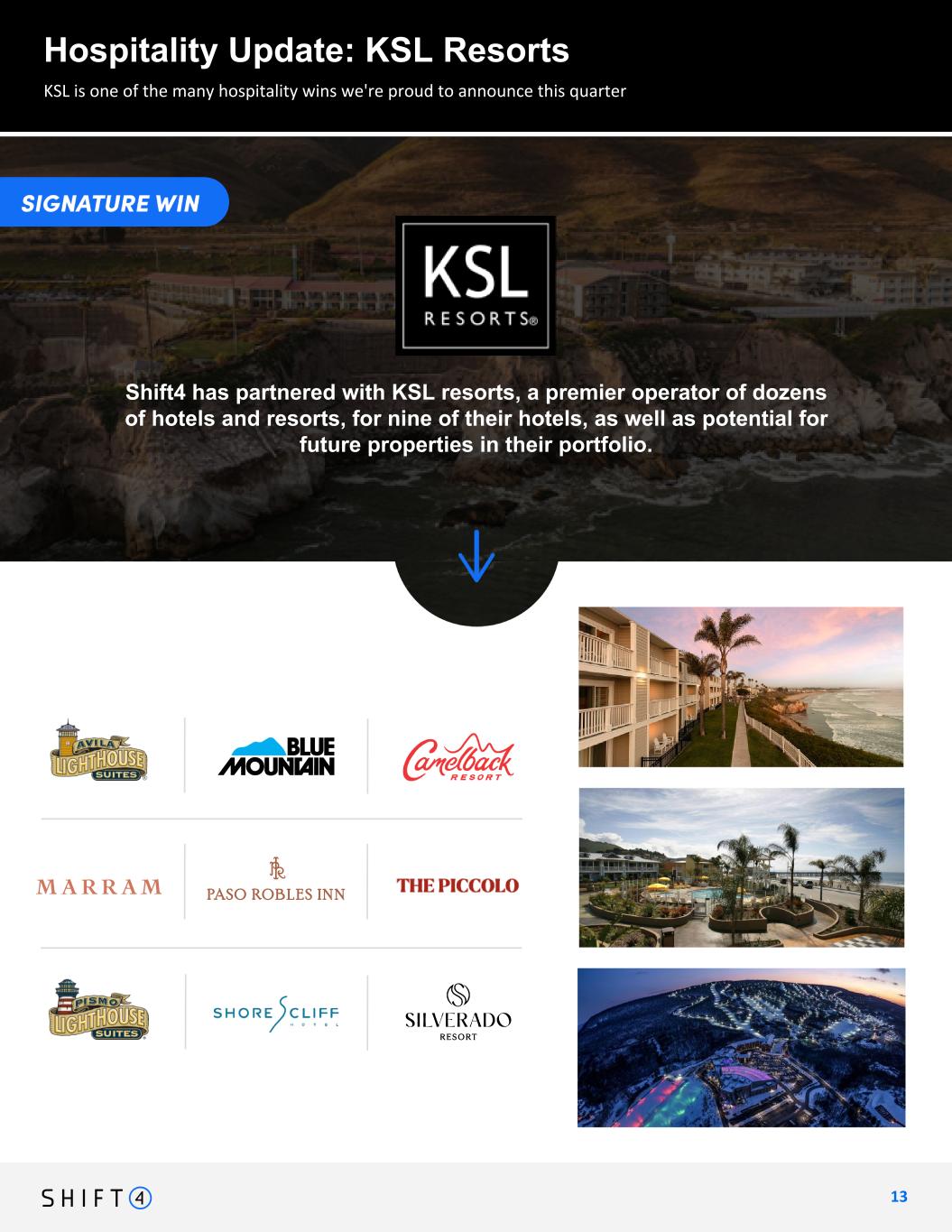 Continuing to expand market share in hospitality vertical Hospitality Update: KSL Resorts 1 3 13 KSL is one of the many hospitality wins we're proud to announce this quarter Shift4 has partnered with KSL resorts, a premier operator of dozens of hotels and resorts, for nine of their hotels, as well as potential for future properties in their portfolio.