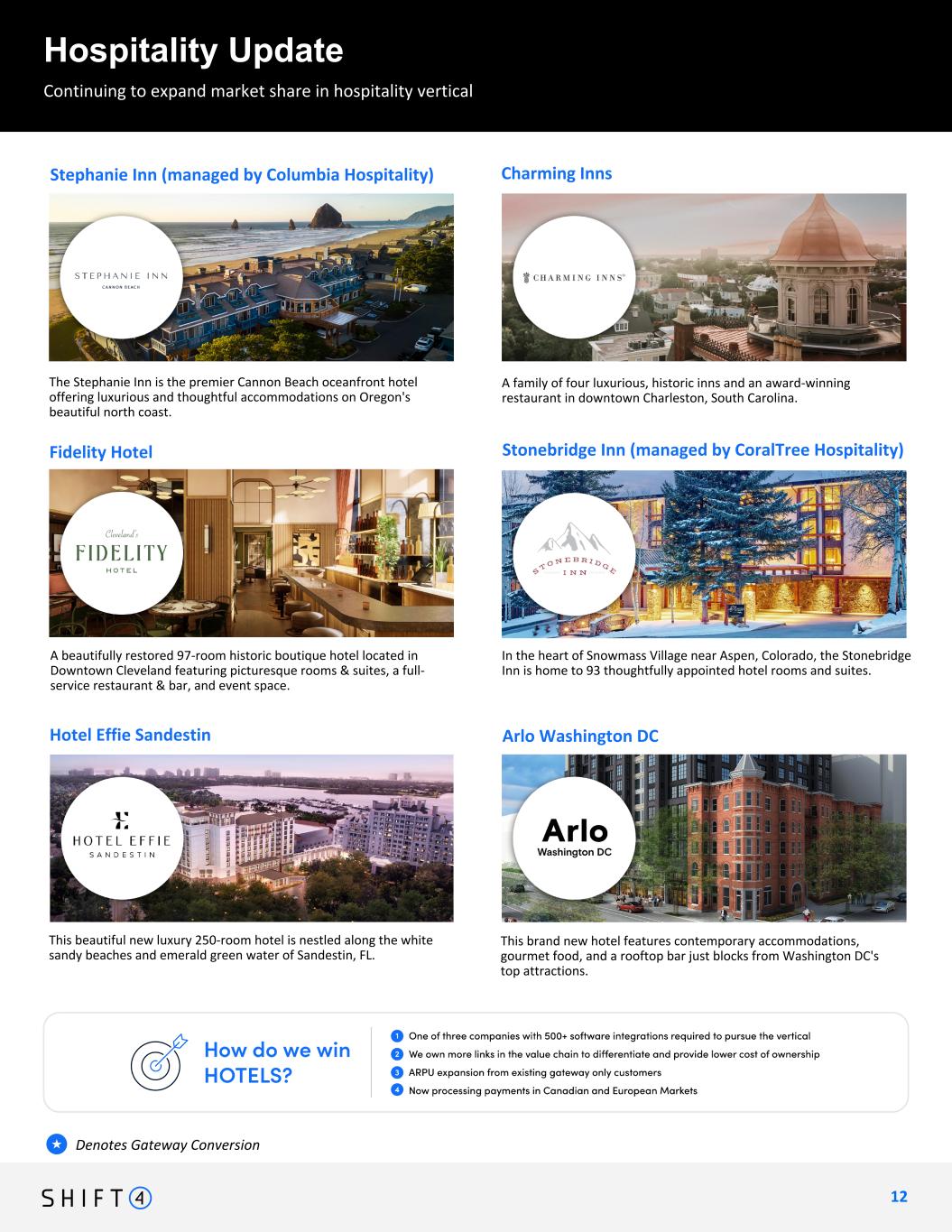 Continuing to expand market share in hospitality vertical Hospitality Update 1 2 12 Continuing to expand arket share in hospitality vertical Denotes Gateway Conversion★ Hotel Effie Sandestin This brand new hotel features contemporary accommodations, gourmet food, and a rooftop bar just blocks from Washington DC's top attractions. Arlo Washington DC This beautiful new luxury 250-room hotel is nestled along the white sandy beaches and emerald green water of Sandestin, FL. In the heart of Snowmass Village near Aspen, Colorado, the Stonebridge Inn is home to 93 thoughtfully appointed hotel rooms and suites. Stonebridge Inn (managed by CoralTree Hospitality) A beautifully restored 97-room historic boutique hotel located in Downtown Cleveland featuring picturesque rooms & suites, a full- service restaurant & bar, and event space. Fidelity Hotel The Stephanie Inn is the premier Cannon Beach oceanfront hotel offering luxurious and thoughtful accommodations on Oregon's beautiful north coast. Stephanie Inn (managed by Columbia Hospitality) A family of four luxurious, historic inns and an award-winning restaurant in downtown Charleston, South Carolina. Charming Inns