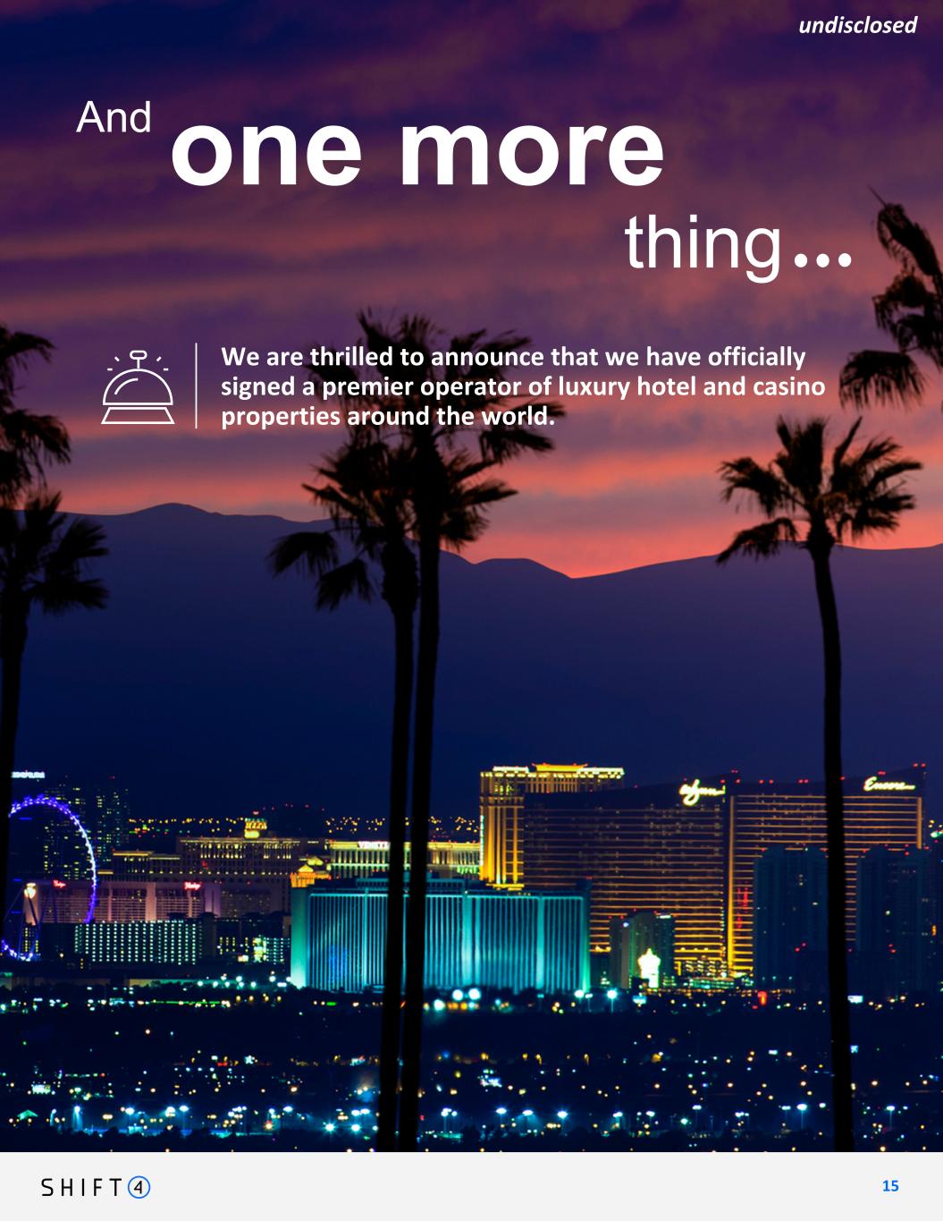1 5 15 undisclosed one more We are thrilled to announce that we have officially signed a premier operator of luxury hotel and casino properties around the world. And thing