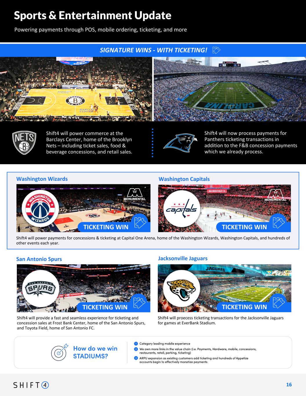 American Airlines Center Sports & Entertainment Update Powering payments through POS, mobile ordering, ticketing, and more 1 6 16 Jacksonville Jaguars Washington Capitals Shift4 will provide a fast and seamless experience for ticketing and concession sales at Frost Bank Center, home of the San Antonio Spurs, and Toyota Field, home of San Antonio FC. Chicago White Sox Shift4 will now process payments for Panthers ticketing transactions in addition to the F&B concession payments which we already process. Shift4 will power commerce at the Barclays Center, home of the Brooklyn Nets – including ticket sales, food & beverage concessions, and retail sales. Washington Wizards San Antonio Spurs SIGNATURE WINS - WITH TICKETING! Shift4 will proecess ticketing transactions for the Jacksonville Jaguars for games at EverBank Stadium. TICKETING WIN TICKETING WIN TICKETING WIN TICKETING WIN Shift4 will power payments for concessions & ticketing at Capital One Arena, home of the Washington Wizards, Washington Capitals, and hundreds of other events each year.