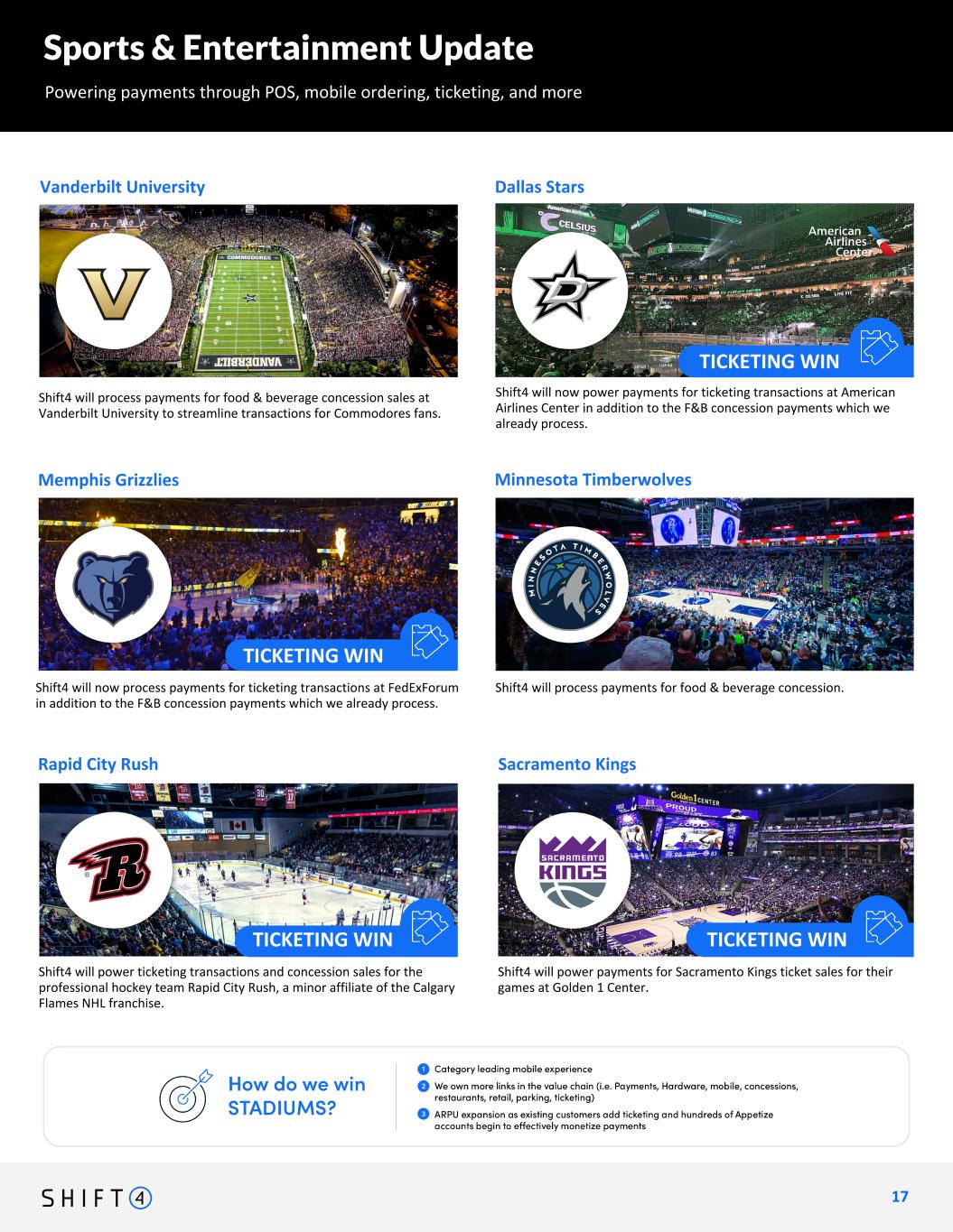 Memphis Grizzlies 1 7 17 Minnesota Timberwolves Sacramento Kings Shift4 will power ticketing transactions and concession sales for the professional hockey team Rapid City Rush, a minor affiliate of the Calgary Flames NHL franchise. Rapid City Rush Vanderbilt University Dallas Stars Shift4 will power payments for Sacramento Kings ticket sales for their games at Golden 1 Center. Shift4 will process payments for food & beverage concession. TICKETING WIN TICKETING WIN Sports & Entertainment Update Powering payments through POS, mobile ordering, ticketing, and more TICKETING WIN TICKETING WIN I I I Shift4 will now process payments for ticketing transactions at FedExForum in addition to the F&B concession payments which we already process. Shift4 will now power payments for ticketing transactions at American Airlines Center in addition to the F&B concession payments which we already process. Shift4 will process payments for food & beverage concession sales at Vanderbilt University to streamline transactions for Commodores fans.