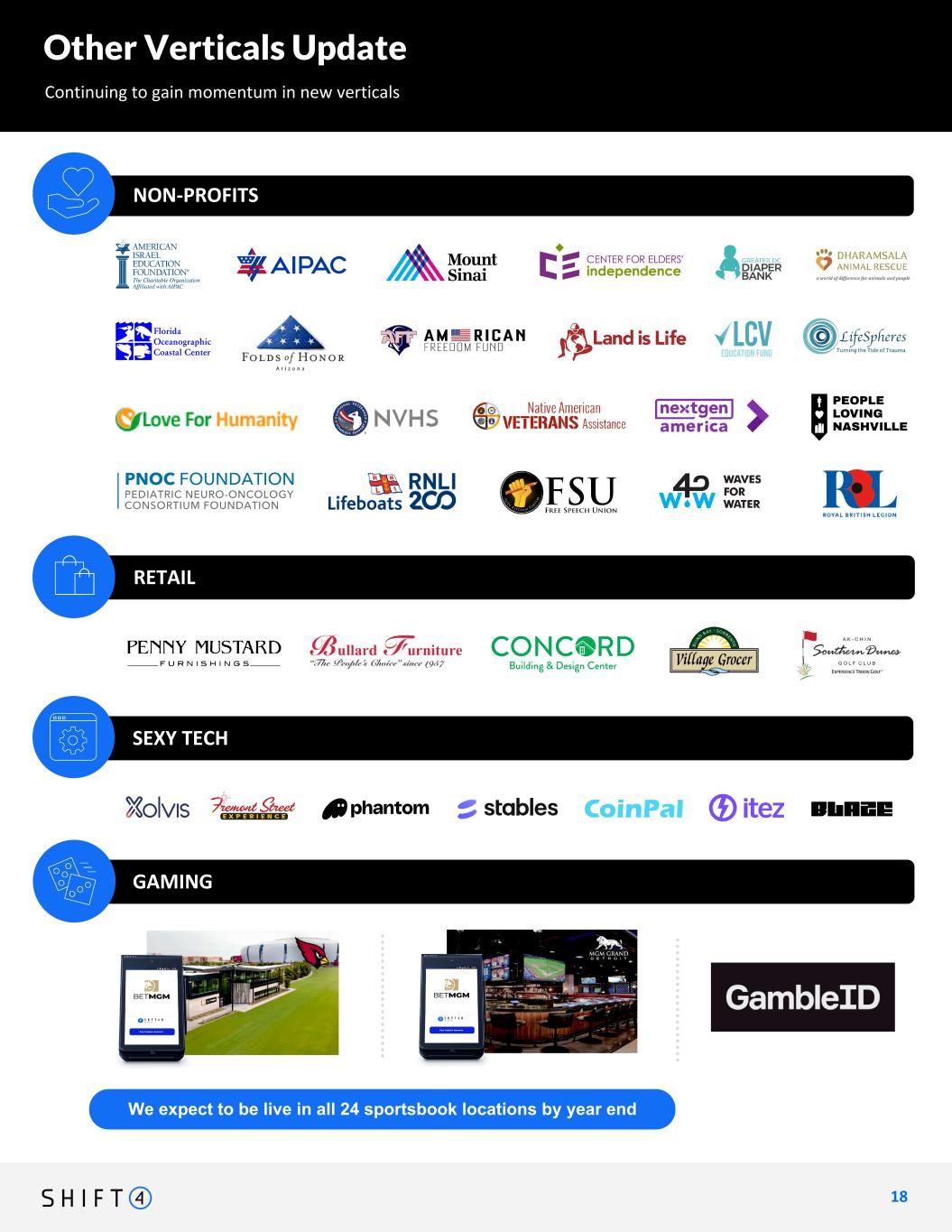 Other Verticals Update Continuing to gain momentum in new verticals 1 8 18 NON-PROFITS SEXY TECH GAMING In Europe, our relationship with online delivery platform Wolt is ramping extremely quickly. Wolt is a global leader in home delivery of essential items (food, convenience, etc.) Processing payments for Nayax, a European PSP focused on unattended retail-use-cases, including EV charging stations We entered into an agreement to process payments for Fortech, a PSP in Italy focused on fuel stations and EV charging stations throughout the country.we entered into an agreement to process payments for Fortech, a PSP in Italy focused on fuel stations and EV charging stations throughout the country. • in the process of rolling out SkyTab mobile devices through all of BetMGM's 24 sportsbooklocations across 9 states • SkyTab also being integrated with Passport Technology, a tech partner that enables cashless gaming experiences on the casino floor //// • Online gaming: ryvals.com (online gaming site targeting the interactive "competitive gamer" community); Prime Sports Betting (an online platform currently operating in Ohio & expanding); Jefebet (online betting platform customized exclusively for the underserved latino community); Rolling Riches (online gaming site blending social media with slot and casino-type games) RETAIL Shift4 is live with SkyTab mobile devices at the Great American Ballpark, home of the Cincinnati Reds. We are now live with SkyTab mobile at our first BetMGM Sportsbook location, Nationals Stadium in Washington D.C. SkyTab devices integrated with Passport Technologies for cashless gaming experiences at the Morongo Casino outside of Palm Springs Shift4 is thrilled to be powering the payments for the Boston Marathon, the world's oldest annual marathon, via GivenGain, to which we have fully moved all U.S. card volume. Nonprofits: Poppy Appeal, Royal National Lifeboat Institution, Firearms Policy Coalition,Charlotte Preparatory School, The Free Speech Union, GRACE Christian School, LifeSpheres, Folds of Honor Arizona Chapter, Center for Elders' Independence, Carmel Catholic High School, First Love Revolution Church, NextGen Climate Action, Jewish Vocational and Career Counseling Service, Alt News Foundation, UboraTZ, League of Conservation Voters Education Fund, People Loving Nashville, Florida Oceanographic Society, PNOC Foundation, American Israel Education Foundation, Land Is Life, Freedom for America Fund, Litecoin Foundation Inc., Greater DC Diaper Bank, Native American Veterans Assistance, Waves For Water, Love of Humanity, Inc, Ascent Church, National Veterans Homeless Support, Amnesty International, American Israel Public Affairs Committee, Huntington County Community Foundation, Dharamsala Animal Rescue, NexGen Climate Action >>>probably need to select the top ones from here Retail: Penny Mustard Furnishings, Bullard Furniture, Concord Lumber & Building Center Littleton, Blind Bay Village Grocer, Ak-Chin Southern Dunes Golf Club Gaming: BetMGM Arizona (live),BetMGM Michigan, GambleID, PlayLive Philadelphia Sexy Tech Xolvis, Fremont Street Experience, Switchere, Chain Valley, Coinflow, Phantom Wallet, Stables, CoinPal, Coin Sonic, Swapin, Excur, Itez, Blaze Payments Nonprofits: Poppy Appeal, Royal National Lifeboat Institution, , The Free Speech Union, LifeSpheres, Folds of Honor Arizona Chapter, Center for Elders' Independence, NextGen Climate Action, League of Conservation Voters Education Fund, People Loving Nashville, Florida Oceanographic Society, PNOC Foundation, American Israel Education Foundation, Land Is Life, Freedom for America Fund, DC Diaper Bank, Native American Veterans Assistance, Waves For Water, Love of Humanity, Inc, National Veterans Homeless Support, Amnesty International, American Israel Public Affairs Committee, Dharamsala Animal Rescue >>>probably need to select the top ones from here call out amnesty intl. We expect to be live in all 24 sportsbook locations by year end