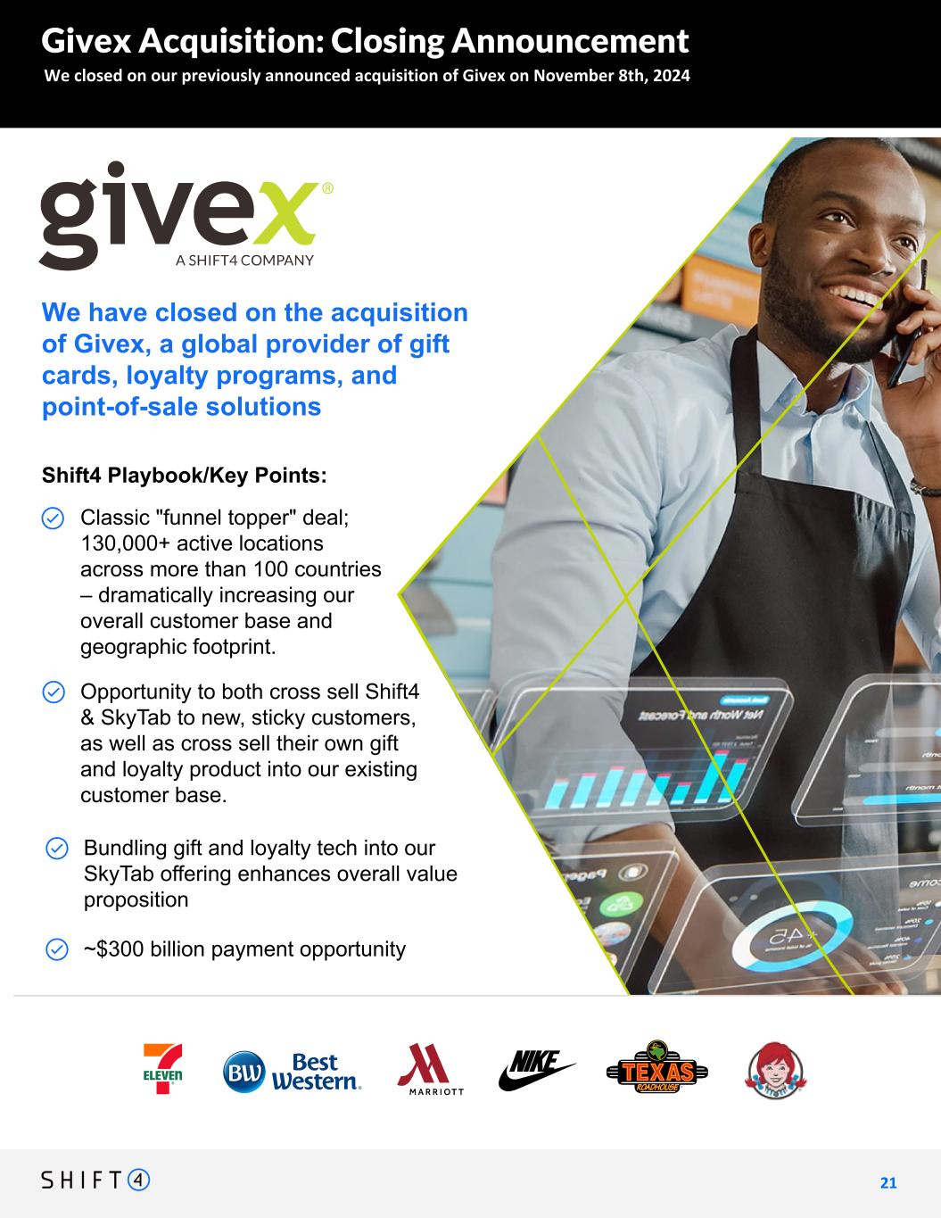 We closed on our previously announced acquisition of Givex on November 8th, 2024 2 1 21 Givex Acquisition: Closing Announcement We have closed on the acquisition of Givex, a global provider of gift cards, loyalty programs, and point-of-sale solutions Shift4 Playbook/Key Points: Classic "funnel topper" deal; 130,000+ active locations across more than 100 countries – dramatically increasing our overall customer base and geographic footprint. Opportunity to both cross sell Shift4 & SkyTab to new, sticky customers, as well as cross sell their own gift and loyalty product into our existing customer base. ~$300 billion payment opportunity Bundling gift and loyalty tech into our SkyTab offering enhances overall value proposition