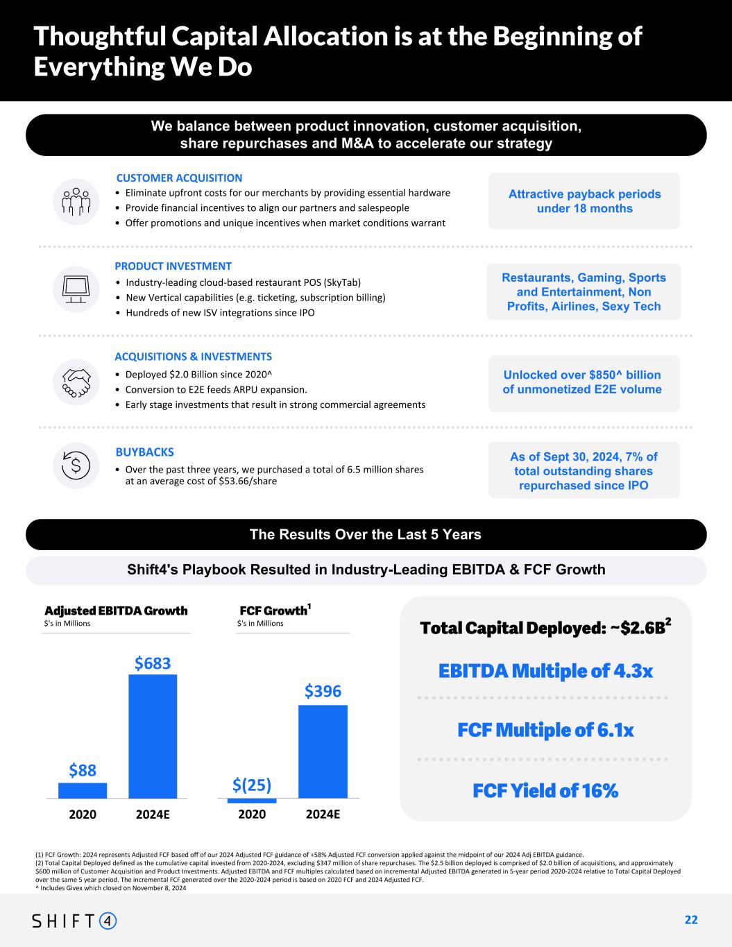 Restaurants, Gaming, Sports and Entertainment, Non Profits, Airlines, Sexy Tech Shift4's Playbook Resulted in Industry-Leading EBITDA & FCF Growth (1) FCF Growth: 2024 represents Adjusted FCF based off of our 2024 Adjusted FCF guidance of +58% Adjusted FCF conversion applied against the midpoint of our 2024 Adj EBITDA guidance. (2) Total Capital Deployed defined as the cumulative capital invested from 2020-2024, excluding $347 million of share repurchases. The $2.5 billion deployed is comprised of $2.0 billion of acquisitions, and approximately $600 million of Customer Acquisition and Product Investments. Adjusted EBITDA and FCF multiples calculated based on incremental Adjusted EBITDA generated in 5-year period 2020-2024 relative to Total Capital Deployed over the same 5 year period. The incremental FCF generated over the 2020-2024 period is based on 2020 FCF and 2024 Adjusted FCF. ^ Includes Givex which closed on November 8, 2024 2 2 22 2024 GOAL & BEYOND We balance between product innovation, customer acquisition, share repurchases and M&A to accelerate our strategy Thoughtful Capital Allocation is at the Beginning of Everything We Do CUSTOMER ACQUISITION • Industry-leading cloud-based restaurant POS (SkyTab) • New Vertical capabilities (e.g. ticketing, subscription billing) • Hundreds of new ISV integrations since IPO Buybacks Acquisitions and Investments PRODUCT INVESTMENT • Eliminate upfront costs for our merchants by providing essential hardware • Provide financial incentives to align our partners and salespeople • Offer promotions and unique incentives when market conditions warrant • Deployed $1.5 Billion since 2020 • Conversion to E2E feeds ARPU expansion. • Early stage investments that result in strong commercial agreements • Over the past three years, we purchased a total of 5.9 million shares at an average cost of $52.41/share The Results Over the Last 5 Years Adjusted EBITDA Growth THE RESULTS Cumulative Incremental FCF Generated $278 Million FCF of 14% Cumulative Capital Invested ($'s in Millions) FCF Growth1 EBITDA Multiple of 4.3x THE RESULTS Cumulative Incremental FCF Generated FCF Multiple of 6.1x FCF Yield of 16% Total Capital Deployed: ~$2.6B2$'s in Millions $'s in Millions Attractive payback periods under 18 months Unlocked over $500 billion of unmonetized E2E volume 6% of total outstanding shares repurchased since IPO ACQUISITIONS & INVESTMENTS • Deployed $2.0 Billion since 2020^ • Conversion to E2E feeds ARPU expansion. • Early stage investments that result in strong commercial agreements Unlocked over $850^ billion of unmonetized E2E volume BUYBACKS • Over the past three years, we purchased a total of 6.5 million shares at an average cost of $53.66/share As of Sept 30, 2024, 7% of total outstanding shares repurchased since IPO $683 $396