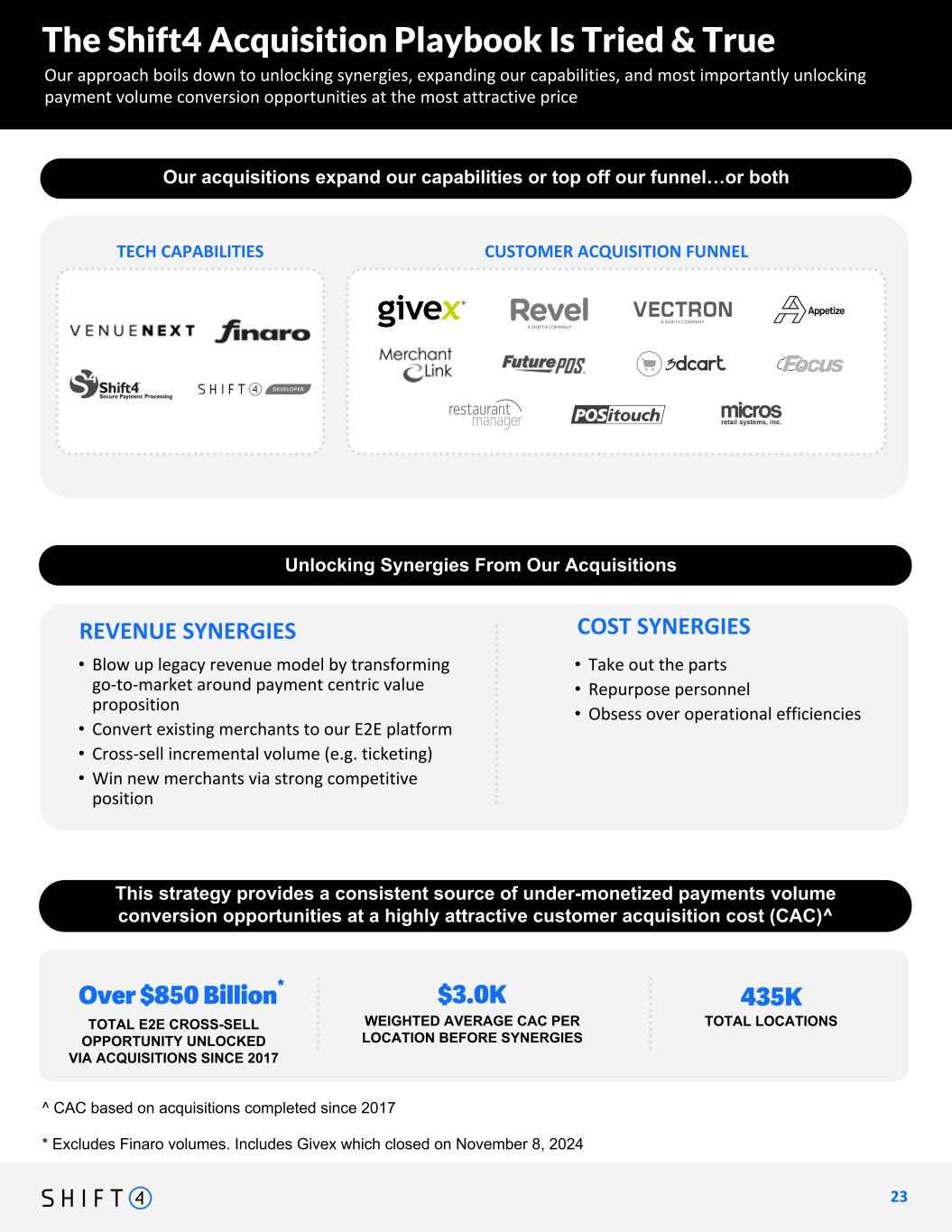 Over $850 Billion* 435K TOTAL E2E CROSS-SELL OPPORTUNITY UNLOCKED VIA ACQUISITIONS SINCE 2017 TOTAL LOCATIONS $3.0K WEIGHTED AVERAGE CAC PER LOCATION BEFORE SYNERGIES * Excludes Finaro volumes. Includes Givex which closed on November 8, 2024 The Shift4 Acquisition Playbook Is Tried & True Our approach boils down to unlocking synergies, expanding our capabilities, and most importantly unlocking payment volume conversion opportunities at the most attractive price 2 3 23 highlight contrast vs. worldline add comment on M&A for distribution? (+ finaro charts from Luke?) 2024 GOAL & BEYOND EBITDA Multiple: 5.3x FCF Yield: 14% • Take out the parts • Repurpose personnel • Obsess over operational efficiencies COST SYNERGIESREVENUE SYNERGIES Unlocking Synergies From Our Acquisitions • Blow up legacy revenue model by transforming go-to-market around payment centric value proposition • Convert existing merchants to our E2E platform • Cross-sell incremental volume (e.g. ticketing) • Win new merchants via strong competitive position Our acquisitions either expand our capabilities or top off our funnel... This strategy provides a consistent source of under-monetized payments volume conversion opportunities at a highly attractive customer acquisition cost (CAC)^ arrow here leading to punchline Our acquisitions provide a consistent source of under monetized payment opportunities to convert merchants onto our end-to-end platform at highly attractive customer acquisition cost (CAC) TECH CAPABILITIES CUSTOMER ACQUISITION FUNNEL Our acquisitions expand our capabilities or top off our funnel…or both ^ CAC based on acquisitions completed since 2017