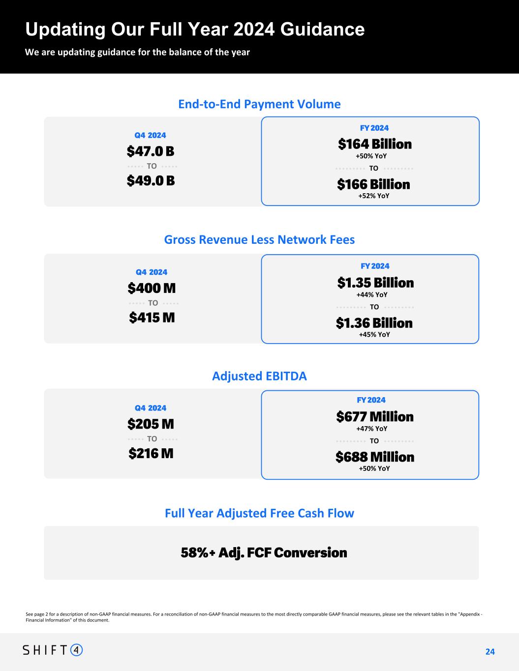 See page 2 for a description of non-GAAP financial measures. For a reconciliation of non-GAAP financial measures to the most directly comparable GAAP financial measures, please see the relevant tables in the "Appendix - Financial Information" of this document. Updating Our Full Year 2024 Guidance We are updating guidance for the balance of the year 2 4 24 Intended Message: Adjusted for contribution from Finaro/Appetize, we're looking at 31% YoY GRLNF growth in Q4 Full Year Adjusted Free Cash Flow 58%+ Adj. FCF Conversion End-to-End Payment Volume $47.0 B $49.0 B TO Q4 2024 $164 Billion $166 Billion TO FY 2024 +50% YoY +52% YoY Gross Revenue Less Network Fees $1.35 Billion $1.36 Billion TO FY 2024 +44% YoY +45% YoY Adjusted EBITDA $677 Million $688 Million TO FY 2024 +47% YoY +50% YoY $400 M $415 M TO Q4 2024 $205 M $216 M TO Q4 2024 format fix + change to #s from Nancy continuing with quarterly guidance is smart. I know it was a judgement call last quarter, and just because something may have worked then doesn’t mean it will now. What it does do is ensure the analyst estimates are closer to ours, and improves our chance for a beat. I wouldn’t want to take a chance that analysts partition the second half estimates the same way we would