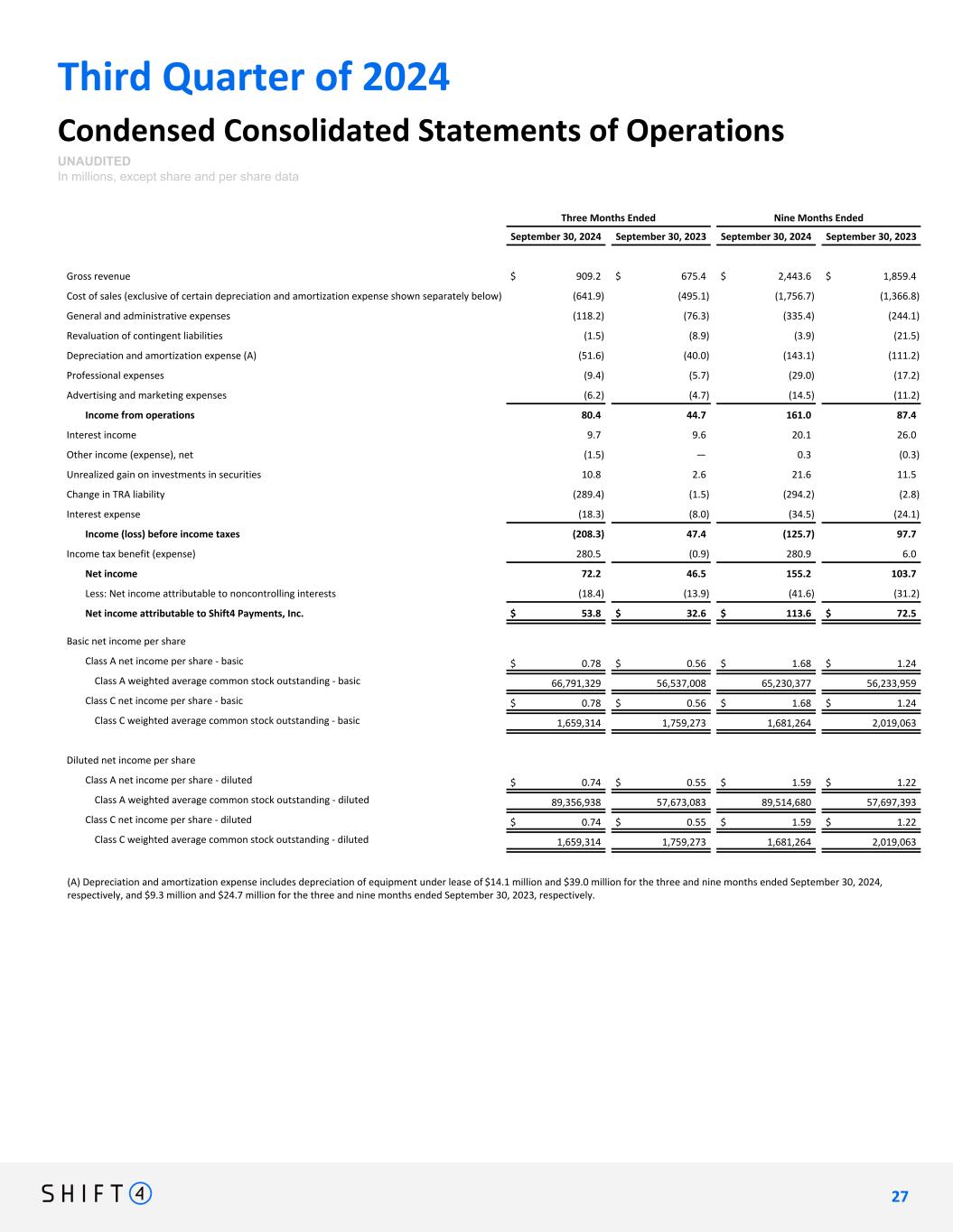 Third Quarter of 2024 Condensed Consolidated Statements of Operations UNAUDITED In millions, except share and per share data Three Months Ended Nine Months Ended September 30, 2024 September 30, 2023 September 30, 2024 September 30, 2023 Gross revenue $ 909.2 $ 675.4 $ 2,443.6 $ 1,859.4 Cost of sales (exclusive of certain depreciation and amortization expense shown separately below) (641.9) (495.1) (1,756.7) (1,366.8) General and administrative expenses (118.2) (76.3) (335.4) (244.1) Revaluation of contingent liabilities (1.5) (8.9) (3.9) (21.5) Depreciation and amortization expense (A) (51.6) (40.0) (143.1) (111.2) Professional expenses (9.4) (5.7) (29.0) (17.2) Advertising and marketing expenses (6.2) (4.7) (14.5) (11.2) Income from operations 80.4 44.7 161.0 87.4 Interest income 9.7 9.6 20.1 26.0 Other income (expense), net (1.5) — 0.3 (0.3) Unrealized gain on investments in securities 10.8 2.6 21.6 11.5 Change in TRA liability (289.4) (1.5) (294.2) (2.8) Interest expense (18.3) (8.0) (34.5) (24.1) Income (loss) before income taxes (208.3) 47.4 (125.7) 97.7 Income tax benefit (expense) 280.5 (0.9) 280.9 6.0 Net income 72.2 46.5 155.2 103.7 Less: Net income attributable to noncontrolling interests (18.4) (13.9) (41.6) (31.2) Net income attributable to Shift4 Payments, Inc. $ 53.8 $ 32.6 $ 113.6 $ 72.5 Basic net income per share Class A net income per share - basic $ 0.78 $ 0.56 $ 1.68 $ 1.24 Class A weighted average common stock outstanding - basic 66,791,329 56,537,008 65,230,377 56,233,959 Class C net income per share - basic $ 0.78 $ 0.56 $ 1.68 $ 1.24 Class C weighted average common stock outstanding - basic 1,659,314 1,759,273 1,681,264 2,019,063 Diluted net income per share Class A net income per share - diluted $ 0.74 $ 0.55 $ 1.59 $ 1.22 Class A weighted average common stock outstanding - diluted 89,356,938 57,673,083 89,514,680 57,697,393 Class C net income per share - diluted $ 0.74 $ 0.55 $ 1.59 $ 1.22 Class C weighted average common stock outstanding - diluted 1,659,314 1,759,273 1,681,264 2,019,063 (A) Depreciation and amortization expense includes depreciation of equipment under lease of $14.1 million and $39.0 million for the three and nine months ended September 30, 2024, respectively, and $9.3 million and $24.7 million for the three and nine months ended September 30, 2023, respectively. 2 7 27