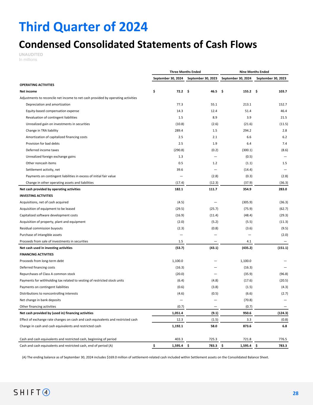 Third Quarter of 2024 Condensed Consolidated Statements of Cash Flows UNAUDITED In millions Three Months Ended Nine Months Ended September 30, 2024 September 30, 2023 September 30, 2024 September 30, 2023 OPERATING ACTIVITIES Net income $ 72.2 $ 46.5 $ 155.2 $ 103.7 Adjustments to reconcile net income to net cash provided by operating activities Depreciation and amortization 77.3 55.1 213.1 152.7 Equity-based compensation expense 14.3 12.4 51.4 46.4 Revaluation of contingent liabilities 1.5 8.9 3.9 21.5 Unrealized gain on investments in securities (10.8) (2.6) (21.6) (11.5) Change in TRA liability 289.4 1.5 294.2 2.8 Amortization of capitalized financing costs 2.5 2.1 6.6 6.2 Provision for bad debts 2.5 1.9 6.4 7.4 Deferred income taxes (290.8) (0.2) (300.1) (8.6) Unrealized foreign exchange gains 1.3 — (0.5) — Other noncash items 0.5 1.2 (1.1) 1.5 Settlement activity, net 39.6 — (14.4) — Payments on contingent liabilities in excess of initial fair value — (2.8) (0.3) (2.8) Change in other operating assets and liabilities (17.4) (12.3) (37.9) (36.3) Net cash provided by operating activities 182.1 111.7 354.9 283.0 INVESTING ACTIVITIES Acquisitions, net of cash acquired (4.5) — (305.9) (36.3) Acquisition of equipment to be leased (29.5) (25.7) (75.9) (62.7) Capitalized software development costs (16.9) (11.4) (48.4) (29.3) Acquisition of property, plant and equipment (2.0) (5.2) (5.5) (11.3) Residual commission buyouts (2.3) (0.8) (3.6) (9.5) Purchase of intangible assets — — — (2.0) Proceeds from sale of investments in securities 1.5 — 4.1 — Net cash used in investing activities (53.7) (43.1) (435.2) (151.1) FINANCING ACTIVITIES Proceeds from long-term debt 1,100.0 — 1,100.0 — Deferred financing costs (16.3) — (16.3) — Repurchases of Class A common stock (20.0) — (35.9) (96.8) Payments for withholding tax related to vesting of restricted stock units (6.4) (4.8) (17.6) (20.5) Payments on contingent liabilities (0.6) (3.8) (1.5) (4.3) Distributions to noncontrolling interests (4.6) (0.5) (6.6) (2.7) Net change in bank deposits — — (70.8) — Other financing activities (0.7) — (0.7) — Net cash provided by (used in) financing activities 1,051.4 (9.1) 950.6 (124.3) Effect of exchange rate changes on cash and cash equivalents and restricted cash 12.3 (1.5) 3.3 (0.8) Change in cash and cash equivalents and restricted cash 1,192.1 58.0 873.6 6.8 Cash and cash equivalents and restricted cash, beginning of period 403.3 725.3 721.8 776.5 Cash and cash equivalents and restricted cash, end of period (A) $ 1,595.4 $ 783.3 $ 1,595.4 $ 783.3 2 8 28 (A) The ending balance as of September 30, 2024 includes $169.0 million of settlement-related cash included within Settlement assets on the Consolidated Balance Sheet.