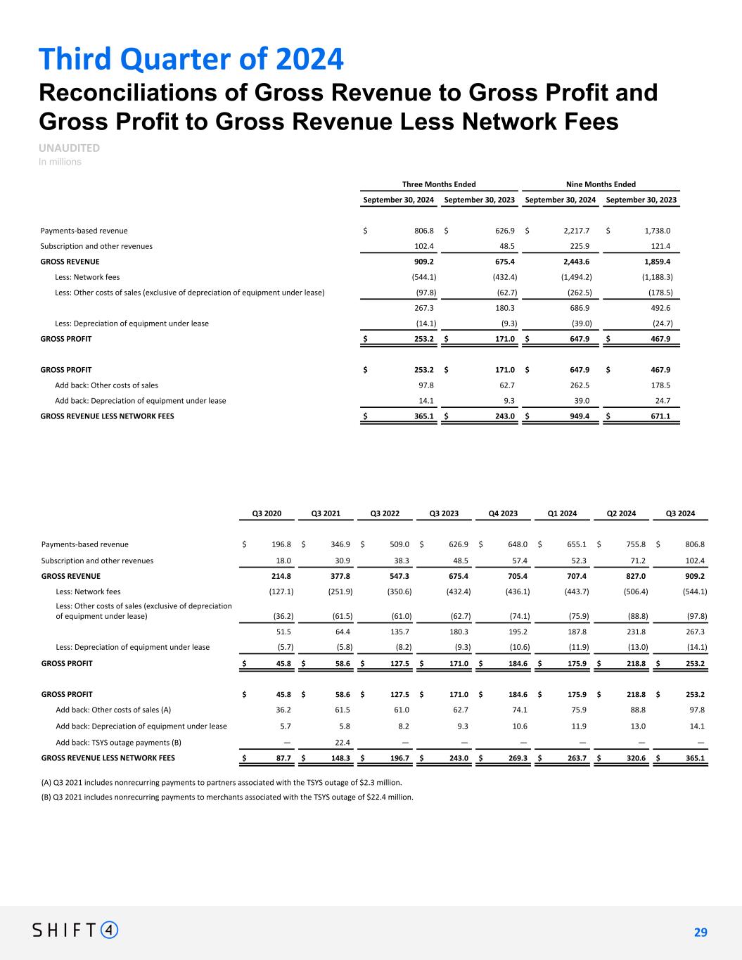 Third Quarter of 2024 Reconciliations of Gross Revenue to Gross Profit and Gross Profit to Gross Revenue Less Network Fees UNAUDITED In millions Three Months Ended Nine Months Ended September 30, 2024 September 30, 2023 September 30, 2024 September 30, 2023 Payments-based revenue $ 806.8 $ 626.9 $ 2,217.7 $ 1,738.0 Subscription and other revenues 102.4 48.5 225.9 121.4 GROSS REVENUE 909.2 675.4 2,443.6 1,859.4 Less: Network fees (544.1) (432.4) (1,494.2) (1,188.3) Less: Other costs of sales (exclusive of depreciation of equipment under lease) (97.8) (62.7) (262.5) (178.5) 267.3 180.3 686.9 492.6 Less: Depreciation of equipment under lease (14.1) (9.3) (39.0) (24.7) GROSS PROFIT $ 253.2 $ 171.0 $ 647.9 $ 467.9 GROSS PROFIT $ 253.2 $ 171.0 $ 647.9 $ 467.9 Add back: Other costs of sales 97.8 62.7 262.5 178.5 Add back: Depreciation of equipment under lease 14.1 9.3 39.0 24.7 GROSS REVENUE LESS NETWORK FEES $ 365.1 $ 243.0 $ 949.4 $ 671.1 Q3 2020 Q3 2021 Q3 2022 Q3 2023 Q4 2023 Q1 2024 Q2 2024 Q3 2024 Payments-based revenue $ 196.8 $ 346.9 $ 509.0 $ 626.9 $ 648.0 $ 655.1 $ 755.8 $ 806.8 Subscription and other revenues 18.0 30.9 38.3 48.5 57.4 52.3 71.2 102.4 GROSS REVENUE 214.8 377.8 547.3 675.4 705.4 707.4 827.0 909.2 Less: Network fees (127.1) (251.9) (350.6) (432.4) (436.1) (443.7) (506.4) (544.1) Less: Other costs of sales (exclusive of depreciation of equipment under lease) (36.2) (61.5) (61.0) (62.7) (74.1) (75.9) (88.8) (97.8) 51.5 64.4 135.7 180.3 195.2 187.8 231.8 267.3 Less: Depreciation of equipment under lease (5.7) (5.8) (8.2) (9.3) (10.6) (11.9) (13.0) (14.1) GROSS PROFIT $ 45.8 $ 58.6 $ 127.5 $ 171.0 $ 184.6 $ 175.9 $ 218.8 $ 253.2 GROSS PROFIT $ 45.8 $ 58.6 $ 127.5 $ 171.0 $ 184.6 $ 175.9 $ 218.8 $ 253.2 Add back: Other costs of sales (A) 36.2 61.5 61.0 62.7 74.1 75.9 88.8 97.8 Add back: Depreciation of equipment under lease 5.7 5.8 8.2 9.3 10.6 11.9 13.0 14.1 Add back: TSYS outage payments (B) — 22.4 — — — — — — GROSS REVENUE LESS NETWORK FEES $ 87.7 $ 148.3 $ 196.7 $ 243.0 $ 269.3 $ 263.7 $ 320.6 $ 365.1 (A) Q3 2021 includes nonrecurring payments to partners associated with the TSYS outage of $2.3 million. (B) Q3 2021 includes nonrecurring payments to merchants associated with the TSYS outage of $22.4 million. 2 9 29