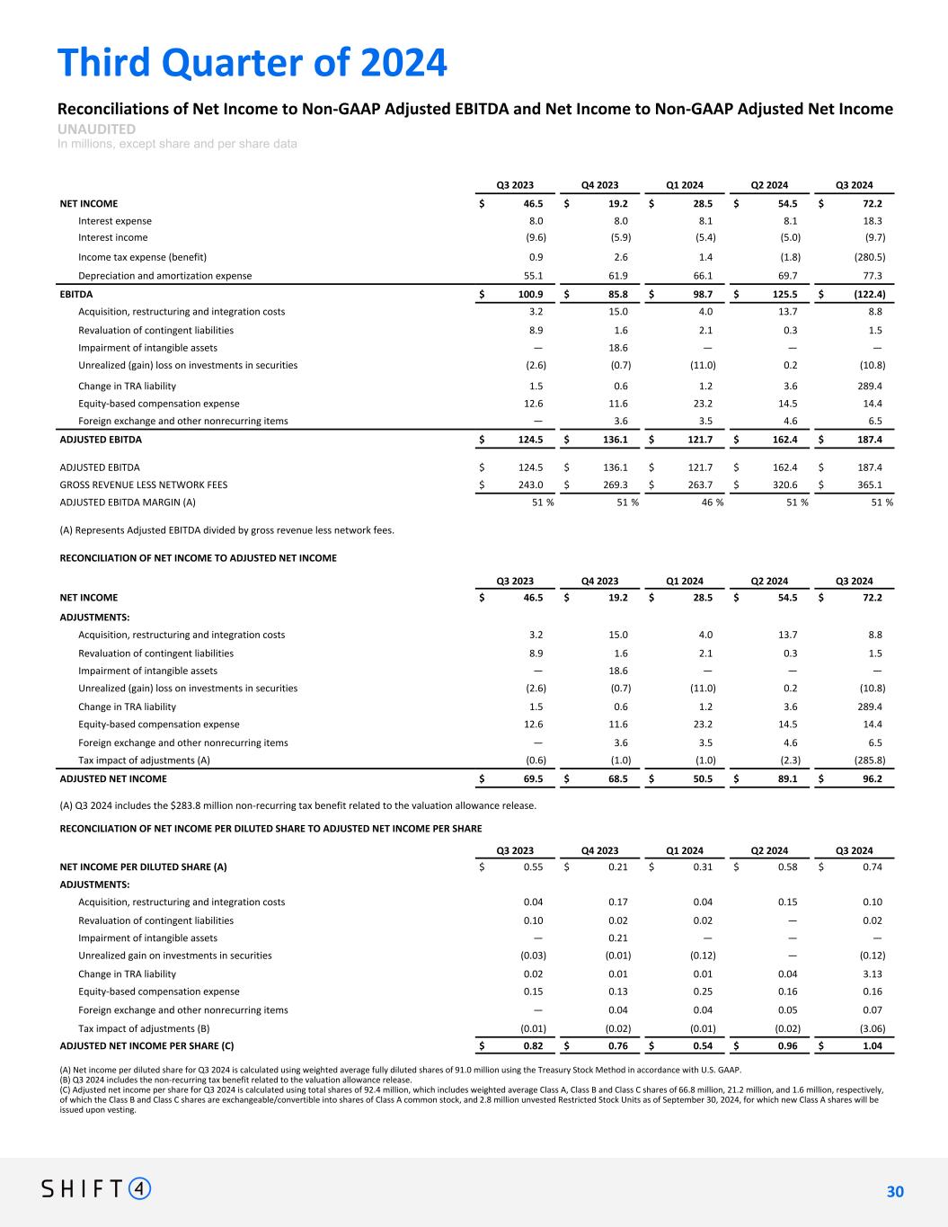 Third Quarter of 2024 Reconciliations of Net Income to Non-GAAP Adjusted EBITDA and Net Income to Non-GAAP Adjusted Net Income UNAUDITED In millions, except share and per share data Q3 2023 Q4 2023 Q1 2024 Q2 2024 Q3 2024 NET INCOME $ 46.5 $ 19.2 $ 28.5 $ 54.5 $ 72.2 Interest expense 8.0 8.0 8.1 8.1 18.3 Interest income (9.6) (5.9) (5.4) (5.0) (9.7) Income tax expense (benefit) 0.9 2.6 1.4 (1.8) (280.5) Depreciation and amortization expense 55.1 61.9 66.1 69.7 77.3 EBITDA $ 100.9 $ 85.8 $ 98.7 $ 125.5 $ (122.4) Acquisition, restructuring and integration costs 3.2 15.0 4.0 13.7 8.8 Revaluation of contingent liabilities 8.9 1.6 2.1 0.3 1.5 Impairment of intangible assets — 18.6 — — — Unrealized (gain) loss on investments in securities (2.6) (0.7) (11.0) 0.2 (10.8) Change in TRA liability 1.5 0.6 1.2 3.6 289.4 Equity-based compensation expense 12.6 11.6 23.2 14.5 14.4 Foreign exchange and other nonrecurring items — 3.6 3.5 4.6 6.5 ADJUSTED EBITDA $ 124.5 $ 136.1 $ 121.7 $ 162.4 $ 187.4 ADJUSTED EBITDA $ 124.5 $ 136.1 $ 121.7 $ 162.4 $ 187.4 GROSS REVENUE LESS NETWORK FEES $ 243.0 $ 269.3 $ 263.7 $ 320.6 $ 365.1 ADJUSTED EBITDA MARGIN (A) 51 % 51 % 46 % 51 % 51 % (A) Represents Adjusted EBITDA divided by gross revenue less network fees. RECONCILIATION OF NET INCOME TO ADJUSTED NET INCOME Q3 2023 Q4 2023 Q1 2024 Q2 2024 Q3 2024 NET INCOME $ 46.5 $ 19.2 $ 28.5 $ 54.5 $ 72.2 ADJUSTMENTS: Acquisition, restructuring and integration costs 3.2 15.0 4.0 13.7 8.8 Revaluation of contingent liabilities 8.9 1.6 2.1 0.3 1.5 Impairment of intangible assets — 18.6 — — — Unrealized (gain) loss on investments in securities (2.6) (0.7) (11.0) 0.2 (10.8) Change in TRA liability 1.5 0.6 1.2 3.6 289.4 Equity-based compensation expense 12.6 11.6 23.2 14.5 14.4 Foreign exchange and other nonrecurring items — 3.6 3.5 4.6 6.5 Tax impact of adjustments (A) (0.6) (1.0) (1.0) (2.3) (285.8) ADJUSTED NET INCOME $ 69.5 $ 68.5 $ 50.5 $ 89.1 $ 96.2 (A) Q3 2024 includes the $283.8 million non-recurring tax benefit related to the valuation allowance release. RECONCILIATION OF NET INCOME PER DILUTED SHARE TO ADJUSTED NET INCOME PER SHARE Q3 2023 Q4 2023 Q1 2024 Q2 2024 Q3 2024 NET INCOME PER DILUTED SHARE (A) $ 0.55 $ 0.21 $ 0.31 $ 0.58 $ 0.74 ADJUSTMENTS: Acquisition, restructuring and integration costs 0.04 0.17 0.04 0.15 0.10 Revaluation of contingent liabilities 0.10 0.02 0.02 — 0.02 Impairment of intangible assets — 0.21 — — — Unrealized gain on investments in securities (0.03) (0.01) (0.12) — (0.12) Change in TRA liability 0.02 0.01 0.01 0.04 3.13 Equity-based compensation expense 0.15 0.13 0.25 0.16 0.16 Foreign exchange and other nonrecurring items — 0.04 0.04 0.05 0.07 Tax impact of adjustments (B) (0.01) (0.02) (0.01) (0.02) (3.06) ADJUSTED NET INCOME PER SHARE (C) $ 0.82 $ 0.76 $ 0.54 $ 0.96 $ 1.04 (A) Net income per diluted share for Q3 2024 is calculated using weighted average fully diluted shares of 91.0 million using the Treasury Stock Method in accordance with U.S. GAAP. (B) Q3 2024 includes the non-recurring tax benefit related to the valuation allowance release. (C) Adjusted net income per share for Q3 2024 is calculated using total shares of 92.4 million, which includes weighted average Class A, Class B and Class C shares of 66.8 million, 21.2 million, and 1.6 million, respectively, of which the Class B and Class C shares are exchangeable/convertible into shares of Class A common stock, and 2.8 million unvested Restricted Stock Units as of September 30, 2024, for which new Class A shares will be issued upon vesting. 3 0 30
