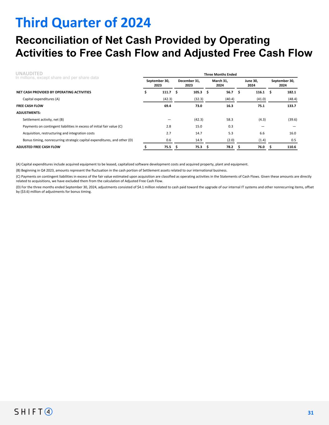Three Months Ended September 30, 2023 December 31, 2023 March 31, 2024 June 30, 2024 September 30, 2024 NET CASH PROVIDED BY OPERATING ACTIVITIES $ 111.7 $ 105.3 $ 56.7 $ 116.1 $ 182.1 Capital expenditures (A) (42.3) (32.3) (40.4) (41.0) (48.4) FREE CASH FLOW 69.4 73.0 16.3 75.1 133.7 ADJUSTMENTS: Settlement activity, net (B) — (42.3) 58.3 (4.3) (39.6) Payments on contingent liabilities in excess of initial fair value (C) 2.8 15.0 0.3 — — Acquisition, restructuring and integration costs 2.7 14.7 5.3 6.6 16.0 Bonus timing, nonrecurring strategic capital expenditures, and other (D) 0.6 14.9 (2.0) (1.4) 0.5 ADJUSTED FREE CASH FLOW $ 75.5 $ 75.3 $ 78.2 $ 76.0 $ 110.6 Reconciliation of Net Cash Provided by Operating Activities to Free Cash Flow and Adjusted Free Cash Flow UNAUDITED In millions, except share and per share data Third Quarter of 2024 (A) Capital expenditures include acquired equipment to be leased, capitalized software development costs and acquired property, plant and equipment. (B) Beginning in Q4 2023, amounts represent the fluctuation in the cash portion of Settlement assets related to our international business. (C) Payments on contingent liabilities in excess of the fair value estimated upon acquisition are classified as operating activities in the Statements of Cash Flows. Given these amounts are directly related to acquisitions, we have excluded them from the calculation of Adjusted Free Cash Flow. (D) For the three months ended September 30, 2024, adjustments consisted of $4.1 million related to cash paid toward the upgrade of our internal IT systems and other nonrecurring items, offset by ($3.6) million of adjustments for bonus timing. 3 1 31