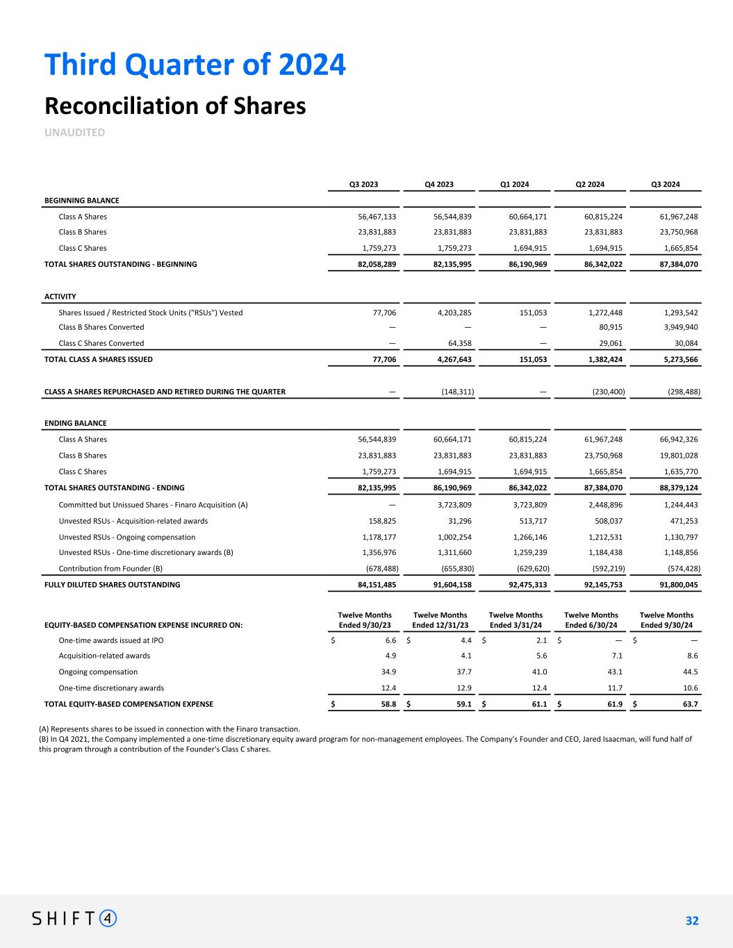 Third Quarter of 2024 Reconciliation of Shares UNAUDITED Q3 2023 Q4 2023 Q1 2024 Q2 2024 Q3 2024 BEGINNING BALANCE Class A Shares 56,467,133 56,544,839 60,664,171 60,815,224 61,967,248 Class B Shares 23,831,883 23,831,883 23,831,883 23,831,883 23,750,968 Class C Shares 1,759,273 1,759,273 1,694,915 1,694,915 1,665,854 TOTAL SHARES OUTSTANDING - BEGINNING 82,058,289 82,135,995 86,190,969 86,342,022 87,384,070 ACTIVITY Shares Issued / Restricted Stock Units ("RSUs") Vested 77,706 4,203,285 151,053 1,272,448 1,293,542 Class B Shares Converted — — — 80,915 3,949,940 Class C Shares Converted — 64,358 — 29,061 30,084 TOTAL CLASS A SHARES ISSUED 77,706 4,267,643 151,053 1,382,424 5,273,566 CLASS A SHARES REPURCHASED AND RETIRED DURING THE QUARTER — (148,311) — (230,400) (298,488) ENDING BALANCE Class A Shares 56,544,839 60,664,171 60,815,224 61,967,248 66,942,326 Class B Shares 23,831,883 23,831,883 23,831,883 23,750,968 19,801,028 Class C Shares 1,759,273 1,694,915 1,694,915 1,665,854 1,635,770 TOTAL SHARES OUTSTANDING - ENDING 82,135,995 86,190,969 86,342,022 87,384,070 88,379,124 Committed but Unissued Shares - Finaro Acquisition (A) — 3,723,809 3,723,809 2,448,896 1,244,443 Unvested RSUs - Acquisition-related awards 158,825 31,296 513,717 508,037 471,253 Unvested RSUs - Ongoing compensation 1,178,177 1,002,254 1,266,146 1,212,531 1,130,797 Unvested RSUs - One-time discretionary awards (B) 1,356,976 1,311,660 1,259,239 1,184,438 1,148,856 Contribution from Founder (B) (678,488) (655,830) (629,620) (592,219) (574,428) FULLY DILUTED SHARES OUTSTANDING 84,151,485 91,604,158 92,475,313 92,145,753 91,800,045 EQUITY-BASED COMPENSATION EXPENSE INCURRED ON: Twelve Months Ended 9/30/23 Twelve Months Ended 12/31/23 Twelve Months Ended 3/31/24 Twelve Months Ended 6/30/24 Twelve Months Ended 9/30/24 One-time awards issued at IPO $ 6.6 $ 4.4 $ 2.1 $ — $ — Acquisition-related awards 4.9 4.1 5.6 7.1 8.6 Ongoing compensation 34.9 37.7 41.0 43.1 44.5 One-time discretionary awards 12.4 12.9 12.4 11.7 10.6 TOTAL EQUITY-BASED COMPENSATION EXPENSE $ 58.8 $ 59.1 $ 61.1 $ 61.9 $ 63.7 (A) Represents shares to be issued in connection with the Finaro transaction. (B) In Q4 2021, the Company implemented a one-time discretionary equity award program for non-management employees. The Company's Founder and CEO, Jared Isaacman, will fund half of this program through a contribution of the Founder's Class C shares. 3 2 32