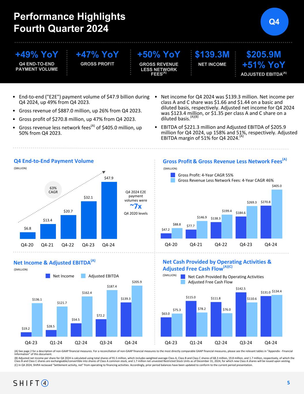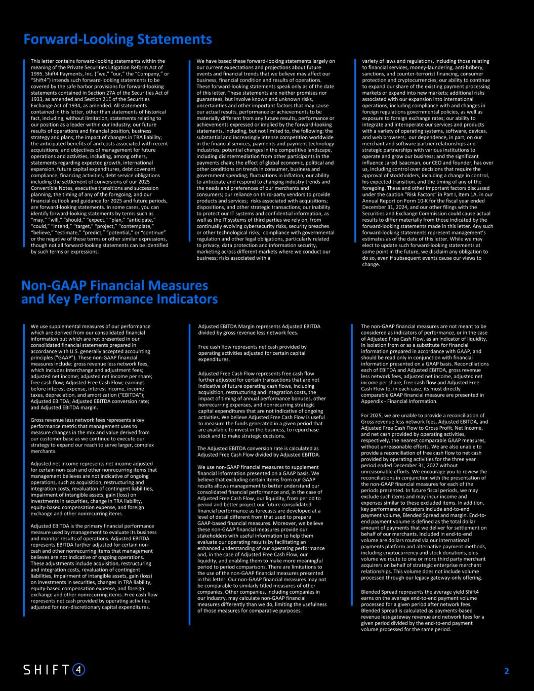Non-GAAP Financial Measures and Key Performance Indicators Forward-Looking Statements We use supplemental measures of our performance which are derived from our consolidated financial information but which are not presented in our consolidated financial statements prepared in accordance with U.S. generally accepted accounting principles ("GAAP"). These non-GAAP financial measures include: gross revenue less network fees, which includes interchange and adjustment fees; adjusted net income; adjusted net income per share; free cash flow; Adjusted Free Cash Flow; earnings before interest expense, interest income, income taxes, depreciation, and amortization (“EBITDA”); Adjusted EBITDA; Adjusted EBITDA conversion rate; and Adjusted EBITDA margin. Gross revenue less network fees represents a key performance metric that management uses to measure changes in the mix and value derived from our customer base as we continue to execute our strategy to expand our reach to serve larger, complex merchants. Adjusted net income represents net income adjusted for certain non-cash and other nonrecurring items that management believes are not indicative of ongoing operations, such as acquisition, restructuring and integration costs, revaluation of contingent liabilities, impairment of intangible assets, gain (loss) on investments in securities, change in TRA liability, equity-based compensation expense, and foreign exchange and other nonrecurring items. Adjusted EBITDA is the primary financial performance measure used by management to evaluate its business and monitor results of operations. Adjusted EBITDA represents EBITDA further adjusted for certain non- cash and other nonrecurring items that management believes are not indicative of ongoing operations. These adjustments include acquisition, restructuring and integration costs, revaluation of contingent liabilities, impairment of intangible assets, gain (loss) on investments in securities, changes in TRA liability, equity-based compensation expense, and foreign exchange and other nonrecurring items. Free cash flow represents net cash provided by operating activities adjusted for non-discretionary capital expenditures. Adjusted EBITDA Margin represents Adjusted EBITDA divided by gross revenue less network fees. Free cash flow represents net cash provided by operating activities adjusted for certain capital expenditures. Adjusted Free Cash Flow represents free cash flow further adjusted for certain transactions that are not indicative of future operating cash flows, including acquisition, restructuring and integration costs, the impact of timing of annual performance bonuses, other nonrecurring expenses, and nonrecurring strategic capital expenditures that are not indicative of ongoing activities. We believe Adjusted Free Cash Flow is useful to measure the funds generated in a given period that are available to invest in the business, to repurchase stock and to make strategic decisions. The Adjusted EBITDA conversion rate is calculated as Adjusted Free Cash Flow divided by Adjusted EBITDA. We use non-GAAP financial measures to supplement financial information presented on a GAAP basis. We believe that excluding certain items from our GAAP results allows management to better understand our consolidated financial performance and, in the case of Adjusted Free Cash Flow, our liquidity, from period to period and better project our future consolidated financial performance as forecasts are developed at a level of detail different from that used to prepare GAAP-based financial measures. Moreover, we believe these non-GAAP financial measures provide our stakeholders with useful information to help them evaluate our operating results by facilitating an enhanced understanding of our operating performance and, in the case of Adjusted Free Cash Flow, our liquidity, and enabling them to make more meaningful period to period comparisons. There are limitations to the use of the non-GAAP financial measures presented in this letter. Our non-GAAP financial measures may not be comparable to similarly titled measures of other companies. Other companies, including companies in our industry, may calculate non-GAAP financial measures differently than we do, limiting the usefulness of those measures for comparative purposes. We have based these forward-looking statements largely on our current expectations and projections about future events and financial trends that we believe may affect our business, financial condition and results of operations. These forward-looking statements speak only as of the date of this letter. These statements are neither promises nor guarantees, but involve known and unknown risks, uncertainties and other important factors that may cause our actual results, performance or achievements to be materially different from any future results, performance or achievements expressed or implied by the forward-looking statements, including, but not limited to, the following: the substantial and increasingly intense competition worldwide in the financial services, payments and payment technology industries; potential changes in the competitive landscape, including disintermediation from other participants in the payments chain; the effect of global economic, political and other conditions on trends in consumer, business and government spending; fluctuations in inflation; our ability to anticipate and respond to changing industry trends and the needs and preferences of our merchants and consumers; our reliance on third-party vendors to provide products and services; risks associated with acquisitions; dispositions, and other strategic transactions; our inability to protect our IT systems and confidential information, as well as the IT systems of third parties we rely on, from continually evolving cybersecurity risks, security breaches or other technological risks; compliance with governmental regulation and other legal obligations, particularly related to priv