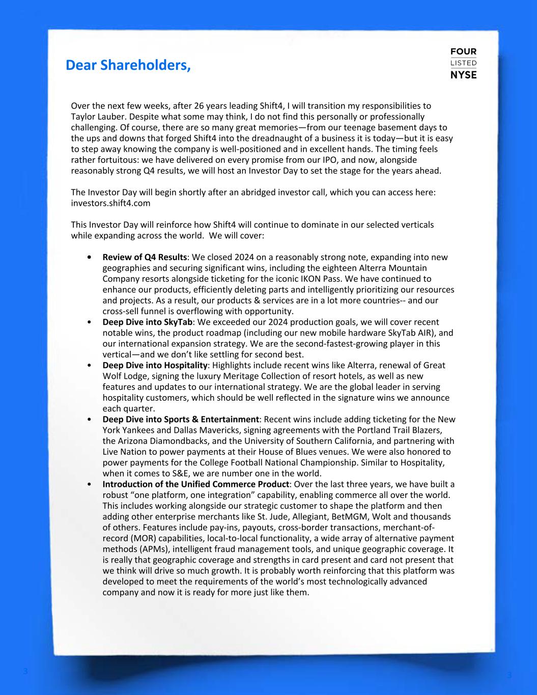 We wrapped up another reasonably strong quarter, executing well on our strategy – growing rapidly and profitably, generating free cash flow, improving our products, unlocking efficiencies, enhancing our capital structure and, most importantly, topping off what has become an impressive customer conversion funnel. To be concise, I want to break down what we accomplished this quarter and highlight what we still have going for us as we aim for even greater performance on the road ahead. Q3 Accomplishments • Despite accelerating some of the revenue model rebuild in our recent acquisitions and facing some softening consumer spending, we delivered record Volume of 43.5 Billion, $365 million of GRLNF, $187 million of EBITDA, $111 million of FCF, while maintaining spreads of 60bps. • Adjusted net leverage was____ and we rebuilt our capital structure with new ____ providing substantial firepower for organic and inorganic investments as well as opportunistic buybacks. • Expanded margins to 54% excluding recent M&A drag. • Achieved major hospitality wins, including securing deals with [Wynn Resorts and] KSL Resorts, which encompasses 40 iconic properties like Blue Mountain, Camelback, Deer Valley, and all the Hawaiian Outrigger brands. [We further won Alterra ___ ] • The sports, entertainment, and ticketing wins keep piling up including _______ stadiums. • Grew Skytab system installations quarter-over-quarter _______, including ramping production in the UK and Ireland. • Followed our strategic customers into ____ new countries with many more lined up for the balance of the year. • Pulled forward the Revel and Vectron integration plan and began executing on the Vectron 65,000 merchant conversion opportunity across central Europe, with our first installs already taking place. • Announced the acquisition of Givex, expected to close in Q4, adding over 120,000 new gift and loyalty customers, representing what we believe to be over $300 billion in payment volume cross-sell opportunity. This acquisition also brings product enhancements through a best-in-class gift and loyalty platform. • Increased contracted volume backlog to $30B. • We remain on track to close the year with organic GRLNF exceeding 25% and easily surpassing all mid-term outlook goals set more than three years ago. Dear Shareholders, 3 3 Jared Isaacman CEO jared@shift4.com V7 - DRAFTS CIRCULATED VIA EMAIL (WORD DOC) Over the next few weeks, after 26 years leading Shift4, I will transition my responsibilities to Taylor Lauber. Despite what some may think, I do not find this personally or professionally challenging. Of course, there are so many great memories—from our teenage basement days to the ups and downs that forged Shift4 into the dreadnaught of a business it is today—but it is easy to step away knowing the company is well-positioned and in excellent hands. The timing feels rather fortuitous: e have delivered on every promise from our IPO, and now, alo gside reasonably s rong Q4 results, we will host an Investor Day to s t the stage for the years ahead. The Investor Day will begin shortly after an abridged investor call, which you can access here: investors.shift4.com This Investor Day will reinforce how Shift4 will continue to dominate in our selected verticals while expanding across the world. We will cover: • Review of Q4 Results: We closed 2024 on a reasonably strong note, expanding into new geographies and securing significant wins, including the eighteen Alterra Mountain Company resorts alongside ticketing for th iconic IKON P ss. We have continued to enhance our products, e ficiently deleting p rts nd intellige tly prioritizing our resources and rojects. As a result, our products & services are in a lot more countries-- and our cross-sell funnel is overflowing with opportunity. • Deep Dive into SkyTab: We exceeded our 2024 production goals, we will cover recent notable wins, the product roadmap (including our new mobile hardware SkyTab AIR), and our international expansion strategy. We are the second-fastest-growing player in this vertical—and we don’t like settling for second best. • Deep Dive into Hospitality: Highlights include recent wins like Alterra, renewal of Great Wolf Lodge, signing the luxury Meritage Collection of resort hotels, as well as new features and updates to our international strategy. We are the global leader in serving hospitality customers, which should be well reflected in the signature wins we announce each q arter. • Deep Dive into Spor s & Entertainment: Recent wins incl de adding ticketing for the New York Yanke s nd Dallas Mavericks, signing agreements with the Portland Trail Blazers, the Arizona Diamondbacks, and the University of Southern C lifornia, a d partnering wit Live Nation to power payments at their House of Blues venues. We were also honored to power payments for the College Football National Championship. Similar to Hospitality, when it comes to S&E, we are number one in the world. • Introduction of the Unified Commerce Product: Over the last three years, we have built a robust “one platform, one integration” capability, enabling commerce all over the world. This includes working alongside our strategic customer to shape the platform and then adding other enterprise merchants like St. Jude, Allegiant, BetMGM, Wolt and thousands of others. Features include pay-ins, payouts, cross-border transactions, merchant-of- record (MOR) capabilities, local-to-local functionality, a wide array of alternative payment method (APM ), inte ligent fraud management tools, and unique geographic coverage. It is really that geographic coverage and strengths in card present and card not present that we think will drive so much growth. It is probably worth reinforcing that this platform was developed to meet the requirements of the world’s most technologically advanced company and now it is ready for more just like them.