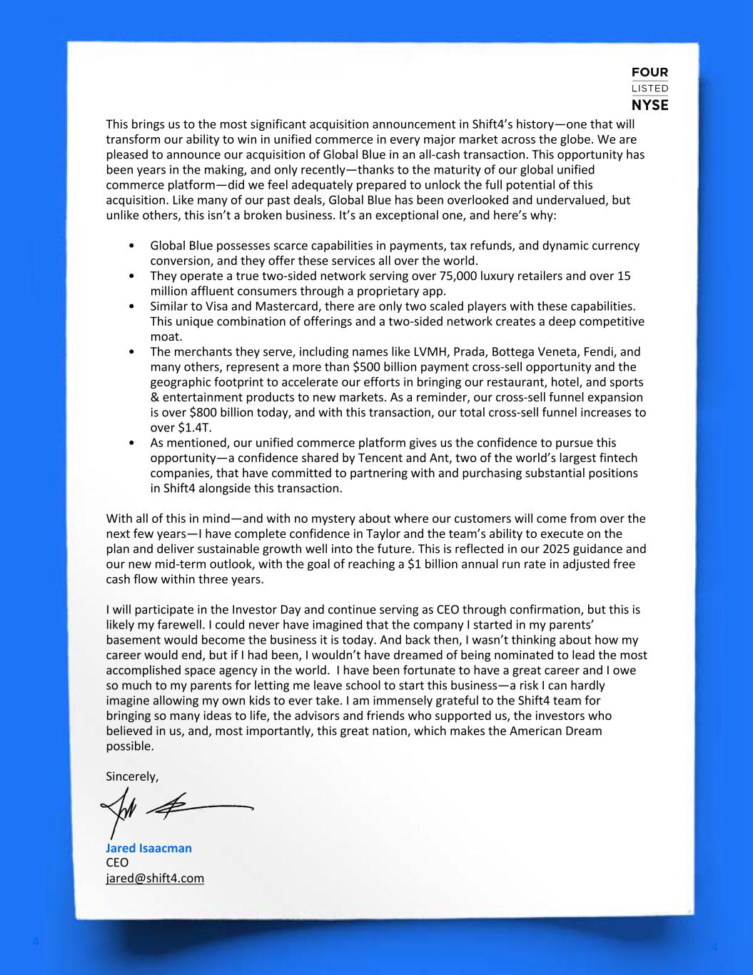 4 4 This brings us to the most significant acquisition announcement in Shift4’s history—one that will transform our ability to win in unified commerce in every major market across the globe. We are pleased to announce our acquisition of Global Blue in an all-cash transaction. This opportunity has been years in the making, and only recently—thanks to the maturity of our global unified commerce platform—did we feel adequately prepared to unlock the full potential of this acquisition. Like many of our past deals, Global Blue has been overlooked and undervalued, but unlike others, this isn’t a broken business. It’s an exceptional one, and here’s why: • Global Blue possesses scarce capabilities in payments, tax refunds, and dynamic currency conversion, and they offer these services all over the world. • They operate a true two-sided network serving over 75,000 luxury retailers and over 15 million affluent consumers through a proprietary app. • Similar to Visa and Mastercard, there are only two scaled players with these capabilities. This unique combination of offerings and a two-sided network creates a deep competitive moat. • The merchants they serve, including names like LVMH, Prada, Bottega Veneta, Fendi, and many others, represent a more than $500 billion payment cross-sell opportunity and the geographic footprint to accelerate our efforts in bringing our restaurant, hotel, and sports & entertainment products to new markets. As a reminder, our cross-sell funnel expansion is over $800 billion today, and with this transaction, our total cross-sell funnel increases to over $1.4T. • As mentioned, our unified commerce platform gives us the confidence to pursue this opportunity—a confidence shared by Tencent and Ant, two of the world’s largest fintech companies, that have committed to partnering with and purchasing substantial positions in Shift4 alongside this transaction. With all of this in mind—and with no mystery about where our customers will come from over the next few years—I have complete confidence in Taylor and the team’s ability to execute on the plan and deliver sustainable growth well into the future. This is reflected in our 2025 guidance and our new mid-term outlook, with the goal of reaching a $1 billion annual run rate in adjusted free cash flow within three years. I will participate in the Investor Day and continue serving as CEO through confirmation, but this is likely my farewell. I could never have imagined that the company I started in my parents’ basement would become the business it is today. And back then, I wasn’t thinking about how my career would end, but if I had been, I wouldn’t have dreamed of being nominated to lead the most accomplished space agency in the world. I have been fortunate to have a great career and I owe so much to my parents for letting me leave school to start this business—a risk I can hardly imagine allowing my own kids to ever take. I am immensely grateful to the Shift4 team for bringing so many ideas to life, the advisors and friends who supported us, the investors who believed in us, and, most importantly, this great nation, which makes the American Dream possible. Sincerely, Jared Isaacman CEO jared@shift4.com V7 - DRAFTS CIRCULATED VIA EMAIL (WORD DOC)