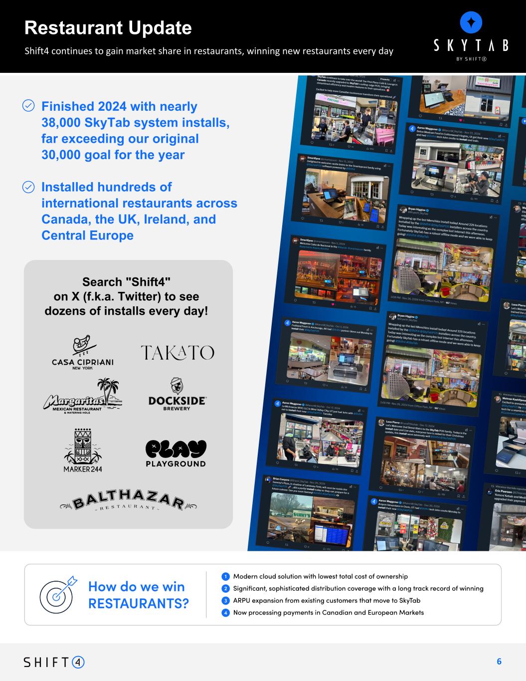 6 Over 55,000 Search "Shift4" on X (f.k.a. Twitter) to see dozens of installs every day! since coming out of beta, and on pace to exceed 35,000 installs in 2024 alone SkyTab installs Shift4 continues to gain market share in restaurants, winning new restaurants every day Restaurant Update LOGOS: Casa Cipriani Club** (highlight somehow Village Tavern Play PlayGround WATERMARC MANAGEMENT LLC Margaritas Takato Alamo Alehouse Gourmet Burgers Bar Dockside Brewery Marker 244 ++ Twitter screenshots BULLETS: – Finished 2024 with XXX SkyTab system installs – Installed XXX international restaurants across Canada, the UK, Ireland, and Central Europe – Reference X for daily updates Finished 2024 with nearly 38,000 SkyTab system installs, far exceeding our original 30,000 goal for the year Installed hundreds of international restaurants across Canada, the UK, Ireland, and Central Europe logos colornless / B&W