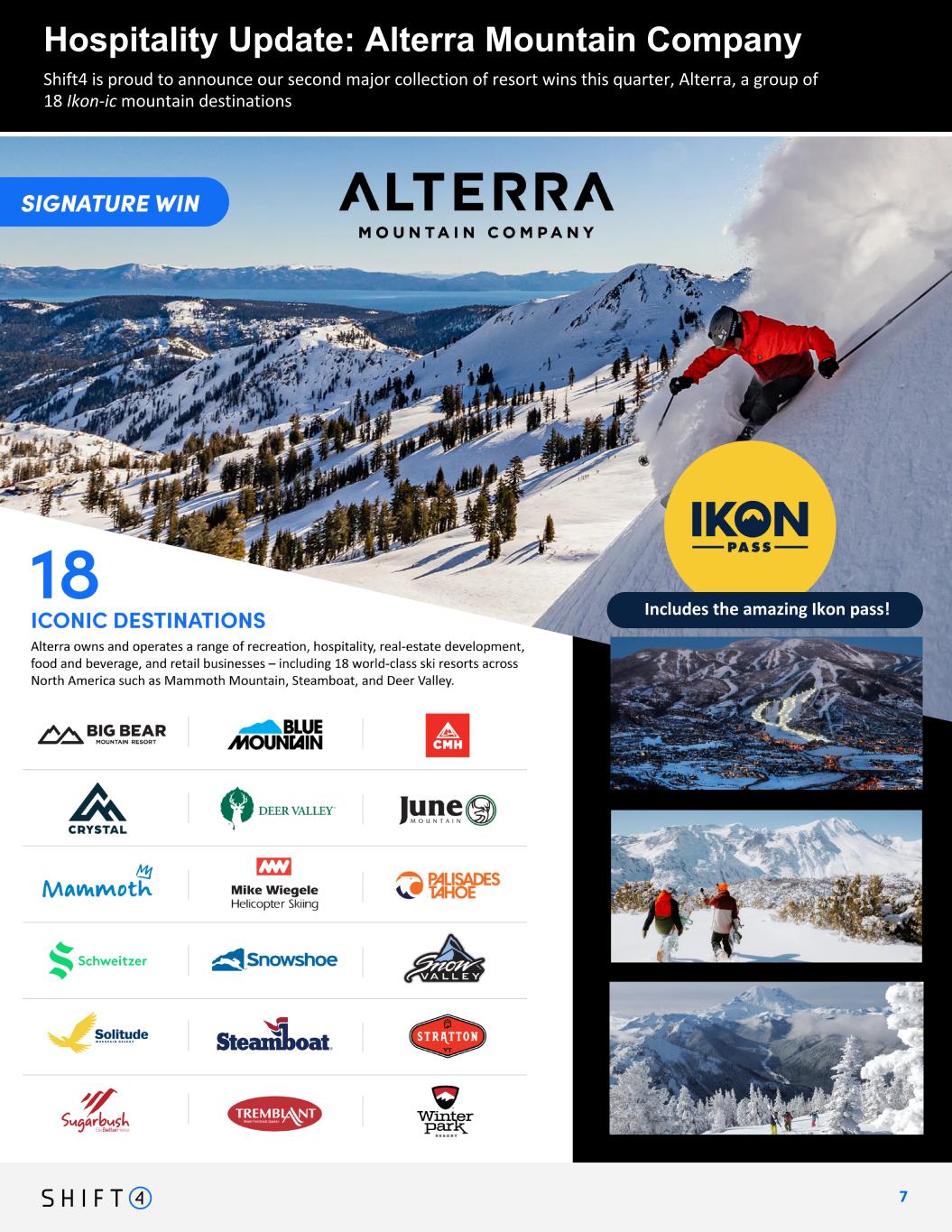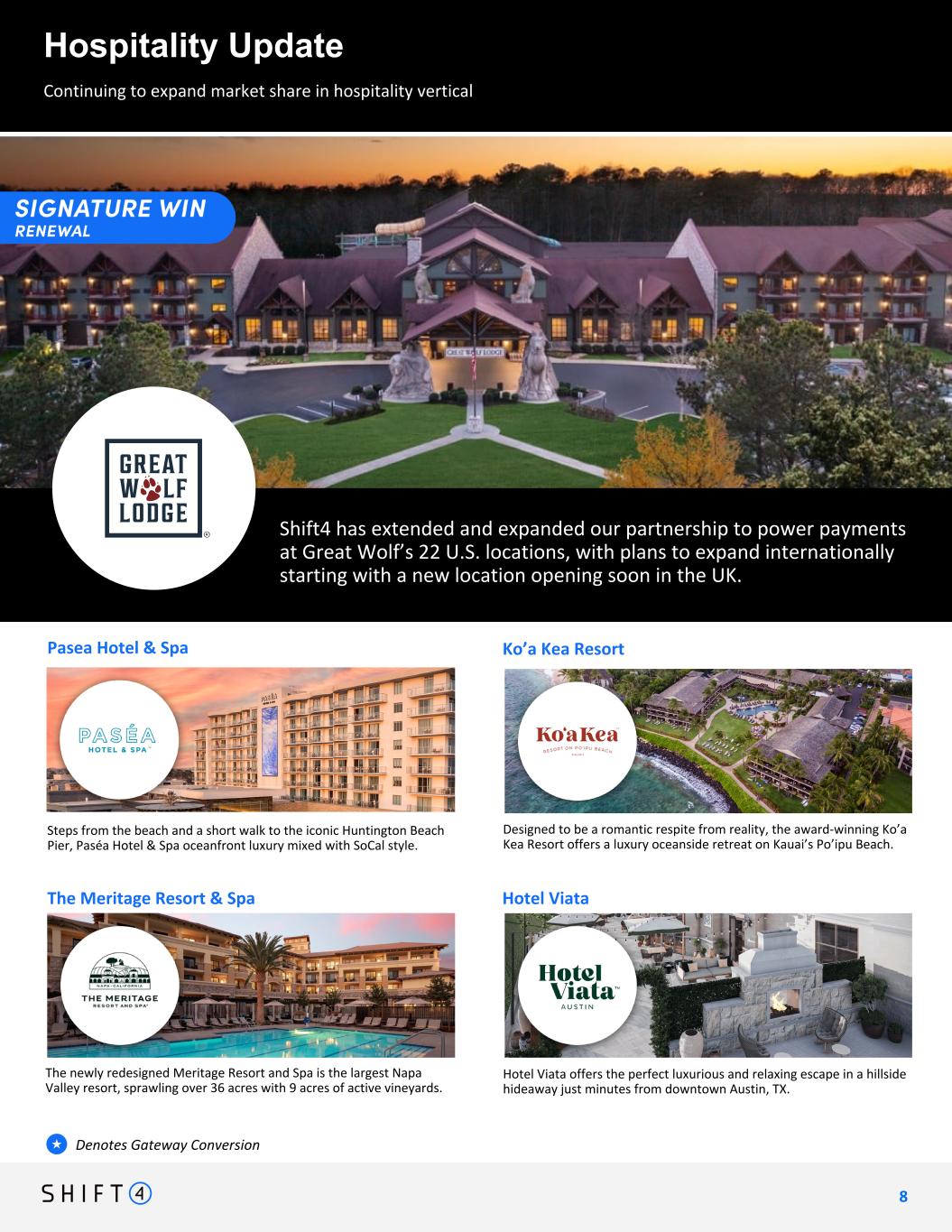 Continuing to expand market share in hospitality vertical Hospitality Update: Alterra Mountain Company 7 7 Shift4 is proud to announce our second major collection of resort wins this quarter, Alterra, a group of 18 Ikon-ic mountain destinations Includes the amazing Ikon pass!