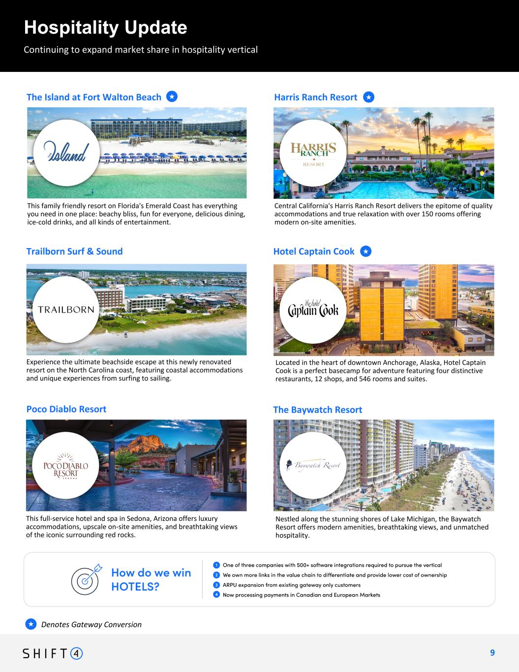 Continuing to expand market share in hospitality vertical Hospitality Update 8 8 Shift4 has extended and expanded our partnership to power payments at Great Wolf’s 22 U.S. locations, with plans to expand internationally starting with a new location opening soon in the UK. top half: auberge resorts (2 resorts: bishops lodge + auberge du soleil) - signature win - with more to come! bottom half: great wolf resorts — signature win - renewal! Designed to be a romantic respite from reality, the award-winning Ko’a Kea Resort offers a luxury oceanside retreat on Kauai’s Po’ipu Beach. Ko’a Kea Resort The newly redesigned Meritage Resort and Spa is the largest Napa Valley resort, sprawling over 36 acres with 9 acres of active vineyards. The Meritage Resort & Spa Hotel Viata offers the perfect luxurious and relaxing escape in a hillside hideaway just minutes from downtown Austin, TX. Hotel Viata Steps from the beach and a short walk to the iconic Huntington Beach Pier, Paséa Hotel & Spa oceanfront luxury mixed with SoCal style. Pasea Hotel & Spa Denotes Gateway Conversion★ Continuing to expand arket share in hospitality vertical WIP