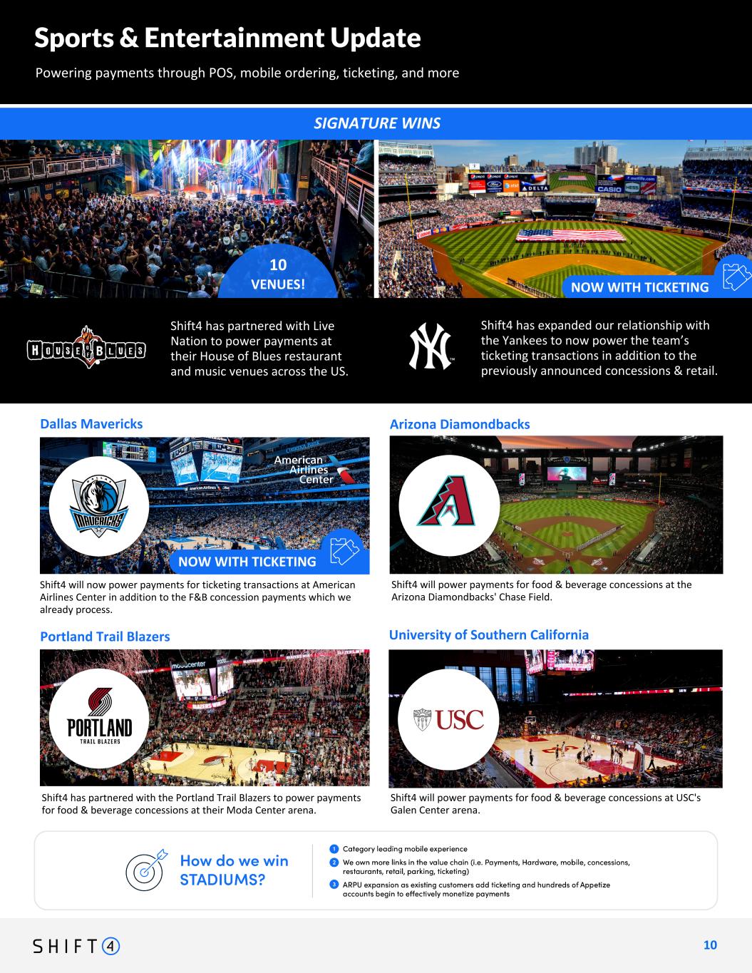 American Airlines Center Chicago White Sox SIGNATURE WINS 10 VENUES! Sports & Entertainment Update Powering payments through POS, mobile ordering, ticketing, and more 1 0 10 University of Southern California Arizona Diamondbacks Shift4 has partnered with the Portland Trail Blazers to power payments for food & beverage concessions at their Moda Center arena. Dallas Mavericks Portland Trail Blazers Shift4 will power payments for food & beverage concessions at USC's Galen Center arena. NOW WITH TICKETING Shift4 will now power payments for ticketing transactions at American Airlines Center in addition to the F&B concession payments which we already process. highlight: house of blues (somewhere splash "10 venues!") four others: ny yankees "now with ticketing!" arizona diamondbacks moda center (portland trail blazers) galen center (USC) Shift4 will power payments for food & beverage concessions at the Arizona Diamondbacks' Chase Field. NOW WITH TICKETING Shift4 has expanded our relationship with the Yankees to now power the team’s ticketing transactions in addition to the previously announced concessions & retail. Shift4 has partnered with Live Nation to power payments at their House of Blues restaurant and music venues across the US.