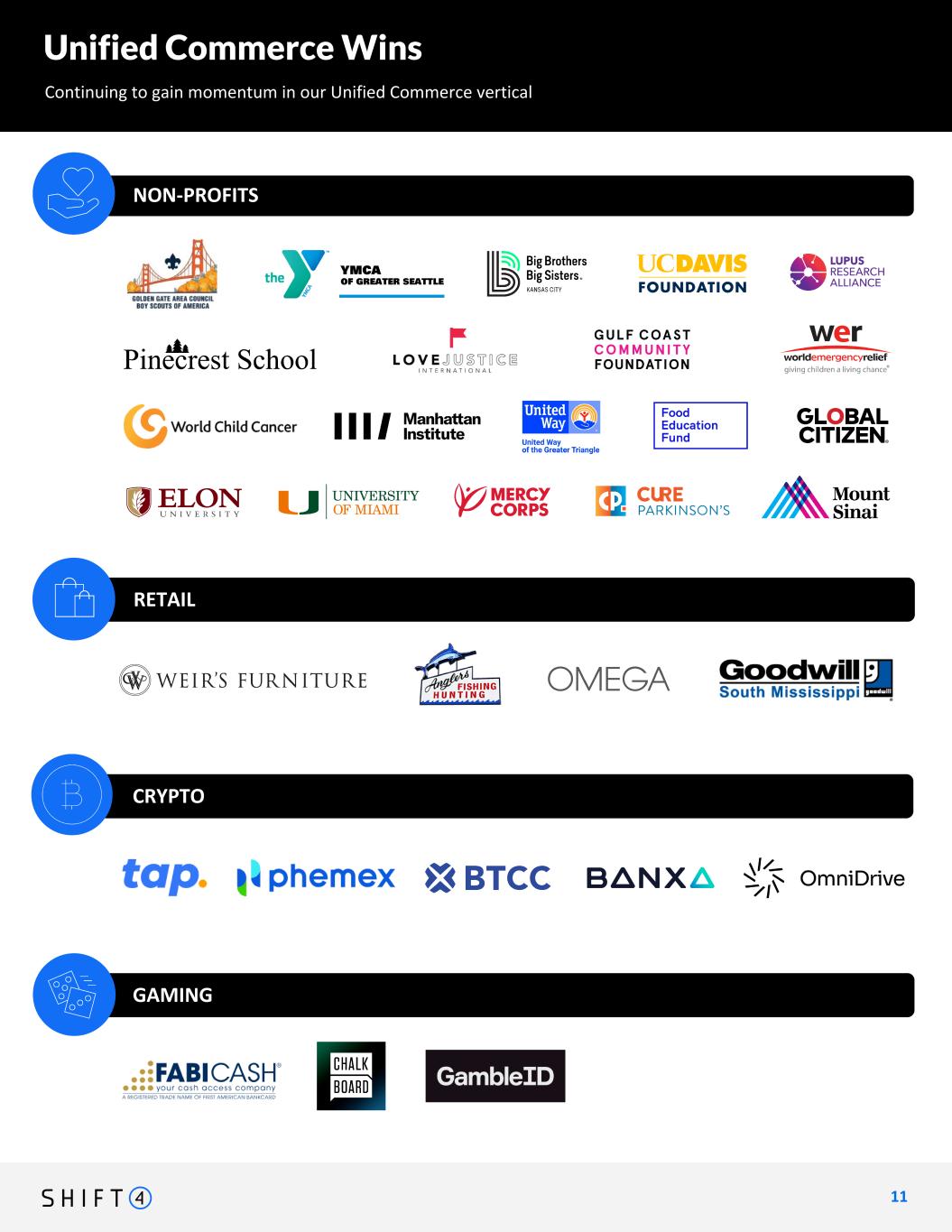 Unified Commerce Wins Continuing to gain momentum in our Unified Commerce vertical 1 1 11 NON-PROFITS CRYPTO GAMING RETAIL We expect to be live in all 24 sportsbook locations by year end Retail: Weir's Furniture Anglers Sports Center Omega Institute for Holistic Studies Goodwill of S Mississippi Gaming: FABI Cash America Inc. Chalkboard Fantasy Sports GambleID Non-Profits: (have 70+ to choose from - leave space for ~10-15 logos here Crypto: TAP Global, Phemex, BTCC, Banxa, Omnidrive WIP Boy Scouts of America - Golden Gate Area Council YMCA of Greater Seattle Big Brothers Big Sisters Kansas City The UC Davis Foundation Pine Crest School Love Justice International Gulf Coast Community Foundation World Emergency Relief Lupus Research Alliance World Child Cancer Manhattan Institute for Policy Research United Way of the Greater Triangle Food Education Fund Elon University University of Miami Mercy Corps Europe Cure Parkinson's Mount Sinai Medical Center Global Citizen