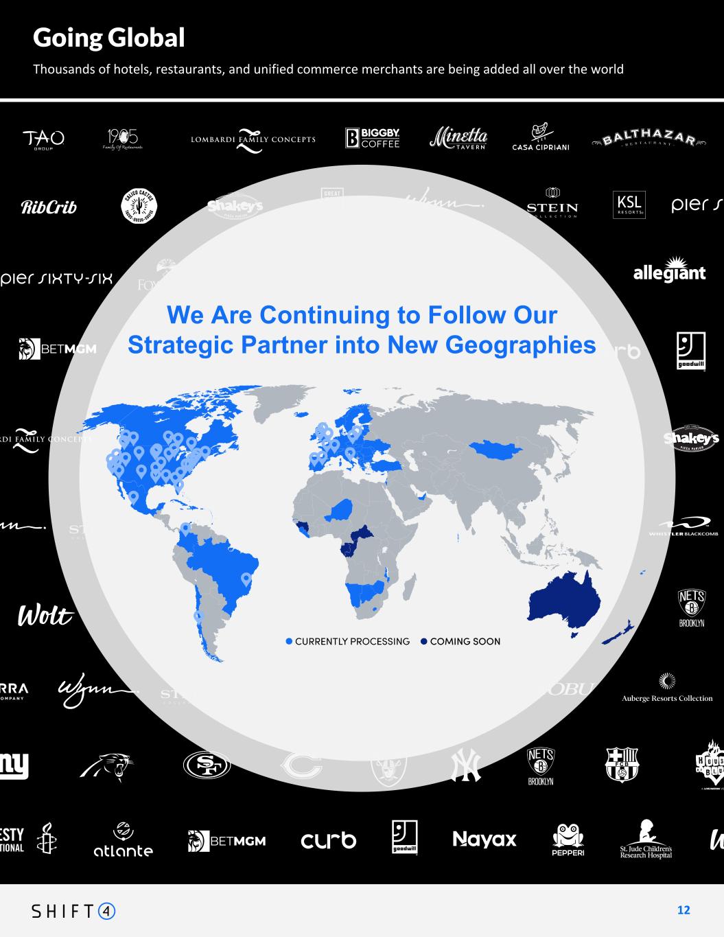 Shift4 continues to move Boldly Forward towards becoming a truly global company 1 2 12 Magnuson is a global network of individually owned hotels, connecting independent hotel properties with travelers across all destinations. Now Live Now Processing in 2024 Notable International Wins in Our Key Verticals Xolvis digitizes customer communication and online payments, using software for auto workshops, craftsmen, bicycle workshops and MRO. Klass Wagen is a national car rentals leader for leisure travel, active in Romania and Hungary. Part of the Royal British Legion, Poppy Appeal provides support to the UK Armed forces in 6 key areas: financial support, advice, employment, mobility, housing and mental health. An Online Travel Agency that has introduced a new, personalized, and dynamic, holiday packages booking experience. The RNLI, a charity based in Poole England, is the largest lifeboat services operating around the coasts of the United Kingdom, the Republic of Ireland, the Channel Islands and the Isle of Man. Coming Soon One of Winnipeg's architectural landmarks, the Fort Garry Hotel, Spa and Conference Centre is second to none in service, luxury, and location. CURB - UK WOLT - EURO CONTINENTAL NOBU - CANADA (TORONTO) CASA CIPRIANI - NEW YORK GREAT WOLF LODGE - MIDWEST ISH AUBREGE - WEST COAST Going Global We Are Continuing to Follow Our Strategic Partner into New Geographies Thousands of hotels, restaurants, and unified commerce merchants are being added all over the world