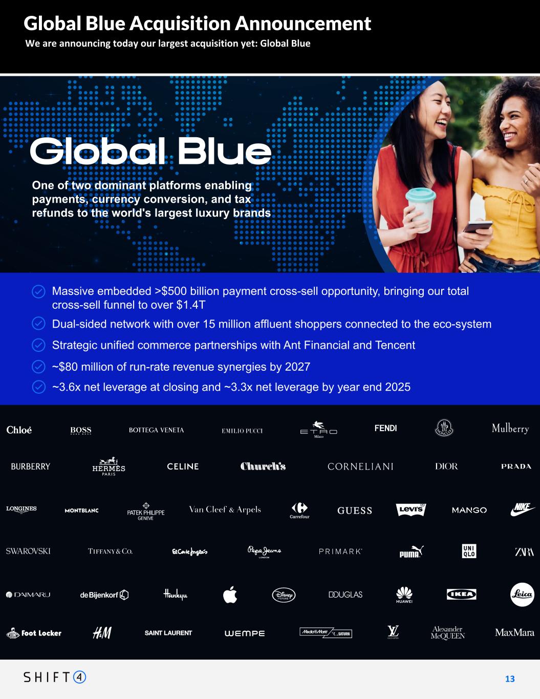 We are announcing today our largest acquisition yet: Global Blue 1 3 13 Massive embedded >$500 billion payment cross-sell opportunity Dual-sided network with over 15 million affluent shoppers connected to the eco-system ~$80 million of run- rate revenue synergies by 2027 [Strategic e-commerce partnerships with Ant Financial and Tencent] Global Blue Acquisition Announcement Shift4 Playbook/Key Points: One of two dominant platforms enabling payments, currency conversion, and tax refunds to the world's largest luxury brands Massive embedded >$500 billion payment cross-sell opportunity, bringing our total cross-sell funnel to over $1.4T Dual-sided network with over 15 million affluent shoppers connected to the eco-system ~$80 million of run-rate revenue synergies by 2027 Strategic unified commerce partnerships with Ant Financial and Tencent ~3.6x net leverage at closing and ~3.3x net leverage by year end 2025