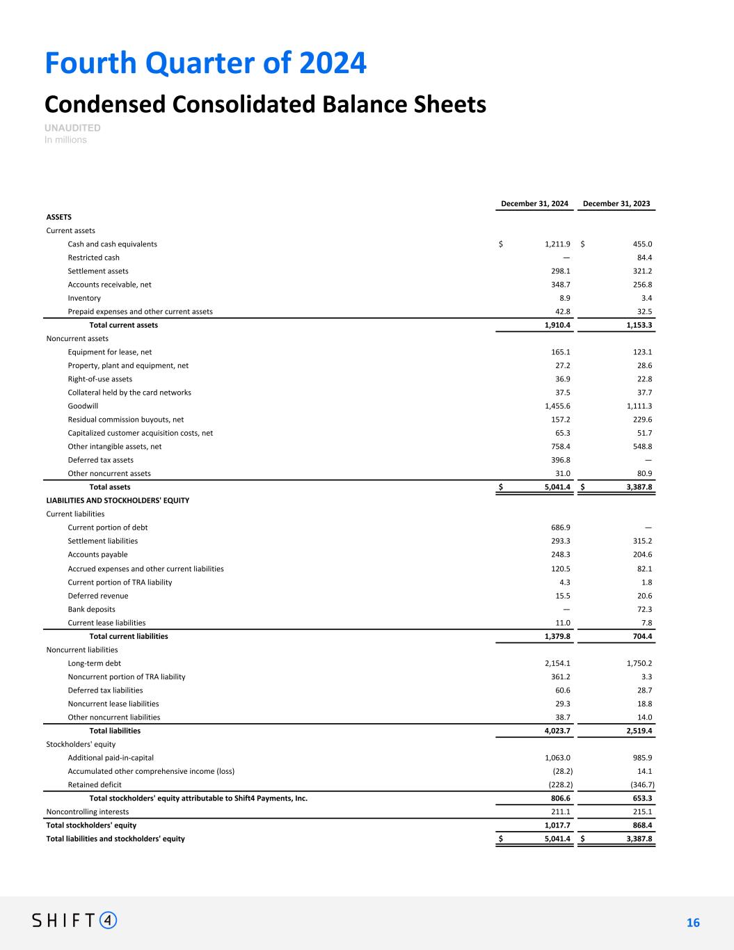 Fourth Quarter of 2024 Condensed Consolidated Balance Sheets UNAUDITED In millions December 31, 2024 December 31, 2023 ASSETS Current assets Cash and cash equivalents $ 1,211.9 $ 455.0 Restricted cash — 84.4 Settlement assets 298.1 321.2 Accounts receivable, net 348.7 256.8 Inventory 8.9 3.4 Prepaid expenses and other current assets 42.8 32.5 Total current assets 1,910.4 1,153.3 Noncurrent assets Equipment for lease, net 165.1 123.1 Property, plant and equipment, net 27.2 28.6 Right-of-use assets 36.9 22.8 Collateral held by the card networks 37.5 37.7 Goodwill 1,455.6 1,111.3 Residual commission buyouts, net 157.2 229.6 Capitalized customer acquisition costs, net 65.3 51.7 Other intangible assets, net 758.4 548.8 Deferred tax assets 396.8 — Other noncurrent assets 31.0 80.9 Total assets $ 5,041.4 $ 3,387.8 LIABILITIES AND STOCKHOLDERS' EQUITY Current liabilities Current portion of debt 686.9 — Settlement liabilities 293.3 315.2 Accounts payable 248.3 204.6 Accrued expenses and other current liabilities 120.5 82.1 Current portion of TRA liability 4.3 1.8 Deferred revenue 15.5 20.6 Bank deposits — 72.3 Current lease liabilities 11.0 7.8 Total current liabilities 1,379.8 704.4 Noncurrent liabilities Long-term debt 2,154.1 1,750.2 Noncurrent portion of TRA liability 361.2 3.3 Deferred tax liabilities 60.6 28.7 Noncurrent lease liabilities 29.3 18.8 Other noncurrent liabilities 38.7 14.0 Total liabilities 4,023.7 2,519.4 Stockholders' equity Additional paid-in-capital 1,063.0 985.9 Accumulated other comprehensive income (loss) (28.2) 14.1 Retained deficit (228.2) (346.7) Total stockholders' equity attributable to Shift4 Payments, Inc. 806.6 653.3 Noncontrolling interests 211.1 215.1 Total stockholders' equity 1,017.7 868.4 Total liabilities and stockholders' equity $ 5,041.4 $ 3,387.8 1 6 16
