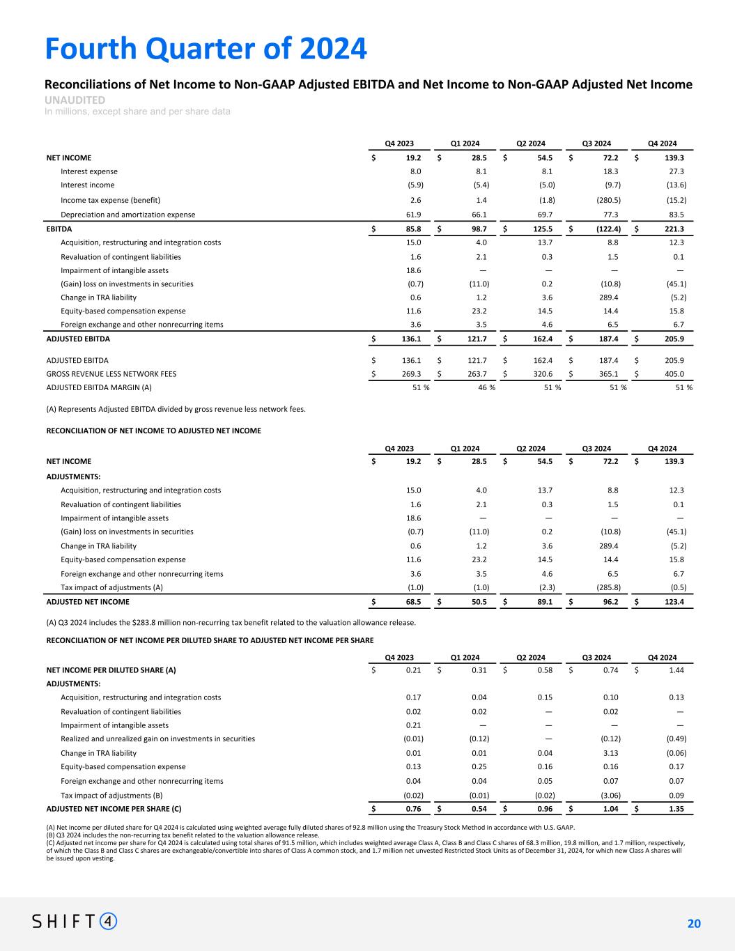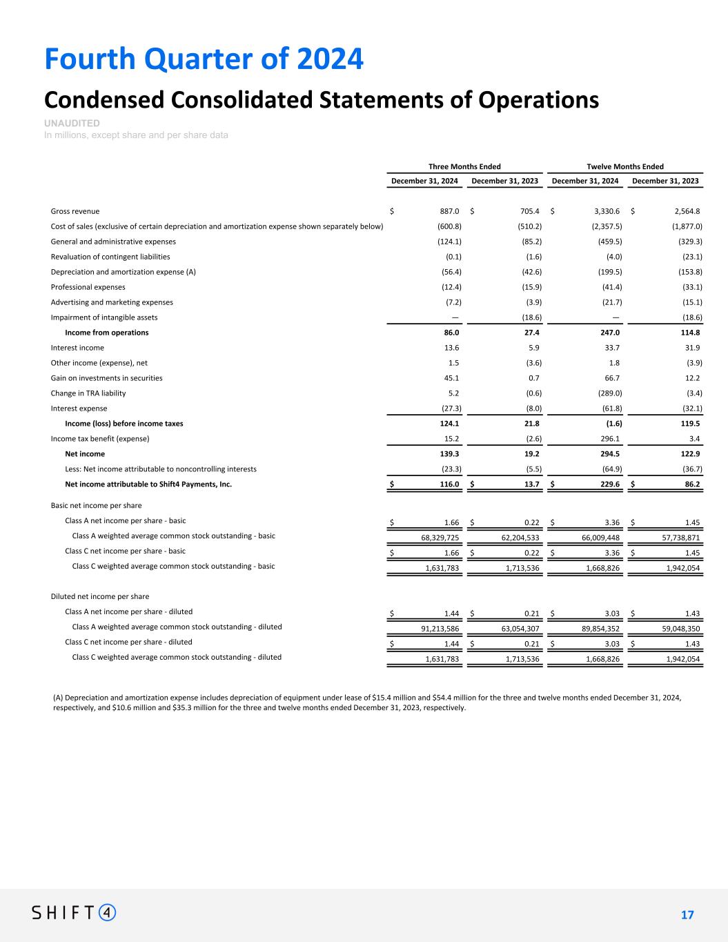 Fourth Quarter of 2024 Condensed Consolidated Statements of Operations UNAUDITED In millions, except share and per share data Three Months Ended Twelve Months Ended December 31, 2024 December 31, 2023 December 31, 2024 December 31, 2023 Gross revenue $ 887.0 $ 705.4 $ 3,330.6 $ 2,564.8 Cost of sales (exclusive of certain depreciation and amortization expense shown separately below) (600.8) (510.2) (2,357.5) (1,877.0) General and administrative expenses (124.1) (85.2) (459.5) (329.3) Revaluation of contingent liabilities (0.1) (1.6) (4.0) (23.1) Depreciation and amortization expense (A) (56.4) (42.6) (199.5) (153.8) Professional expenses (12.4) (15.9) (41.4) (33.1) Advertising and marketing expenses (7.2) (3.9) (21.7) (15.1) Impairment of intangible assets — (18.6) — (18.6) Income from operations 86.0 27.4 247.0 114.8 Interest income 13.6 5.9 33.7 31.9 Other income (expense), net 1.5 (3.6) 1.8 (3.9) Gain on investments in securities 45.1 0.7 66.7 12.2 Change in TRA liability 5.2 (0.6) (289.0) (3.4) Interest expense (27.3) (8.0) (61.8) (32.1) Income (loss) before income taxes 124.1 21.8 (1.6) 119.5 Income tax benefit (expense) 15.2 (2.6) 296.1 3.4 Net income 139.3 19.2 294.5 122.9 Less: Net income attributable to noncontrolling interests (23.3) (5.5) (64.9) (36.7) Net income attributable to Shift4 Payments, Inc. $ 116.0 $ 13.7 $ 229.6 $ 86.2 Basic net income per share Class A net income per share - basic $ 1.66 $ 0.22 $ 3.36 $ 1.45 Class A weighted average common stock outstanding - basic 68,329,725 62,204,533 66,009,448 57,738,871 Class C net income per share - basic $ 1.66 $ 0.22 $ 3.36 $ 1.45 Class C weighted average common stock outstanding - basic 1,631,783 1,713,536 1,668,826 1,942,054 Diluted net income per share Class A net income per share - diluted $ 1.44 $ 0.21 $ 3.03 $ 1.43 Class A weighted average common stock outstanding - diluted 91,213,586 63,054,307 89,854,352 59,048,350 Class C net income per share - diluted $ 1.44 $ 0.21 $ 3.03 $ 1.43 Class C weighted average common stock outstanding - diluted 1,631,783 1,713,536 1,668,826 1,942,054 (A) Depreciation and amortization expense includes depreciation of equipment under lease of $15.4 million and $54.4 million for the three and twelve months ended December 31, 2024, respectively, and $10.6 million and $35.3 million for the three and twelve months ended December 31, 2023, respectively. 1 7 17