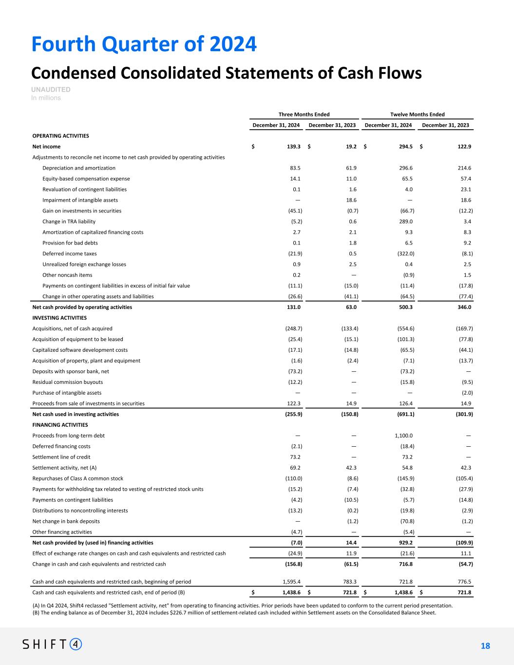 Fourth Quarter of 2024 Condensed Consolidated Statements of Cash Flows UNAUDITED In millions Three Months Ended Twelve Months Ended December 31, 2024 December 31, 2023 December 31, 2024 December 31, 2023 OPERATING ACTIVITIES Net income $ 139.3 $ 19.2 $ 294.5 $ 122.9 Adjustments to reconcile net income to net cash provided by operating activities Depreciation and amortization 83.5 61.9 296.6 214.6 Equity-based compensation expense 14.1 11.0 65.5 57.4 Revaluation of contingent liabilities 0.1 1.6 4.0 23.1 Impairment of intangible assets — 18.6 — 18.6 Gain on investments in securities (45.1) (0.7) (66.7) (12.2) Change in TRA liability (5.2) 0.6 289.0 3.4 Amortization of capitalized financing costs 2.7 2.1 9.3 8.3 Provision for bad debts 0.1 1.8 6.5 9.2 Deferred income taxes (21.9) 0.5 (322.0) (8.1) Unrealized foreign exchange losses 0.9 2.5 0.4 2.5 Other noncash items 0.2 — (0.9) 1.5 Payments on contingent liabilities in excess of initial fair value (11.1) (15.0) (11.4) (17.8) Change in other operating assets and liabilities (26.6) (41.1) (64.5) (77.4) Net cash provided by operating activities 131.0 63.0 500.3 346.0 INVESTING ACTIVITIES Acquisitions, net of cash acquired (248.7) (133.4) (554.6) (169.7) Acquisition of equipment to be leased (25.4) (15.1) (101.3) (77.8) Capitalized software development costs (17.1) (14.8) (65.5) (44.1) Acquisition of property, plant and equipment (1.6) (2.4) (7.1) (13.7) Deposits with sponsor bank, net (73.2) — (73.2) — Residual commission buyouts (12.2) — (15.8) (9.5) Purchase of intangible assets — — — (2.0) Proceeds from sale of investments in securities 122.3 14.9 126.4 14.9 Net cash used in investing activities (255.9) (150.8) (691.1) (301.9) FINANCING ACTIVITIES Proceeds from long-term debt — — 1,100.0 — Deferred financing costs (2.1) — (18.4) — Settlement line of credit 73.2 — 73.2 — Settlement activity, net (A) 69.2 42.3 54.8 42.3 Repurchases of Class A common stock (110.0) (8.6) (145.9) (105.4) Payments for withholding tax related to vesting of restricted stock units (15.2) (7.4) (32.8) (27.9) Payments on contingent liabilities (4.2) (10.5) (5.7) (14.8) Distributions to noncontrolling interests (13.2) (0.2) (19.8) (2.9) Net change in bank deposits — (1.2) (70.8) (1.2) Other financing activities (4.7) — (5.4) — Net cash provided by (used in) financing activities (7.0) 14.4 929.2 (109.9) Effect of exchange rate changes on cash and cash equivalents and restricted cash (24.9) 11.9 (21.6) 11.1 Change in cash and cash equivalents and restricted cash (156.8) (61.5) 716.8 (54.7) Cash and cash equivalents and restricted cash, beginning of period 1,595.4 783.3 721.8 776.5 Cash and cash equivalents and restricted cash, end of period (B) $ 1,438.6 $ 721.8 $ 1,438.6 $ 721.8 1 8 18 (A) In Q4 2024, Shift4 reclassed "Settlement activity, net" from operating to financing activities. Prior periods have been updated to conform to the current period presentation. (B) The ending balance as of December 31, 2024 includes $226.7 million of settlement-related cash included within Settlement assets on the Consolidated Balance Sheet.