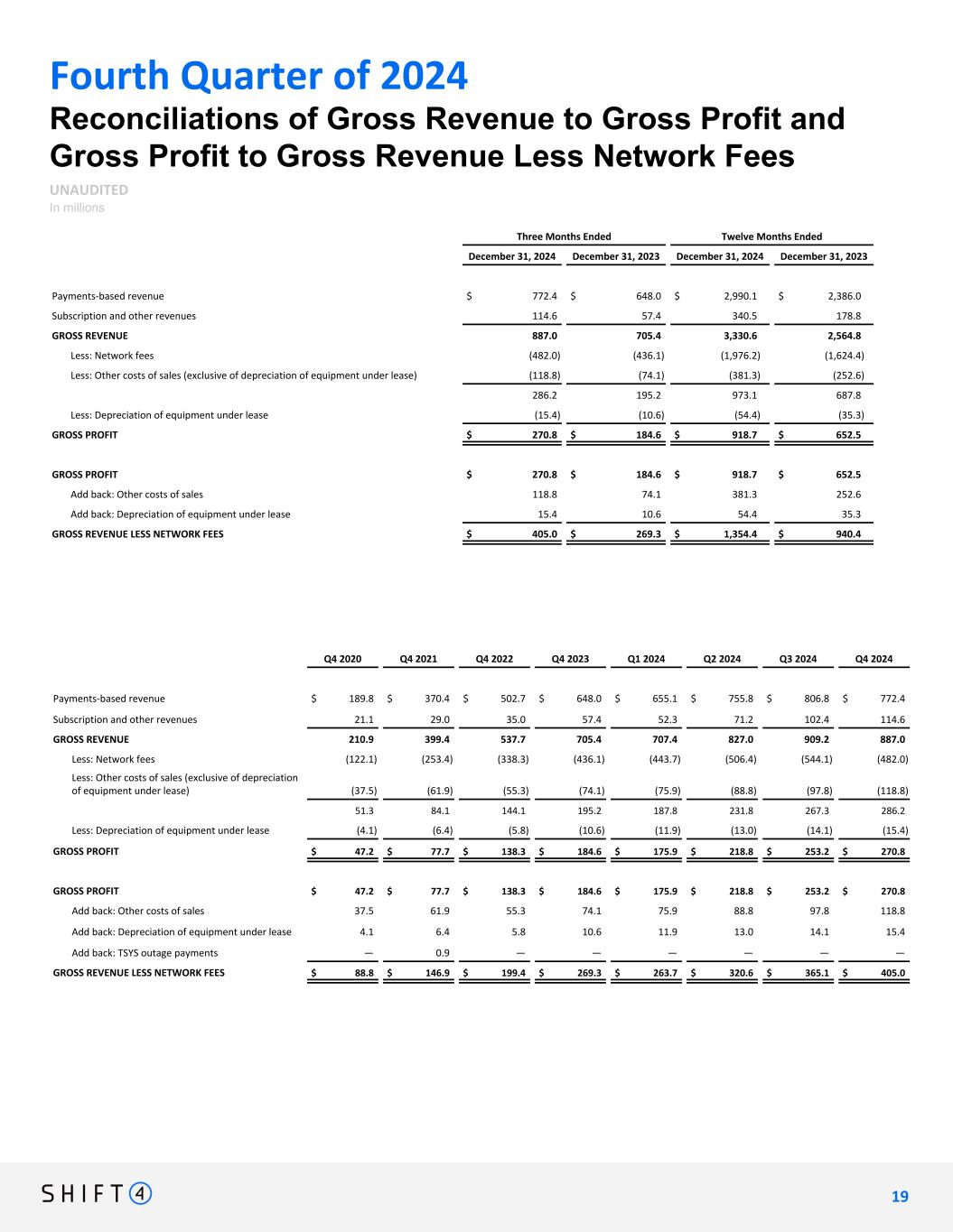 Fourth Quarter of 2024 Reconciliations of Gross Revenue to Gross Profit and Gross Profit to Gross Revenue Less Network Fees UNAUDITED In millions Three Months Ended Twelve Months Ended December 31, 2024 December 31, 2023 December 31, 2024 December 31, 2023 Payments-based revenue $ 772.4 $ 648.0 $ 2,990.1 $ 2,386.0 Subscription and other revenues 114.6 57.4 340.5 178.8 GROSS REVENUE 887.0 705.4 3,330.6 2,564.8 Less: Network fees (482.0) (436.1) (1,976.2) (1,624.4) Less: Other costs of sales (exclusive of depreciation of equipment under lease) (118.8) (74.1) (381.3) (252.6) 286.2 195.2 973.1 687.8 Less: Depreciation of equipment under lease (15.4) (10.6) (54.4) (35.3) GROSS PROFIT $ 270.8 $ 184.6 $ 918.7 $ 652.5 GROSS PROFIT $ 270.8 $ 184.6 $ 918.7 $ 652.5 Add back: Other costs of sales 118.8 74.1 381.3 252.6 Add back: Depreciation of equipment under lease 15.4 10.6 54.4 35.3 GROSS REVENUE LESS NETWORK FEES $ 405.0 $ 269.3 $ 1,354.4 $ 940.4 Q4 2020 Q4 2021 Q4 2022 Q4 2023 Q1 2024 Q2 2024 Q3 2024 Q4 2024 Payments-based revenue $ 189.8 $ 370.4 $ 502.7 $ 648.0 $ 655.1 $ 755.8 $ 806.8 $ 772.4 Subscription and other revenues 21.1 29.0 35.0 57.4 52.3 71.2 102.4 114.6 GROSS REVENUE 210.9 399.4 537.7 705.4 707.4 827.0 909.2 887.0 Less: Network fees (122.1) (253.4) (338.3) (436.1) (443.7) (506.4) (544.1) (482.0) Less: Other costs of sales (exclusive of depreciation of equipment under lease) (37.5) (61.9) (55.3) (74.1) (75.9) (88.8) (97.8) (118.8) 51.3 84.1 144.1 195.2 187.8 231.8 267.3 286.2 Less: Depreciation of equipment under lease (4.1) (6.4) (5.8) (10.6) (11.9) (13.0) (14.1) (15.4) GROSS PROFIT $ 47.2 $ 77.7 $ 138.3 $ 184.6 $ 175.9 $ 218.8 $ 253.2 $ 270.8 GROSS PROFIT $ 47.2 $ 77.7 $ 138.3 $ 184.6 $ 175.9 $ 218.8 $ 253.2 $ 270.8 Add back: Other costs of sales 37.5 61.9 55.3 74.1 75.9 88.8 97.8 118.8 Add back: Depreciation of equipment under lease 4.1 6.4 5.8 10.6 11.9 13.0 14.1 15.4 Add back: TSYS outage payments — 0.9 — — — — — — GROSS REVENUE LESS NETWORK FEES $ 88.8 $ 146.9 $ 199.4 $ 269.3 $ 263.7 $ 320.6 $ 365.1 $ 405.0 1 9 19