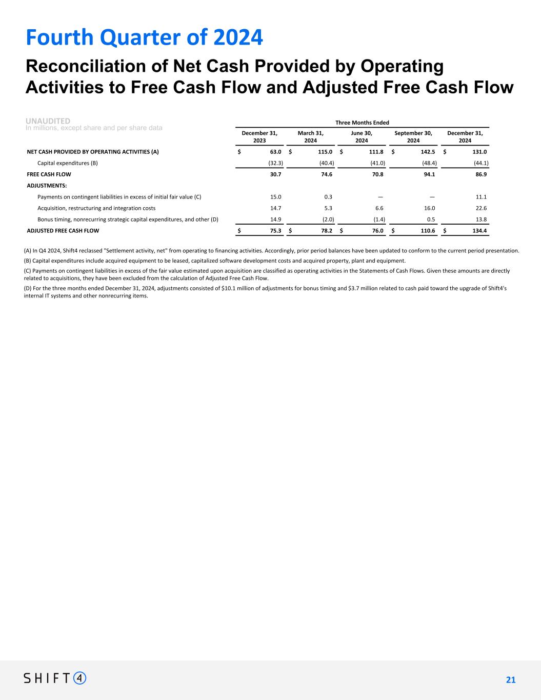 Three Months Ended December 31, 2023 March 31, 2024 June 30, 2024 September 30, 2024 December 31, 2024 NET CASH PROVIDED BY OPERATING ACTIVITIES (A) $ 63.0 $ 115.0 $ 111.8 $ 142.5 $ 131.0 Capital expenditures (B) (32.3) (40.4) (41.0) (48.4) (44.1) FREE CASH FLOW 30.7 74.6 70.8 94.1 86.9 ADJUSTMENTS: Payments on contingent liabilities in excess of initial fair value (C) 15.0 0.3 — — 11.1 Acquisition, restructuring and integration costs 14.7 5.3 6.6 16.0 22.6 Bonus timing, nonrecurring strategic capital expenditures, and other (D) 14.9 (2.0) (1.4) 0.5 13.8 ADJUSTED FREE CASH FLOW $ 75.3 $ 78.2 $ 76.0 $ 110.6 $ 134.4 Reconciliation of Net Cash Provided by Operating Activities to Free Cash Flow and Adjusted Free Cash Flow UNAUDITED In millions, except share and per share data Fourth Quarter of 2024 (A) In Q4 2024, Shift4 reclassed "Settlement activity, net" from operating to financing activities. Accordingly, prior period balances have been updated to conform to the current period presentation. (B) Capital expenditures include acquired equipment to be leased, capitalized software development costs and acquired property, plant and equipment. (C) Payments on contingent liabilities in excess of the fair value estimated upon acquisition are classified as operating activities in the Statements of Cash Flows. Given these amounts are directly related to acquisitions, they have been excluded from the calculation of Adjusted Free Cash Flow. (D) For the three months ended December 31, 2024, adjustments consisted of $10.1 million of adjustments for bonus timing and $3.7 million related to cash paid toward the upgrade of Shift4's internal IT systems and other nonrecurring items. 2 1 21