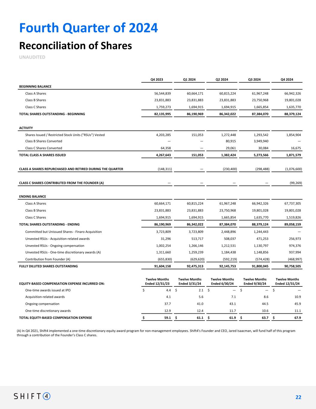 Fourth Quarter of 2024 Reconciliation of Shares UNAUDITED Q4 2023 Q1 2024 Q2 2024 Q3 2024 Q4 2024 BEGINNING BALANCE Class A Shares 56,544,839 60,664,171 60,815,224 61,967,248 66,942,326 Class B Shares 23,831,883 23,831,883 23,831,883 23,750,968 19,801,028 Class C Shares 1,759,273 1,694,915 1,694,915 1,665,854 1,635,770 TOTAL SHARES OUTSTANDING - BEGINNING 82,135,995 86,190,969 86,342,022 87,384,070 88,379,124 ACTIVITY Shares Issued / Restricted Stock Units ("RSUs") Vested 4,203,285 151,053 1,272,448 1,293,542 1,854,904 Class B Shares Converted — — 80,915 3,949,940 — Class C Shares Converted 64,358 — 29,061 30,084 16,675 TOTAL CLASS A SHARES ISSUED 4,267,643 151,053 1,382,424 5,273,566 1,871,579 CLASS A SHARES REPURCHASED AND RETIRED DURING THE QUARTER (148,311) — (230,400) (298,488) (1,076,600) CLASS C SHARES CONTRIBUTED FROM THE FOUNDER (A) — — — — (99,269) ENDING BALANCE Class A Shares 60,664,171 60,815,224 61,967,248 66,942,326 67,737,305 Class B Shares 23,831,883 23,831,883 23,750,968 19,801,028 19,801,028 Class C Shares 1,694,915 1,694,915 1,665,854 1,635,770 1,519,826 TOTAL SHARES OUTSTANDING - ENDING 86,190,969 86,342,022 87,384,070 88,379,124 89,058,159 Committed but Unissued Shares - Finaro Acquisition 3,723,809 3,723,809 2,448,896 1,244,443 — Unvested RSUs - Acquisition-related awards 31,296 513,717 508,037 471,253 256,973 Unvested RSUs - Ongoing compensation 1,002,254 1,266,146 1,212,531 1,130,797 974,376 Unvested RSUs - One-time discretionary awards (A) 1,311,660 1,259,239 1,184,438 1,148,856 937,994 Contribution from Founder (A) (655,830) (629,620) (592,219) (574,428) (468,997) FULLY DILUTED SHARES OUTSTANDING 91,604,158 92,475,313 92,145,753 91,800,045 90,758,505 EQUITY-BASED COMPENSATION EXPENSE INCURRED ON: Twelve Months Ended 12/31/23 Twelve Months Ended 3/31/24 Twelve Months Ended 6/30/24 Twelve Months Ended 9/30/24 Twelve Months Ended 12/31/24 One-time awards issued at IPO $ 4.4 $ 2.1 $ — $ — $ — Acquisition-related awards 4.1 5.6 7.1 8.6 10.9 Ongoing compensation 37.7 41.0 43.1 44.5 45.9 One-time discretionary awards 12.9 12.4 11.7 10.6 11.1 TOTAL EQUITY-BASED COMPENSATION EXPENSE $ 59.1 $ 61.1 $ 61.9 $ 63.7 $ 67.9 (A) In Q4 2021, Shift4 implemented a one-time discretionary equity award program for non-management employees. Shift4's Founder and CEO, Jared Isaacman, will fund half of this program through a contribution of the Founder's Class C shares. 2 2 22