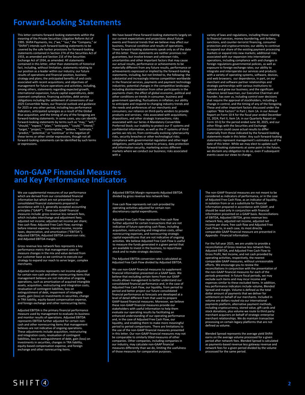Non-GAAP Financial Measures and Key Performance Indicators Forward-Looking Statements We use supplemental measures of our performance which are derived from our consolidated financial information but which are not presented in our consolidated financial statements prepared in accordance with U.S. generally accepted accounting principles ("GAAP"). These non-GAAP financial measures include: gross revenue less network fees, which includes interchange and adjustment fees; adjusted net income; adjusted net income per share; free cash flow; Adjusted Free Cash Flow; earnings before interest expense, interest income, income taxes, depreciation, and amortization (“EBITDA”); Adjusted EBITDA; Adjusted EBITDA conversion rate; and Adjusted EBITDA margin. Gross revenue less network fees represents a key performance metric that management uses to measure changes in the mix and value derived from our customer base as we continue to execute our strategy to expand our reach to serve larger, complex merchants. Adjusted net income represents net income adjusted for certain non-cash and other nonrecurring items that management believes are not indicative of ongoing operations, such as amortization of acquired intangible assets, acquisition, restructuring and integration costs, revaluation of contingent liabilities, loss on extinguishment of debt, impairment of intangible assets, gain (loss) on investments in securities, change in TRA liability, equity-based compensation expense, and foreign exchange and other nonrecurring items. Adjusted EBITDA is the primary financial performance measure used by management to evaluate its business and monitor results of operations. Adjusted EBITDA represents EBITDA further adjusted for certain non- cash and other nonrecurring items that management believes are not indicative of ongoing operations. These adjustments include acquisition, restructuring and integration costs, revaluation of contingent liabilities, loss on extinguishment of debt, gain (loss) on investments in securities, changes in TRA liability, equity-based compensation expense, and foreign exchange and other nonrecurring items. Adjusted EBITDA Margin represents Adjusted EBITDA divided by gross revenue less network fees. Free cash flow represents net cash provided by operating activities adjusted for certain non- discretionary capital expenditures. Adjusted Free Cash Flow represents free cash flow further adjusted for certain transactions that are not indicative of future operating cash flows, including acquisition, restructuring and integration costs, other nonrecurring expenses, and nonrecurring strategic capital expenditures that are not indicative of ongoing activities. We believe Adjusted Free Cash Flow is useful to measure the funds generated in a given period that are available to invest in the business, to repurchase stock and to make strategic decisions. The Adjusted EBITDA conversion rate is calculated as Adjusted Free Cash Flow divided by Adjusted EBITDA. We use non-GAAP financial measures to supplement financial information presented on a GAAP basis. We believe that excluding certain items from our GAAP results allows management to better understand our consolidated financial performance and, in the case of Adjusted Free Cash Flow, our liquidity, from period to period and better project our future consolidated financial performance as forecasts are developed at a level of detail different from that used to prepare GAAP-based financial measures. Moreover, we believe these non-GAAP financial measures provide our stakeholders with useful information to help them evaluate our operating results by facilitating an enhanced understanding of our operating performance and, in the case of Adjusted Free Cash Flow, our liquidity, and enabling them to make more meaningful period to period comparisons. There are limitations to the use of the non-GAAP financial measures presented in this letter. Our non-GAAP financial measures may not be comparable to similarly titled measures of other companies. Other companies, including companies in our industry, may calculate non-GAAP financial measures differently than we do, limiting the usefulness of those measures for comparative purposes. We have based these forward-looking statements largely on our current expectations and projections about future events and financial trends that we believe may affect our business, financial condition and results of operations. These forward-looking statements speak only as of the date of this letter. These statements are neither promises nor guarantees, but involve known and unknown risks, uncertainties and other important factors that may cause our actual results, performance or achievements to be materially different from any future results, performance or achievements expressed or implied by the forward-looking statements, including, but not limited to, the following: the substantial and increasingly intense competition worldwide in the financial services, payments and payment technology industries; potential changes in the competitive landscape, including disintermediation from other participants in the payments chain; the effect of global economic, political and other conditions on trends in consumer, business and government spending; fluctuations in inflation; our ability to anticipate and respond to changing industry trends and the needs and preferences of our merchants and consumers; our reliance on third-party vendors to provide products and services; risks associated with acquisitions; dispositions, and other strategic transactions; risks associated with our Series A Mandatory Convertible Preferred Stock; our inability to protect our IT systems and confidential information, as well as the IT systems of third parties we rely on, from continually evolving cybersecurity risks, security breaches or other technological risks; compliance with governmental regulation and other legal obligations, particularly related to privacy, 