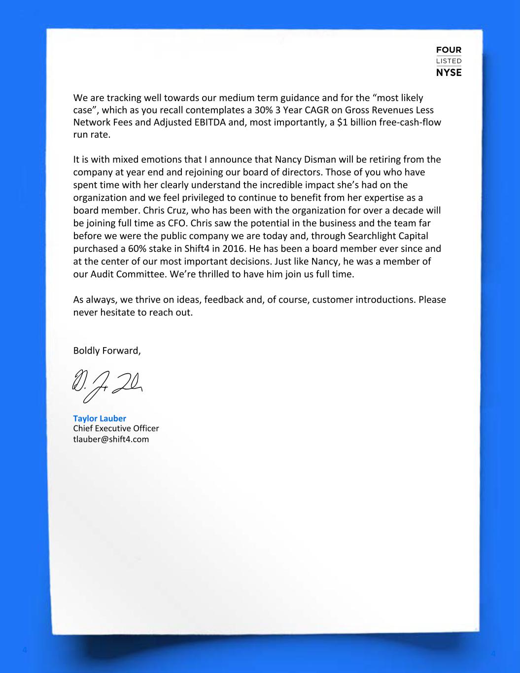 4 4 We are tracking well towards our medium term guidance and for the “most likely case”, which as you recall contemplates a 30% 3 Year CAGR on Gross Revenues Less Network Fees and Adjusted EBITDA and, most importantly, a $1 billion free-cash-flow run rate. It is with mixed emotions that I announce that Nancy Disman will be retiring from the company at year end and rejoining our board of directors. Those of you who have spent time with her clearly understand the incredible impact she’s had on the organization and we feel privileged to continue to benefit from her expertise as a board member. Chris Cruz, who has been with the organization for over a decade will be joining full time as CFO. Chris saw the potential in the business and the team far before we were the public company we are today and, through Searchlight Capital purchased a 60% stake in Shift4 in 2016. He has been a board member ever since and at the center of our most important decisions. Just like Nancy, he was a member of our Audit Committee. We’re thrilled to have him join us full time. As always, we thrive on ideas, feedback and, of course, customer introductions. Please never hesitate to reach out. Boldly Forward, Taylor Lauber Chief Executive Officer tlauber@shift4.com V5 - DRAFTS CIRCULATED VIA EMAIL (WORD DOC)