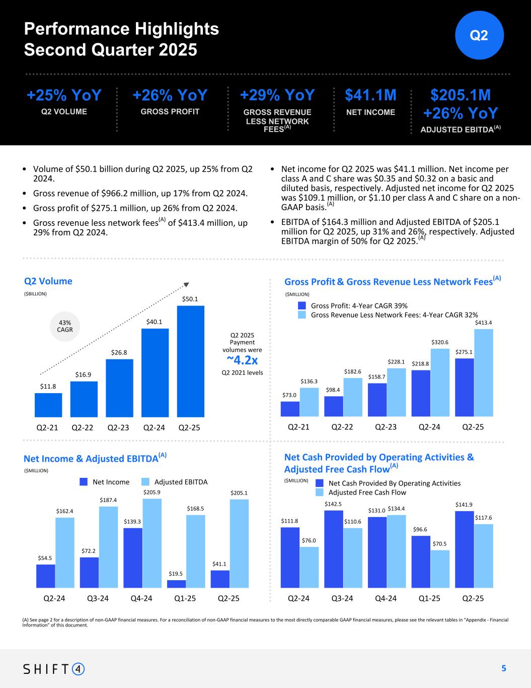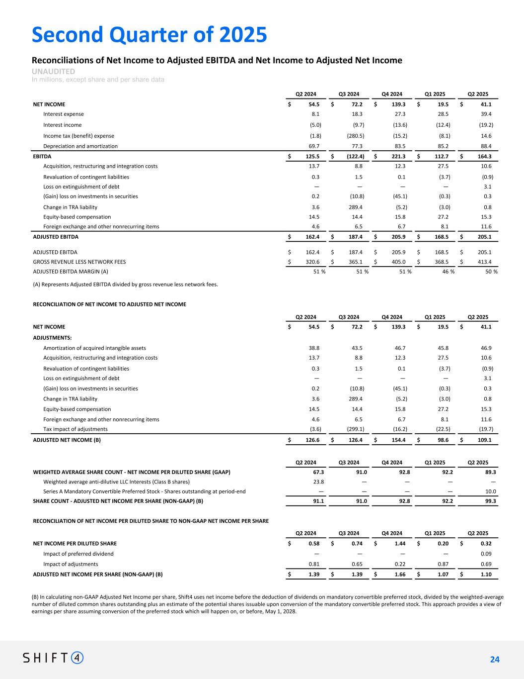 Second Quarter of 2025 Reconciliations of Net Income to Adjusted EBITDA and Net Income to Adjusted Net Income UNAUDITED In millions, except share and per share data Q2 2024 Q3 2024 Q4 2024 Q1 2025 Q2 2025 NET INCOME $ 54.5 $ 72.2 $ 139.3 $ 19.5 $ 41.1 Interest expense 8.1 18.3 27.3 28.5 39.4 Interest income (5.0) (9.7) (13.6) (12.4) (19.2) Income tax (benefit) expense (1.8) (280.5) (15.2) (8.1) 14.6 Depreciation and amortization 69.7 77.3 83.5 85.2 88.4 EBITDA $ 125.5 $ (122.4) $ 221.3 $ 112.7 $ 164.3 Acquisition, restructuring and integration costs 13.7 8.8 12.3 27.5 10.6 Revaluation of contingent liabilities 0.3 1.5 0.1 (3.7) (0.9) Loss on extinguishment of debt — — — — 3.1 (Gain) loss on investments in securities 0.2 (10.8) (45.1) (0.3) 0.3 Change in TRA liability 3.6 289.4 (5.2) (3.0) 0.8 Equity-based compensation 14.5 14.4 15.8 27.2 15.3 Foreign exchange and other nonrecurring items 4.6 6.5 6.7 8.1 11.6 ADJUSTED EBITDA $ 162.4 $ 187.4 $ 205.9 $ 168.5 $ 205.1 ADJUSTED EBITDA $ 162.4 $ 187.4 $ 205.9 $ 168.5 $ 205.1 GROSS REVENUE LESS NETWORK FEES $ 320.6 $ 365.1 $ 405.0 $ 368.5 $ 413.4 ADJUSTED EBITDA MARGIN (A) 51 % 51 % 51 % 46 % 50 % (A) Represents Adjusted EBITDA divided by gross revenue less network fees. RECONCILIATION OF NET INCOME TO ADJUSTED NET INCOME Q2 2024 Q3 2024 Q4 2024 Q1 2025 Q2 2025 NET INCOME $ 54.5 $ 72.2 $ 139.3 $ 19.5 $ 41.1 ADJUSTMENTS: Amortization of acquired intangible assets 38.8 43.5 46.7 45.8 46.9 Acquisition, restructuring and integration costs 13.7 8.8 12.3 27.5 10.6 Revaluation of contingent liabilities 0.3 1.5 0.1 (3.7) (0.9) Loss on extinguishment of debt — — — — 3.1 (Gain) loss on investments in securities 0.2 (10.8) (45.1) (0.3) 0.3 Change in TRA liability 3.6 289.4 (5.2) (3.0) 0.8 Equity-based compensation 14.5 14.4 15.8 27.2 15.3 Foreign exchange and other nonrecurring items 4.6 6.5 6.7 8.1 11.6 Tax impact of adjustments (3.6) (299.1) (16.2) (22.5) (19.7) ADJUSTED NET INCOME (B) $ 126.6 $ 126.4 $ 154.4 $ 98.6 $ 109.1 Q2 2024 Q3 2024 Q4 2024 Q1 2025 Q2 2025 WEIGHTED AVERAGE SHARE COUNT - NET INCOME PER DILUTED SHARE (GAAP) 67.3 91.0 92.8 92.2 89.3 Weighted average anti-dilutive LLC Interests (Class B shares) 23.8 — — — — Series A Mandatory Convertible Preferred Stock - Shares outstanding at period-end — — — — 10.0 SHARE COUNT - ADJUSTED NET INCOME PER SHARE (NON-GAAP) (B) 91.1 91.0 92.8 92.2 99.3 RECONCILIATION OF NET INCOME PER DILUTED SHARE TO NON-GAAP NET INCOME PER SHARE Q2 2024 Q3 2024 Q4 2024 Q1 2025 Q2 2025 NET INCOME PER DILUTED SHARE $ 0.58 $ 0.74 $ 1.44 $ 0.20 $ 0.32 Impact of preferred dividend — — — — 0.09 Impact of adjustments 0.81 0.65 0.22 0.87 0.69 ADJUSTED NET INCOME PER SHARE (NON-GAAP) (B) $ 1.39 $ 1.39 $ 1.66 $ 1.07 $ 1.10 2 4 24 (B) In calculating non-GAAP Adjusted Net Income per share, Shift4 uses net income before the deduction of dividends on mandatory convertible preferred stock, divided by the weighted-average number of diluted common shares outstanding plus an estimate of the potential shares issuable upon conversion of the mandatory convertible preferred stock. This approach provides a view of earnings per share assuming conversion of the preferred stock which will happen on, or before, May 1, 2028.