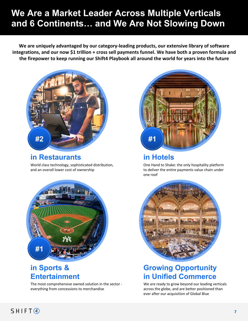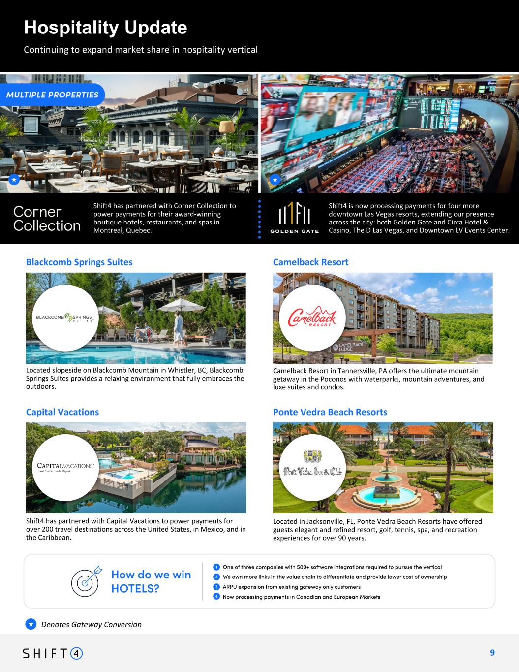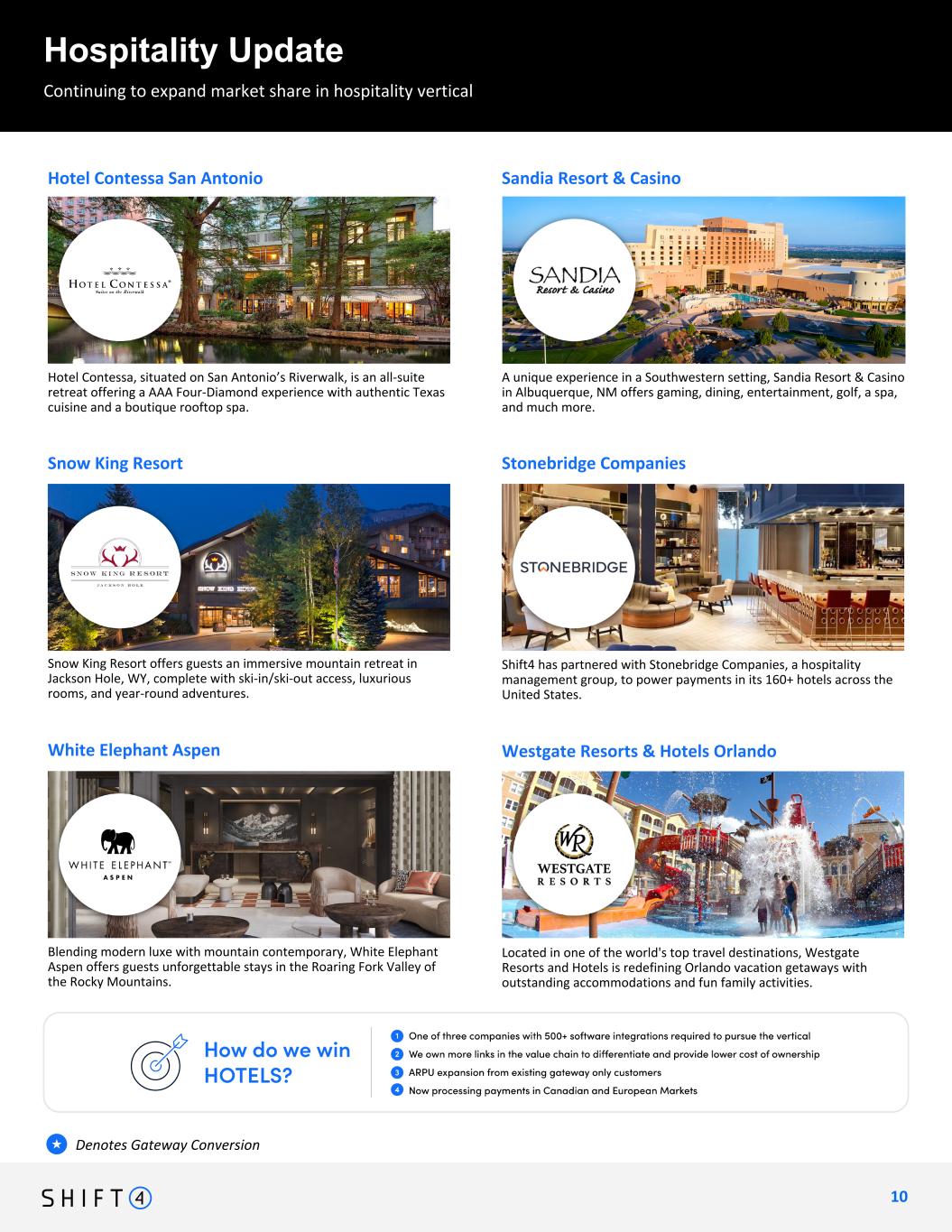 Continuing to expand market share in hospitality vertical Hospitality Update 1 0 10 Continuing to expand arket share in hospitality vertical Denotes Gateway Conversion★ Shift4 has partnered with Stonebridge Companies, a hospitality management group, to power payments in its 160+ hotels across the United States. White Elephant Aspen Located in one of the world's top travel destinations, Westgate Resorts and Hotels is redefining Orlando vacation getaways with outstanding accommodations and fun family activities. Westgate Resorts & Hotels Orlando Snow King Resort offers guests an immersive mountain retreat in Jackson Hole, WY, complete with ski-in/ski-out access, luxurious rooms, and year-round adventures. Stonebridge CompaniesSnow King Resort A unique experience in a Southwestern setting, Sandia Resort & Casino in Albuquerque, NM offers gaming, dining, entertainment, golf, a spa, and much more. Hotel Contessa, situated on San Antonio’s Riverwalk, is an all-suite retreat offering a AAA Four-Diamond experience with authentic Texas cuisine and a boutique rooftop spa. Sandia Resort & CasinoHotel Contessa San Antonio Blending modern luxe with mountain contemporary, White Elephant Aspen offers guests unforgettable stays in the Roaring Fork Valley of the Rocky Mountains.
