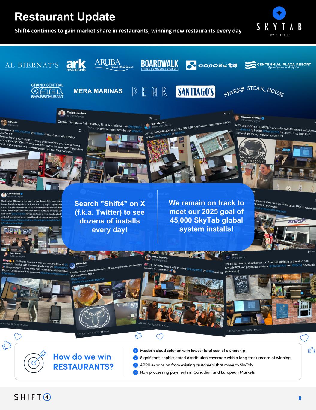 Shift4 continues to gain market share in restaurants, winning new restaurants every day 8 Intended Message: The rollout of SkyTab is accelerating, recent promotions are resonating with merchants who increasingly sensitive to cost Restaurant Update [ADD?]: 2024 Goal: install over 30,000 SKyTab POS systems domestically MERA MARINAS Search "Shift4" on X (f.k.a. Twitter) to see dozens of installs every day! Q2 was a record quarter for SkyTab, with over 10,000 new wins added! Search "Shift4" on X (f.k.a. Twitter) to see dozens of installs every day! We remain on track to meet our 2025 goal of 45,000 SkyTab global system installs!