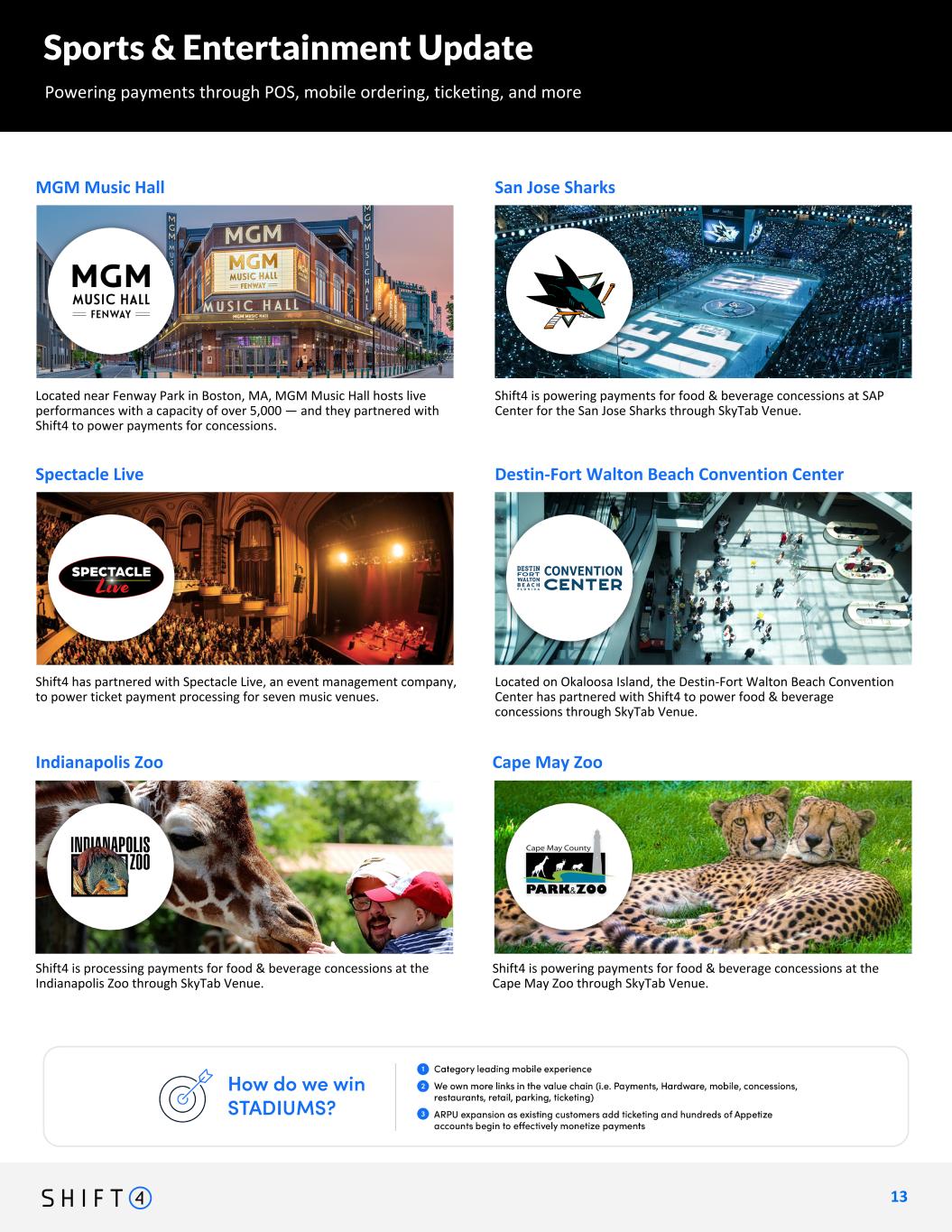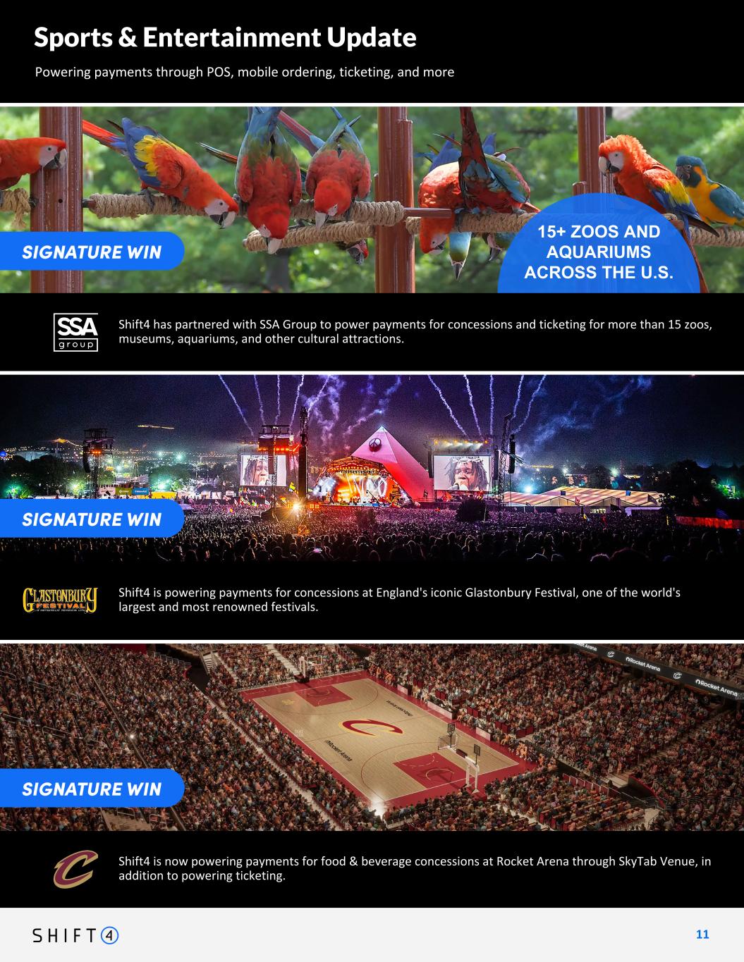 Sports & Entertainment Update Powering payments through POS, mobile ordering, ticketing, and more 1 1 11 15+ ZOOS AND AQUARIUMS ACROSS THE U.S. Shift4 has partnered with SSA Group to power payments for concessions and ticketing for more than 15 zoos, museums, aquariums, and other cultural attractions. 2 new features: glastonbury, rocket arena (cleveland cavaliers) Shift4 is powering payments for concessions at England's iconic Glastonbury Festival, one of the world's largest and most renowned festivals. Shift4 is now powering payments for food & beverage concessions at Rocket Arena through SkyTab Venue, in addition to powering ticketing.