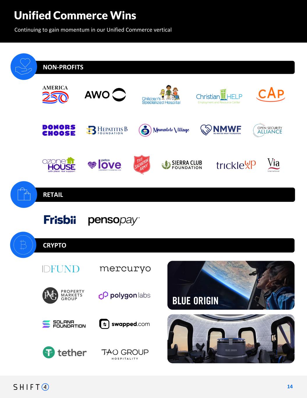 Unified Commerce Wins Continuing to gain momentum in our Unified Commerce vertical 1 4 14 NON-PROFITS CRYPTO GAMING RETAIL We expect to be live in all 24 sportsbook locations by year end Non Profit: Alexander Wildlife Rescue Center - New Deal The Dovetail Project - New Deal Wounded Warriors Family Support - New Deal Center for Human Rights in Iran - New Deal Hope Strengthens Foundation - New Deal RENEW - New Deal Center for Humane Technology - New Deal Asian American Action Fund - New Deal (C4) Tioga Fund - New Deal HeartCry Missionary Society - New Deal CHI Memorial - New Deal Patriot Relief - New Deal World Child Cancer UK - New Center for Climate Integrity - New Deal Upright Africa - New Deal Big Sky Bravery Foundation - New Deal GiveDirectly - New Deal Cancer Research Institute - New Deal Spotlight on Africa - New Deal The Giving Block Foundation - New Deal Norwegian Refugee Council - New Deal Retail: Romantix Mobility City Holdings Worldsprings Becker Furniture Sherman's China Eastern Airlines Crypto: LB Network Cryptobit Transfi Zebedee (ZBD) Bright Technologies HFinance Excurr TRANSPORTATION Salvation Army Australia, Animal Welfare Observatory, Converence Animal Politics, Sierra Club Foundation, America250, Open Security Alliance, DonorsChoose, Hepatitis B Foundation, Teach for America, PetcoLove, Children's Specialized Hospital, No Matter What Foundation, Via International, Mamatoto Village, Trickle Up Program, Ozone House, Christian Help Foundation pensopay, frisbii Tao Group, PMG, ID Funds, Swapped, Mercuryo, Solana Foundation, Tether Payments Group, Polygon Labs Add BYD as a separate section here