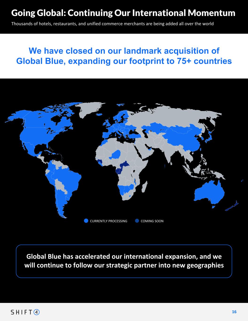 Shift4 continues to move Boldly Forward towards becoming a truly global company 1 6 16 Going Global: Continuing Our International Momentum We have closed on our landmark acquisition of Global Blue, expanding our footprint to 75+ countries Thousands of hotels, restaurants, and unified commerce merchants are being added all over the world UPDATED MAP PAGE Show we are live processing in 6 continents. went live with BYD in Latam as latest proof point of growing unified commerce platform. blue chips are coming to work with us becausee of our geo coverage and balance of card present and CNP + possibly hit curb again WHAT we need to include: -new map (map from investor day + the dark blue countries "coming soon" from this one" -callout with "We have closed on our landmark acquisition of Global Blue, expanding our footprint to 75+ countries" maybe above the map, and then maybe another one below with "Global Blue has accelerated our international expansion, and we will continue to follow our strategic partner into new geographies" CURRENTLY PROCESSING COMING SOON Global Blue has accelerated our international expansion, and we will continue to follow our strategic partner into new geographies