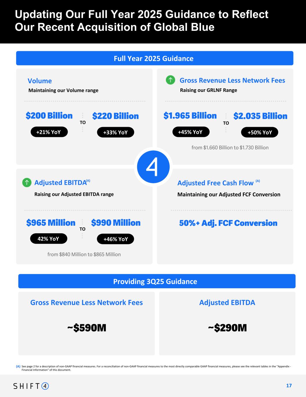 See page 2 for a description of non-GAAP financial measures. For a reconciliation of non-GAAP financial measures to the most directly comparable GAAP financial measures, please see the relevant tables in the "Appendix - Financial Information" of this document. Updating Our Full Year 2025 Guidance to Reflect Our Recent Acquisition of Global Blue 1 7 17 Intended Message: Adjusted for contribution from Finaro/Appetize, we're looking at 31% YoY GRLNF growth in Q4 $1.30 Billion +38% YoY +44% YoY $1.35 BillionGross Revenue Less Network Fees Full Year Adjusted Free Cash Flow $167 Billion +53% YoY +61% YoY $175 Billion Volume $640 Million +39% YoY +47% YoY $675 MillionAdjusted EBITDA TO TO TO FY 2024 Guidance 59%+ Adj. FCF Conversion $200 Billion +21% YoY +33% YoY $220 Billion $1.965 Billion +45% YoY +50% YoY $2.035 Billion TO TO Volume Raising our GRLNF Range Gross Revenue Less Network Fees TO $965 Million 42% YoY +46% YoY $990 Million Raising our Adjusted EBITDA range Adjusted EBITDA Maintaining our Adjusted FCF Conversion Adjusted Free Cash Flow from $840 Million to $865 Million 50%+ Adj. FCF Conversion Maintaining our Volume range from $1.660 Billion to $1.730 Billion Organic revenue remains on track to grow well north of 25% YoY (A) (A) (A) Full Year 2025 Guidance Providing 3Q25 Guidance ~$590M $415 M TO Q2 2025 Gross Revenue Less Network Fees Adjusted EBITDA ~$290M Q2 2025 TBU